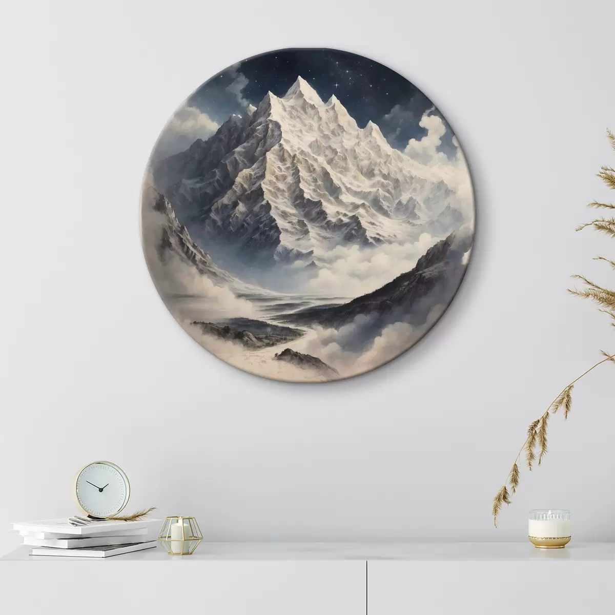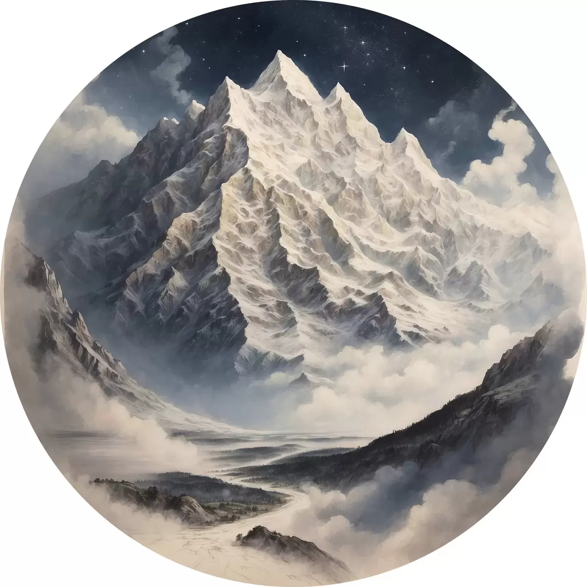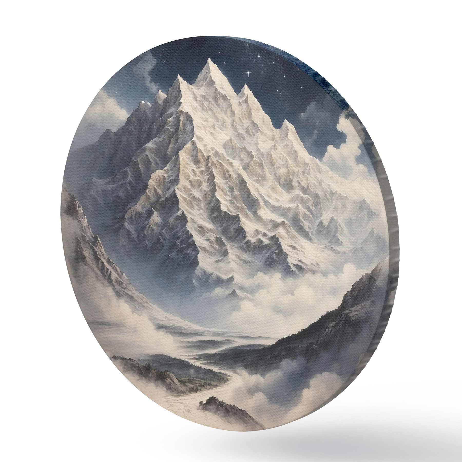 Runde Gemälde Berg mit Wolken und Sternen r38127