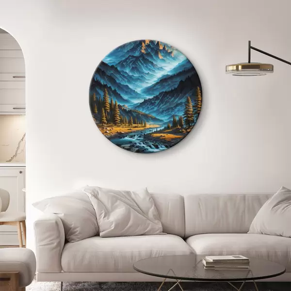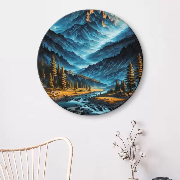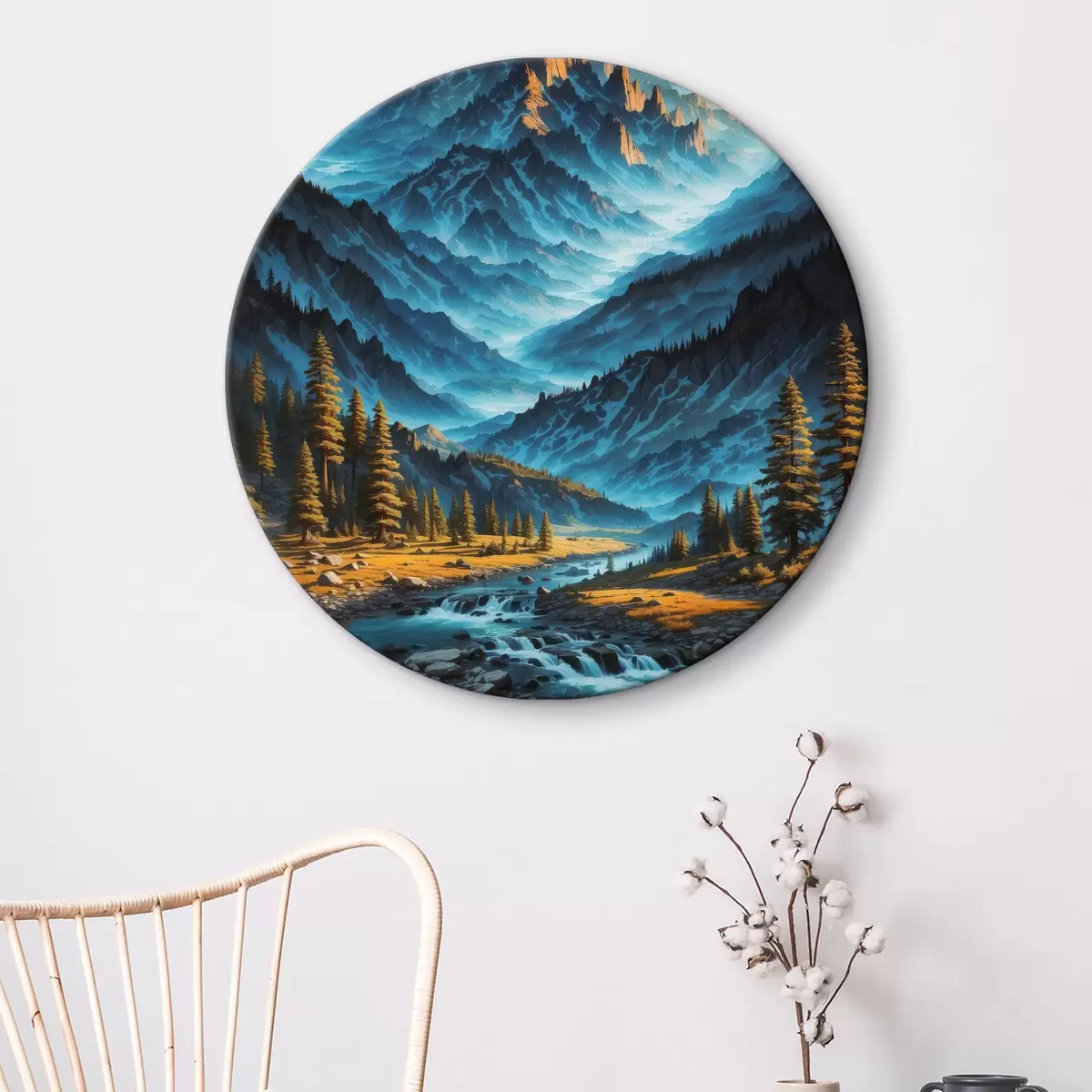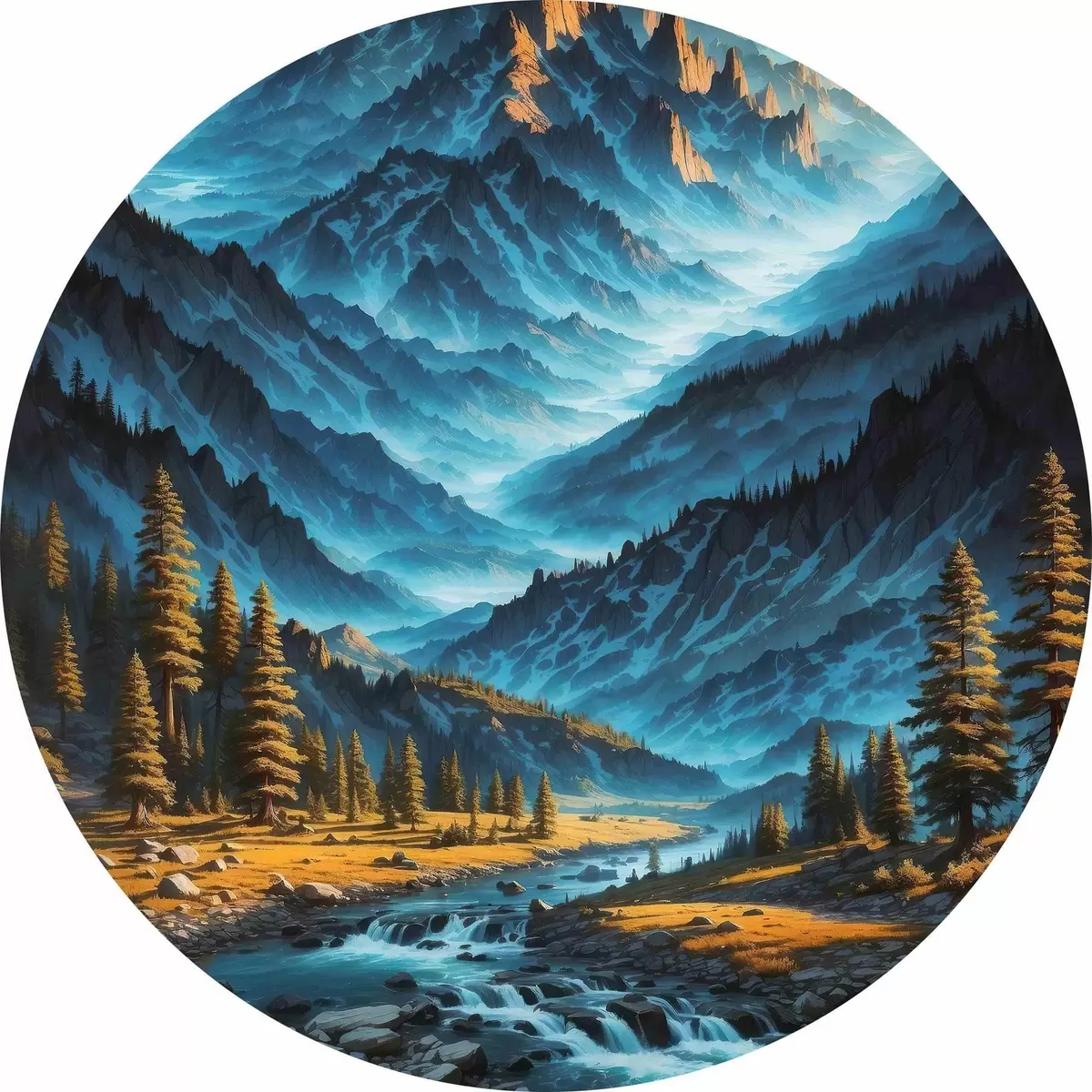 Runde Gemälde Bergkette mit Bäumen und Fluss r38134