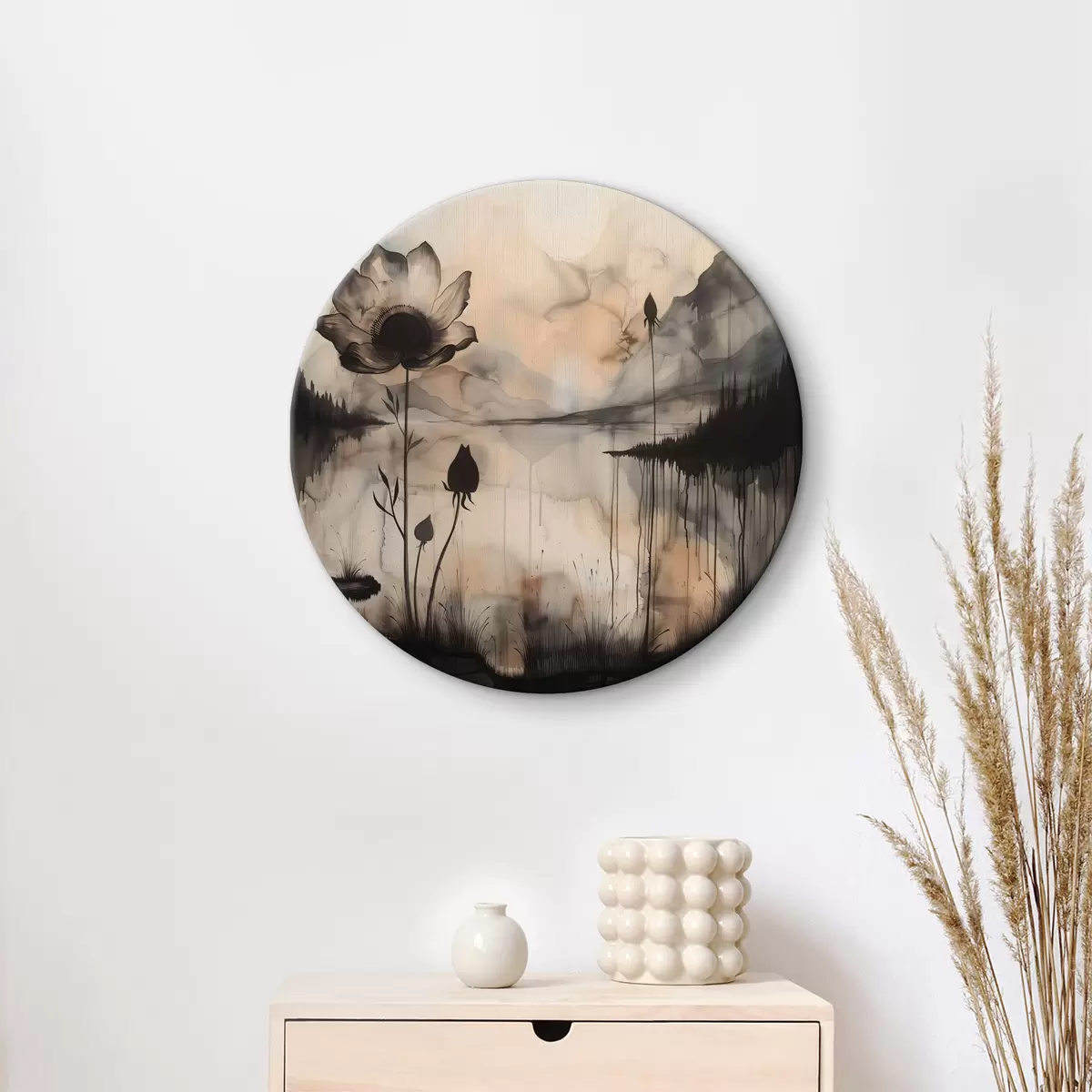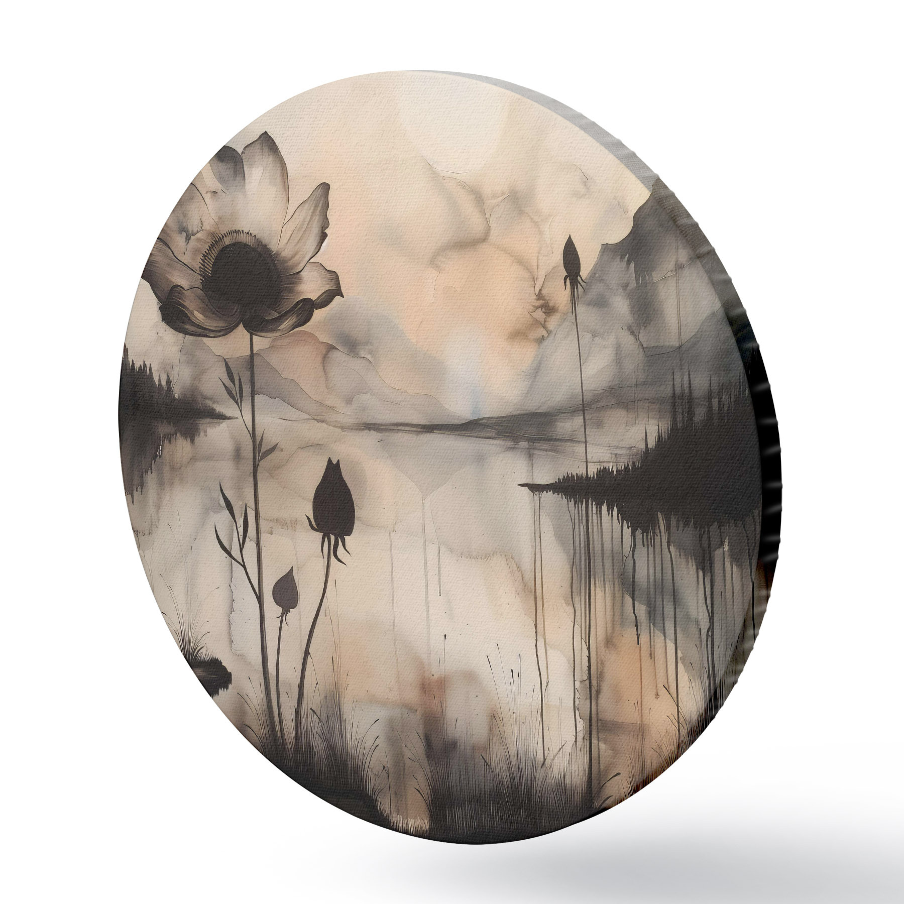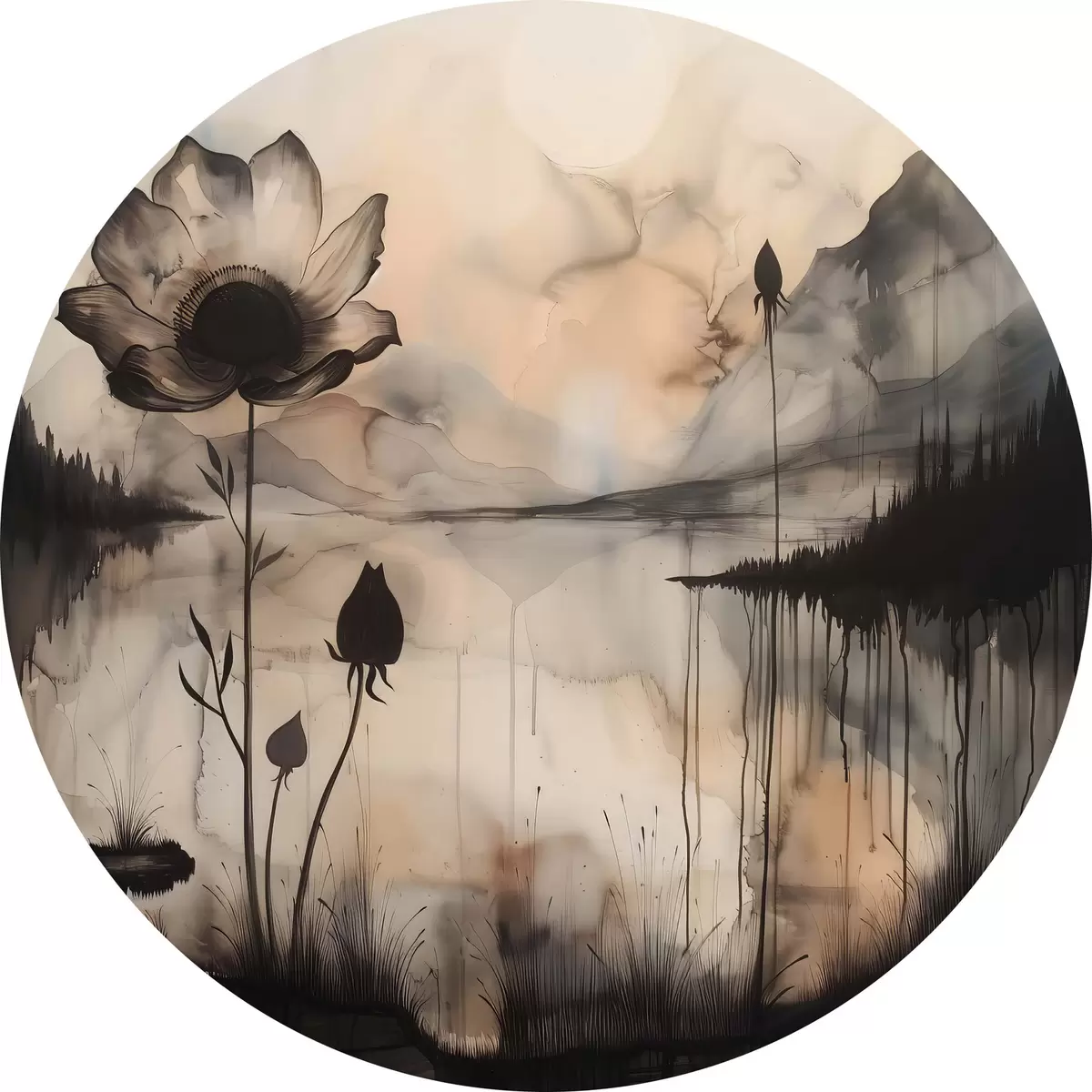 Runde Gemälde Ein Gemälde mit einer Blume und einem See r38161