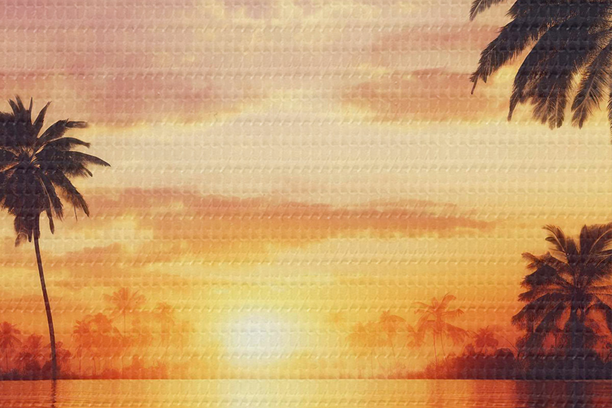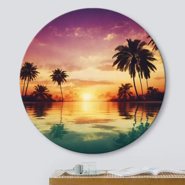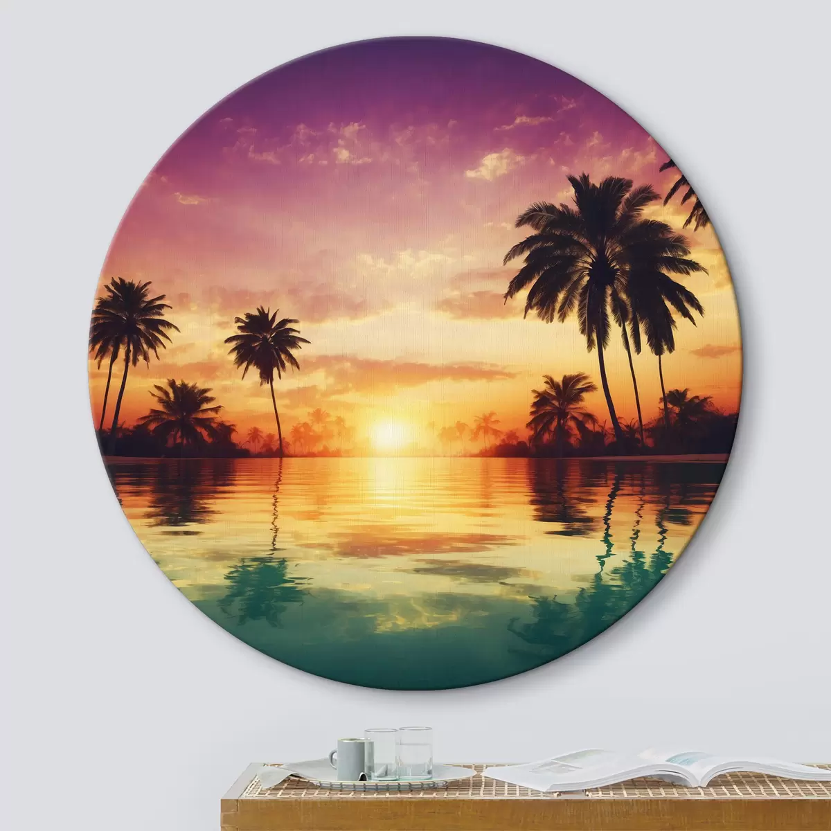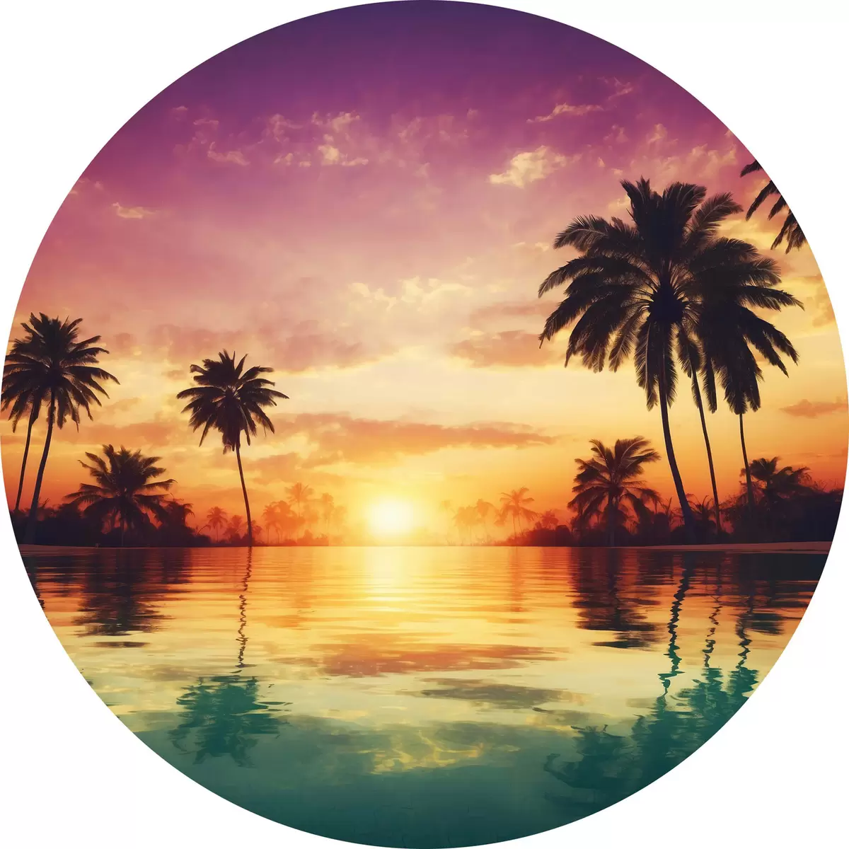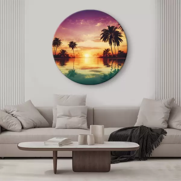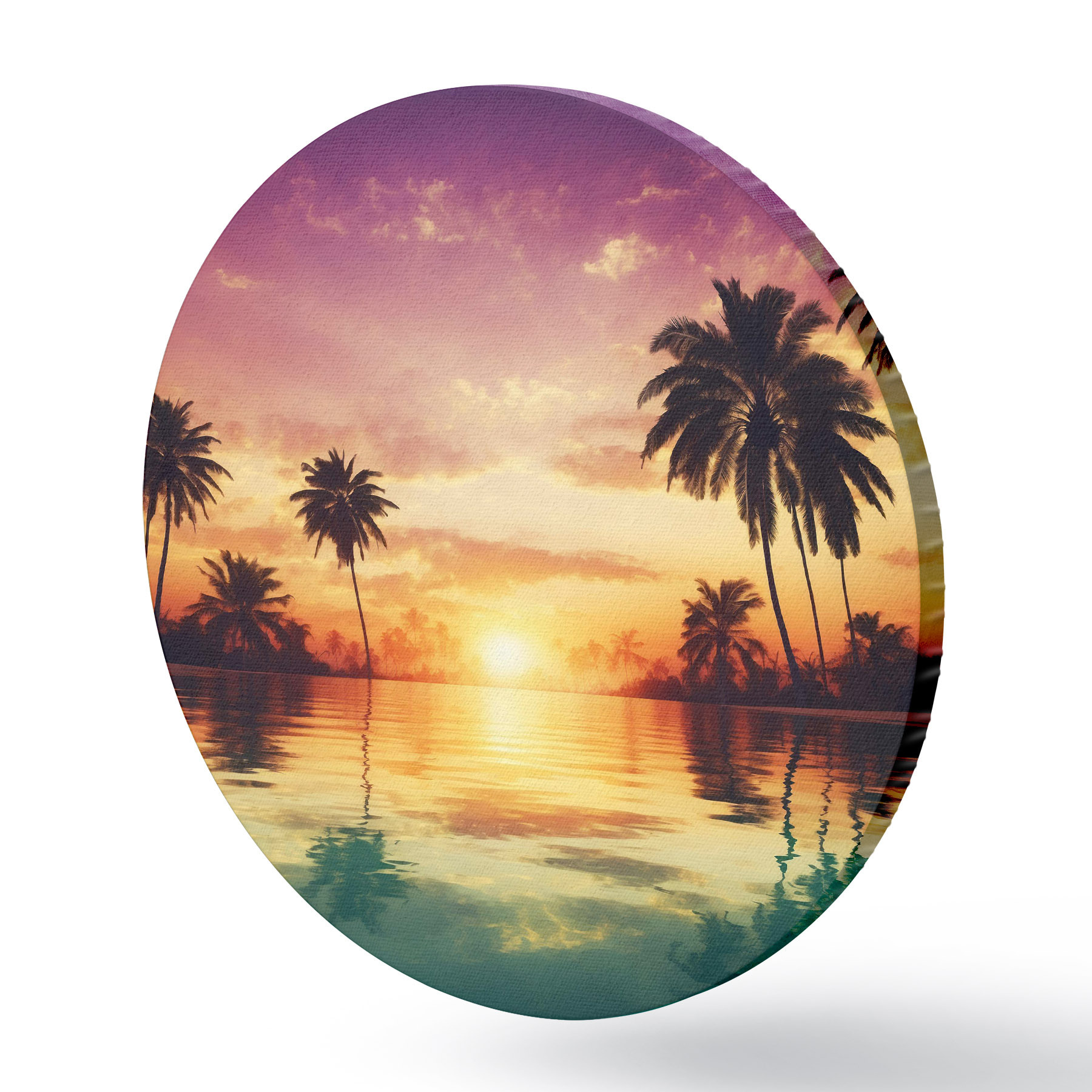 Runde Gemälde Sonnenuntergang über einem Stausee mit Palmen r38183