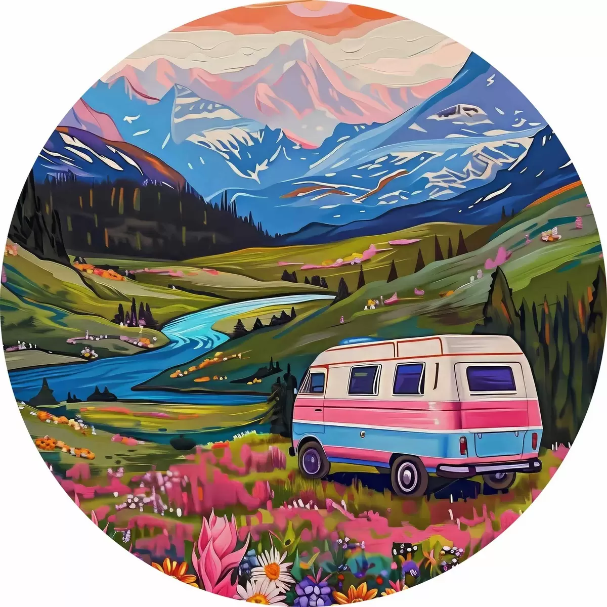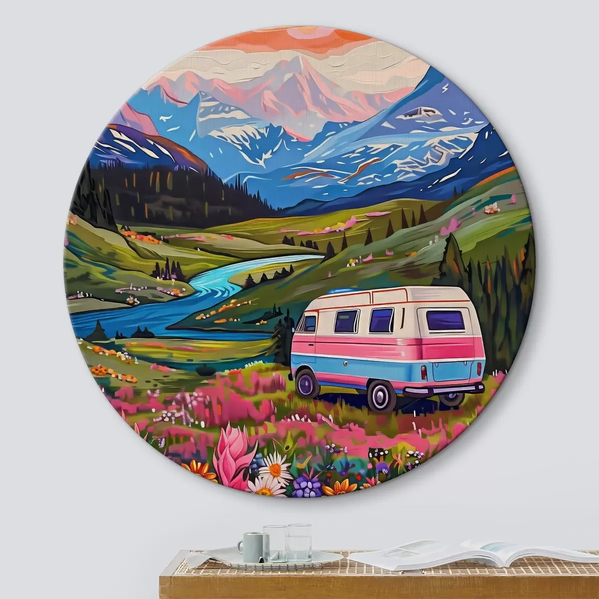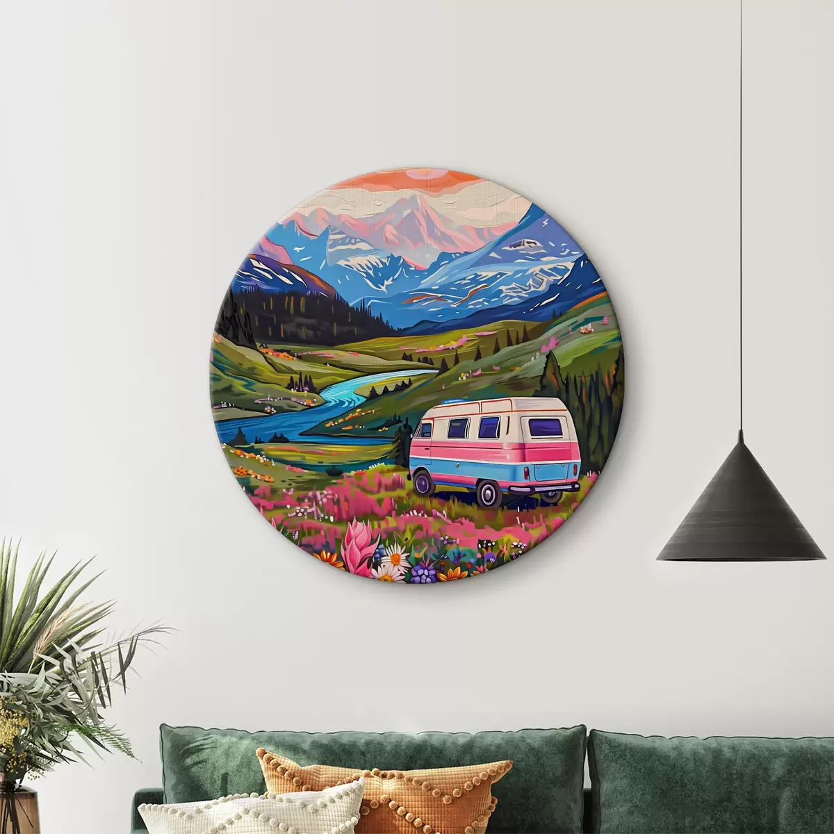 Runde Gemälde Ein Lieferwagen fährt durch ein Tal mit Blumen und Bergen r38259