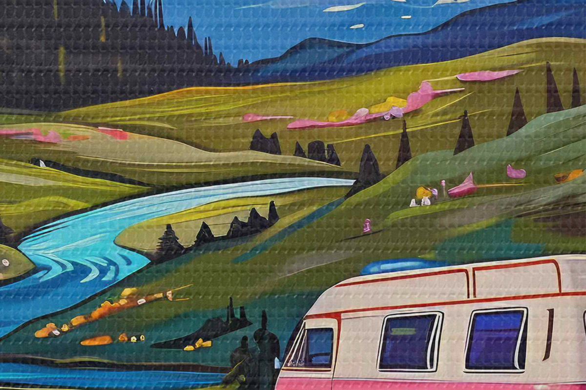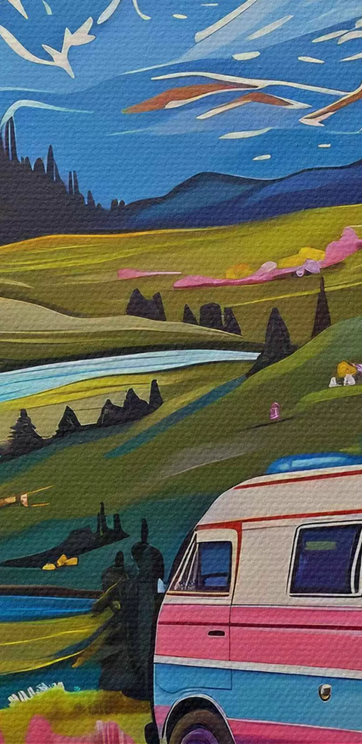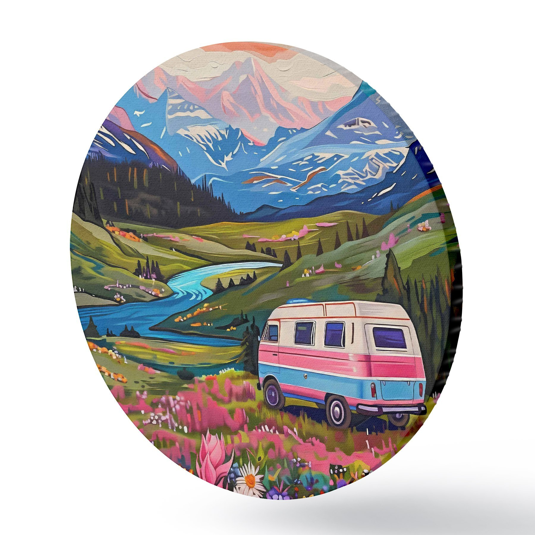 Runde Gemälde Ein Lieferwagen fährt durch ein Tal mit Blumen und Bergen r38259