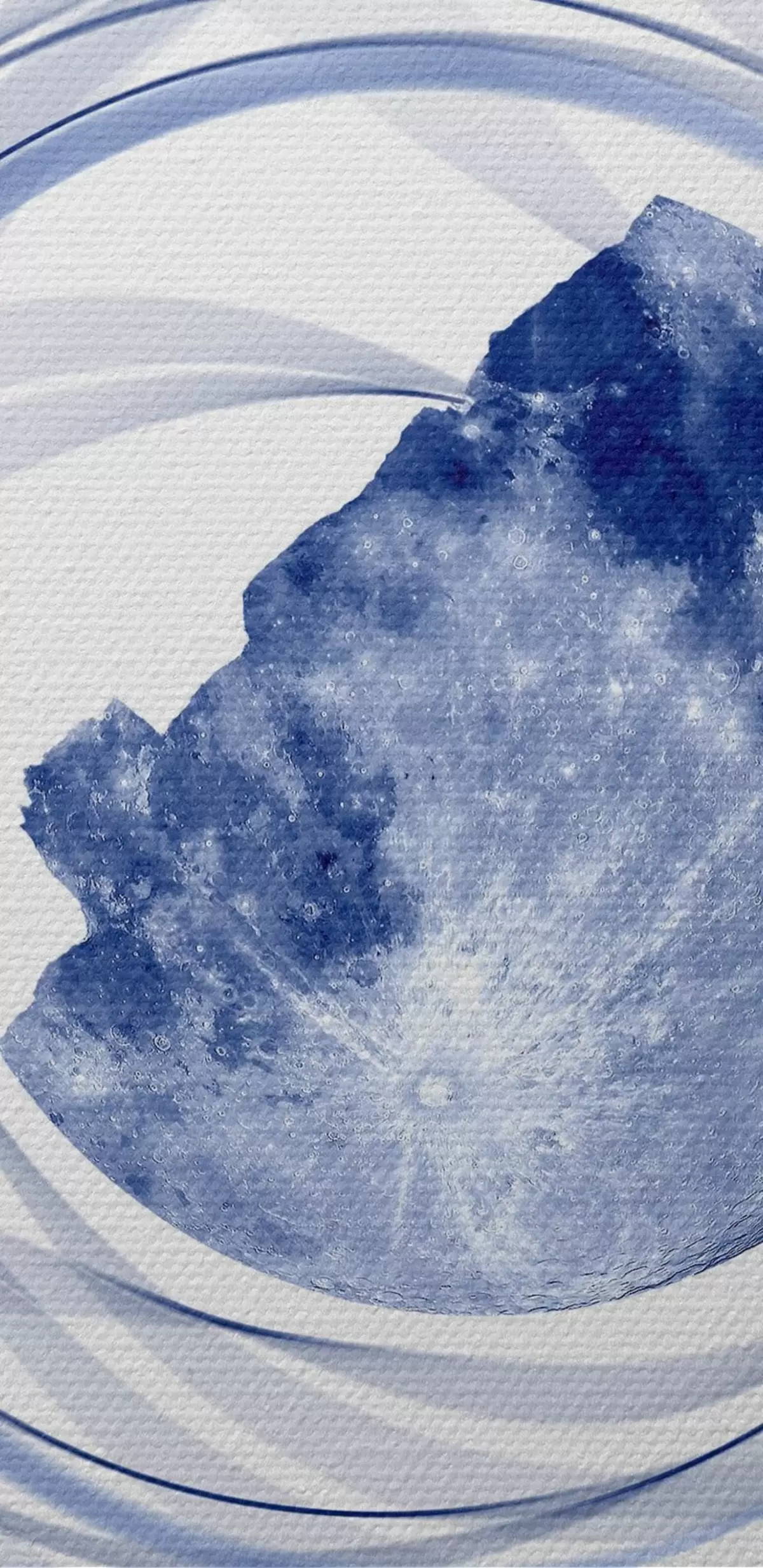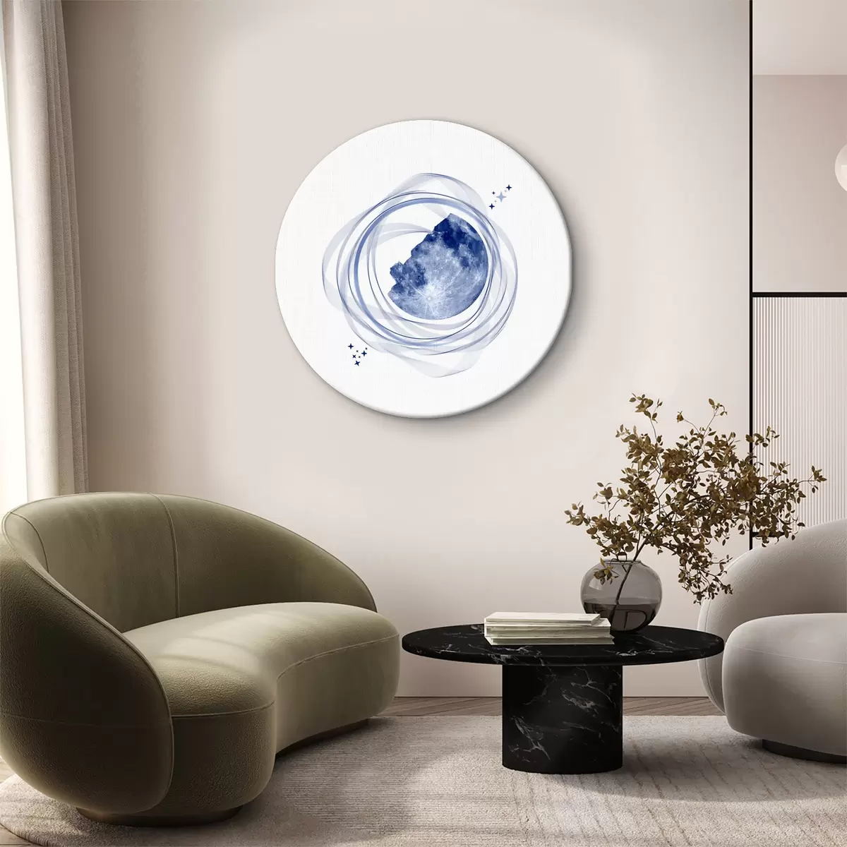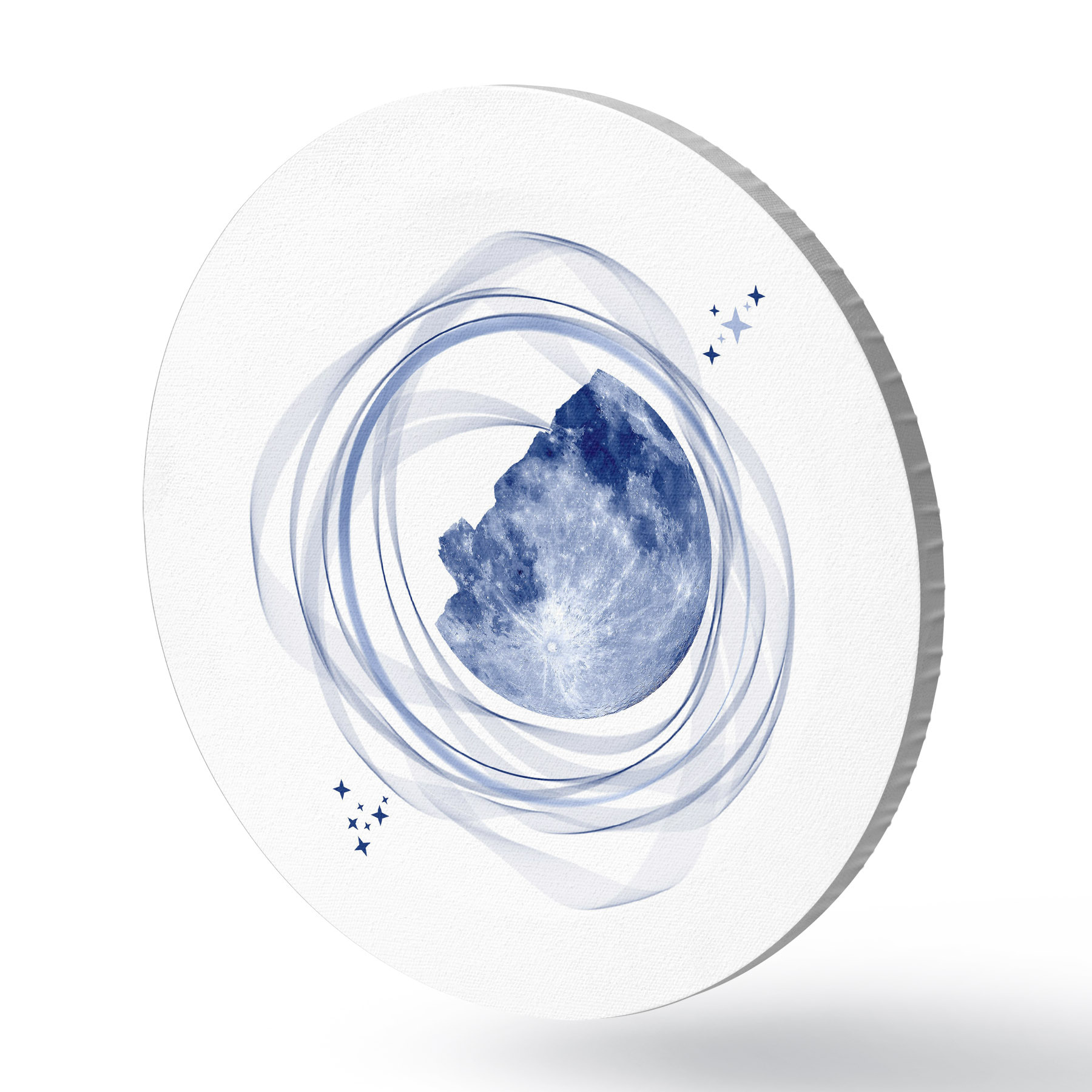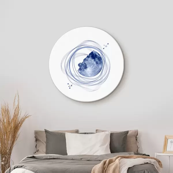 Runde Gemälde Mondumlaufbahn, Halbmond, Minimalismus, Raum, Zeit, geschwungene verschwommene Linien, Sterne, Galaxie, blaue Farbe r38280