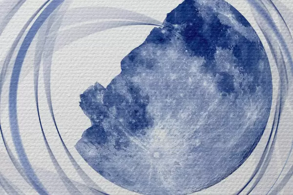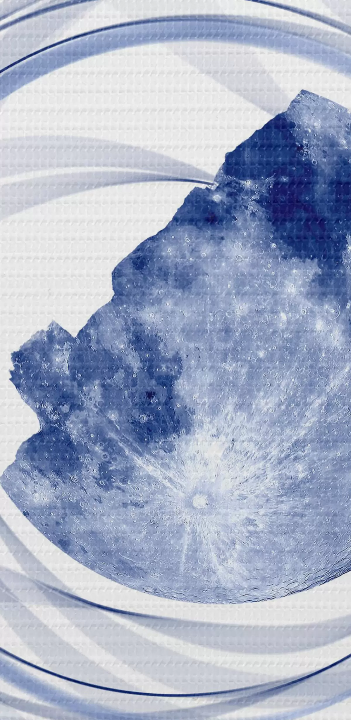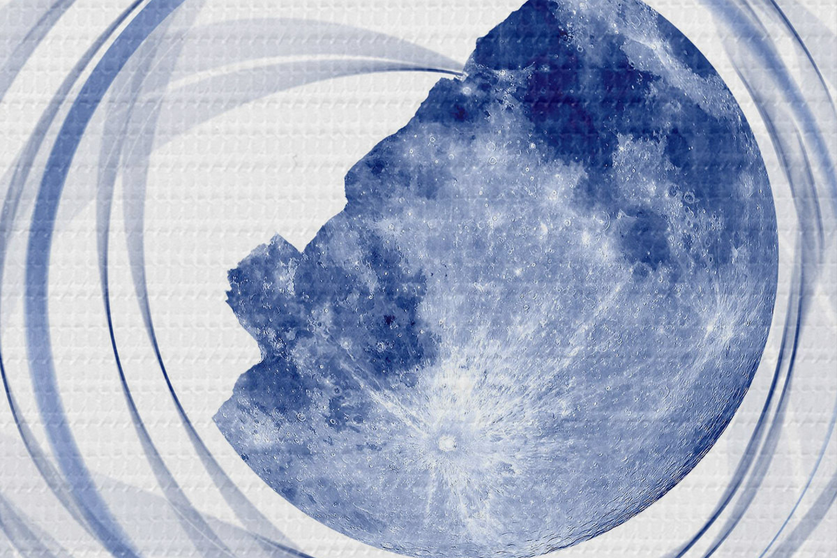 Bild Mondumlaufbahn, Halbmond, Minimalismus, Raum, Zeit, geschwungene verschwommene Linien, Sterne, Galaxie, blaue Farbe Nr r38280