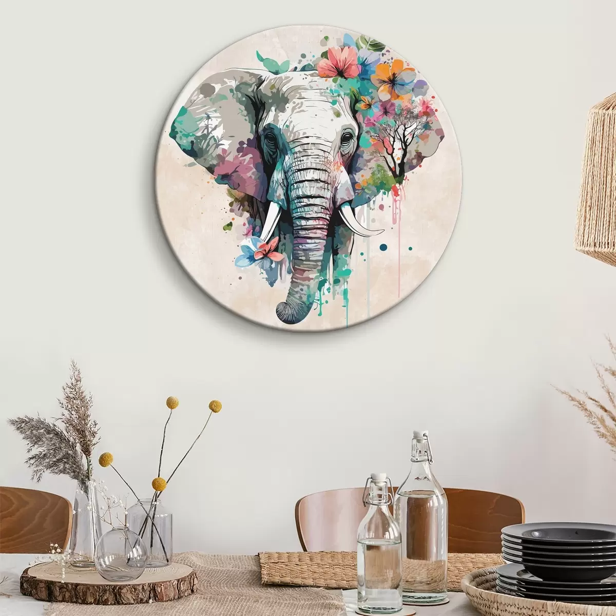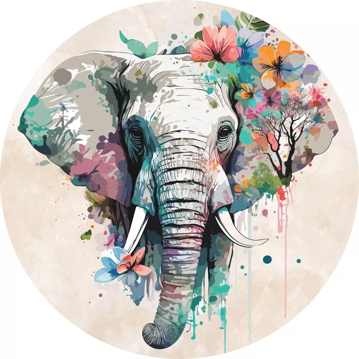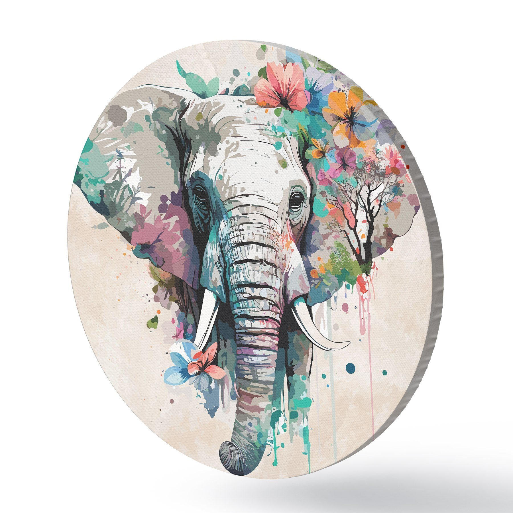 Runde Gemälde Elefant in Blumen, Farbflecken r38333