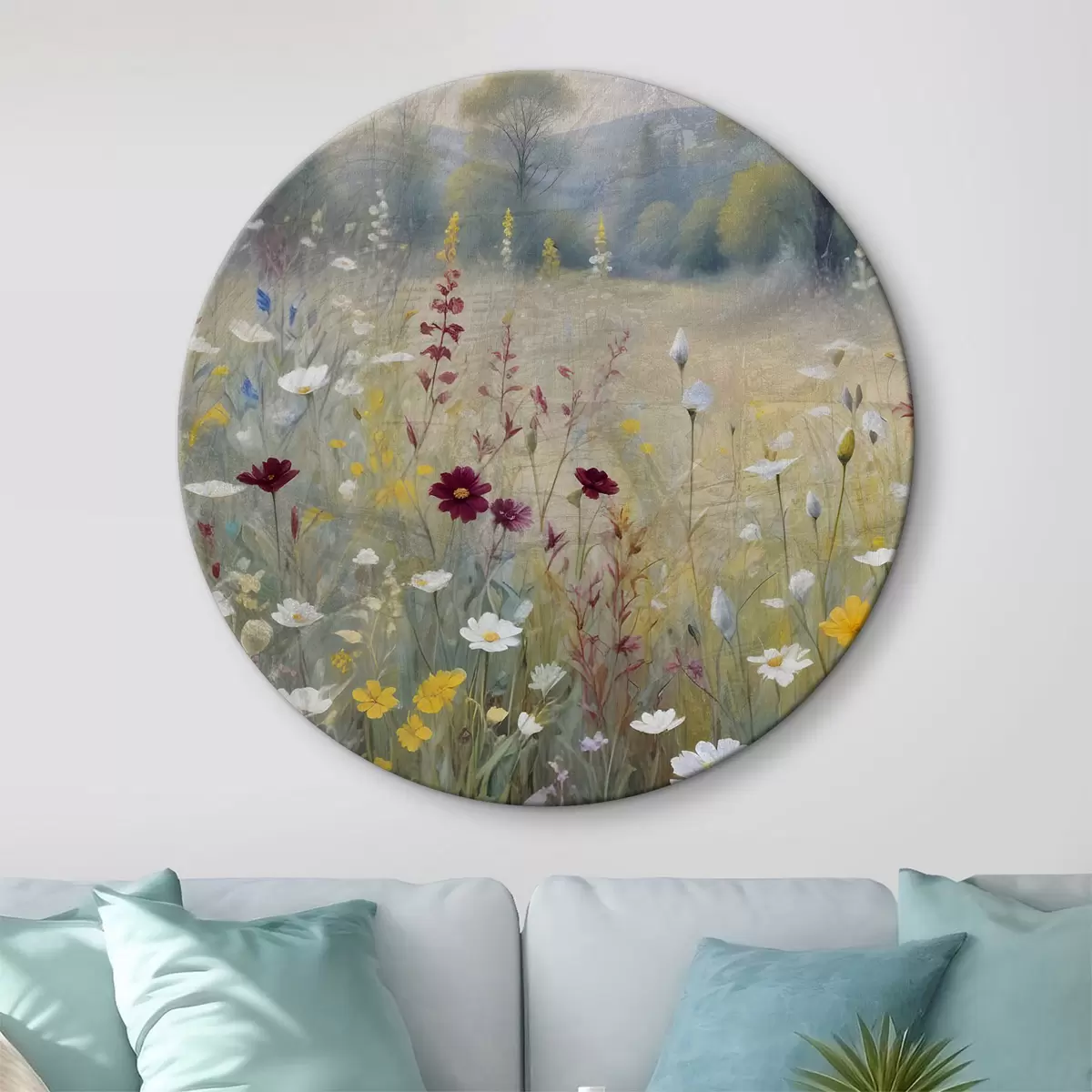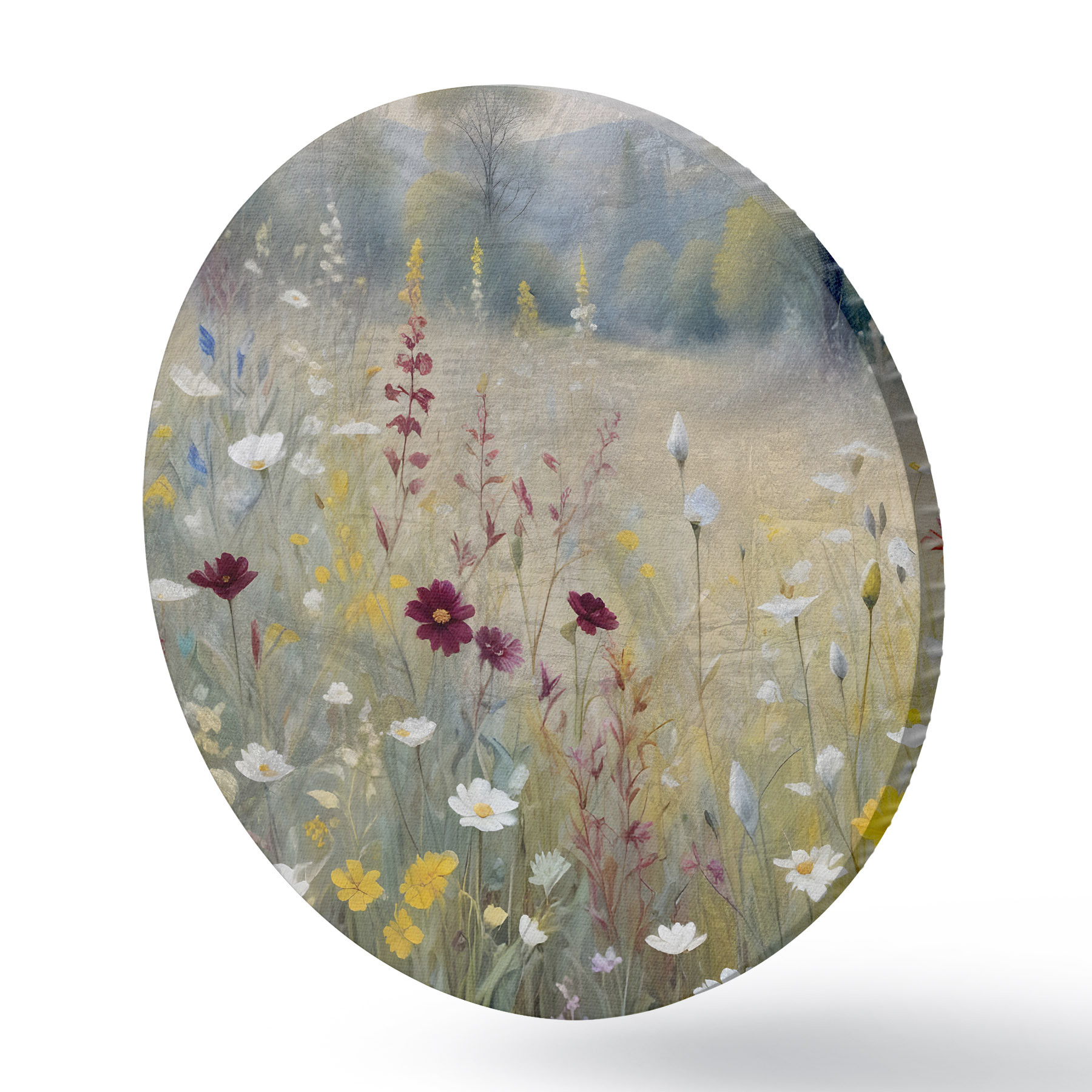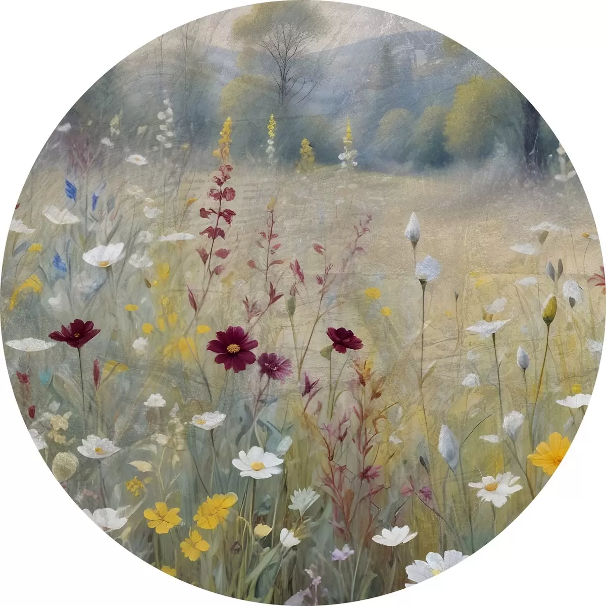 Runde Gemälde Eine bunte Wiese mit Wildblumen mit einem verschwommenen Wald im Hintergrund r38368