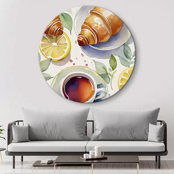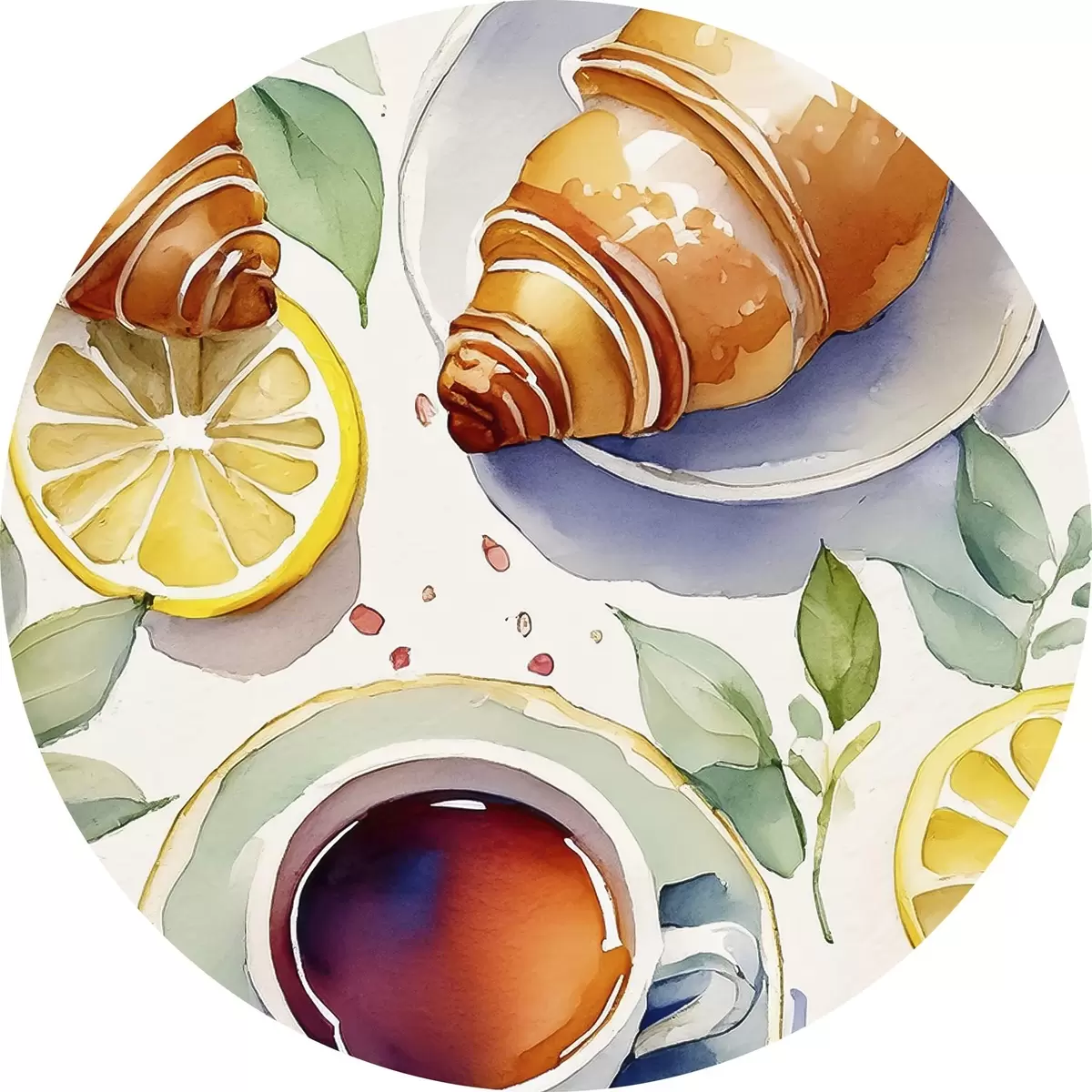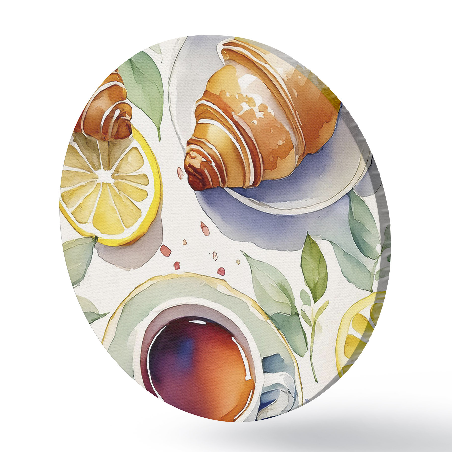Runde Gemälde Croissant Aquarell, Tasse Tee, Frühstück, Zitronen, rustikaler Stil r38389