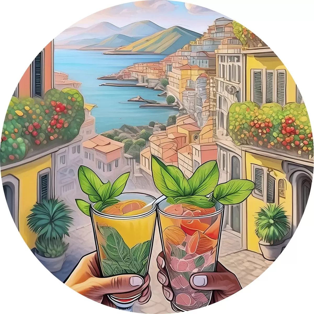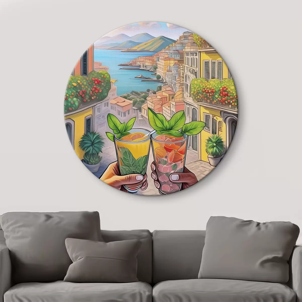 Runde Gemälde Italienische Stadt, Meeresküste, Cocktails, Berufung, Architektur, Sommer, Aquarell r38392
