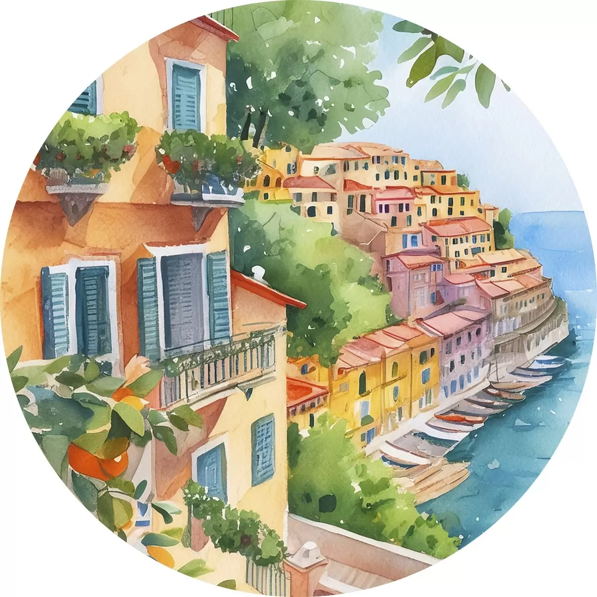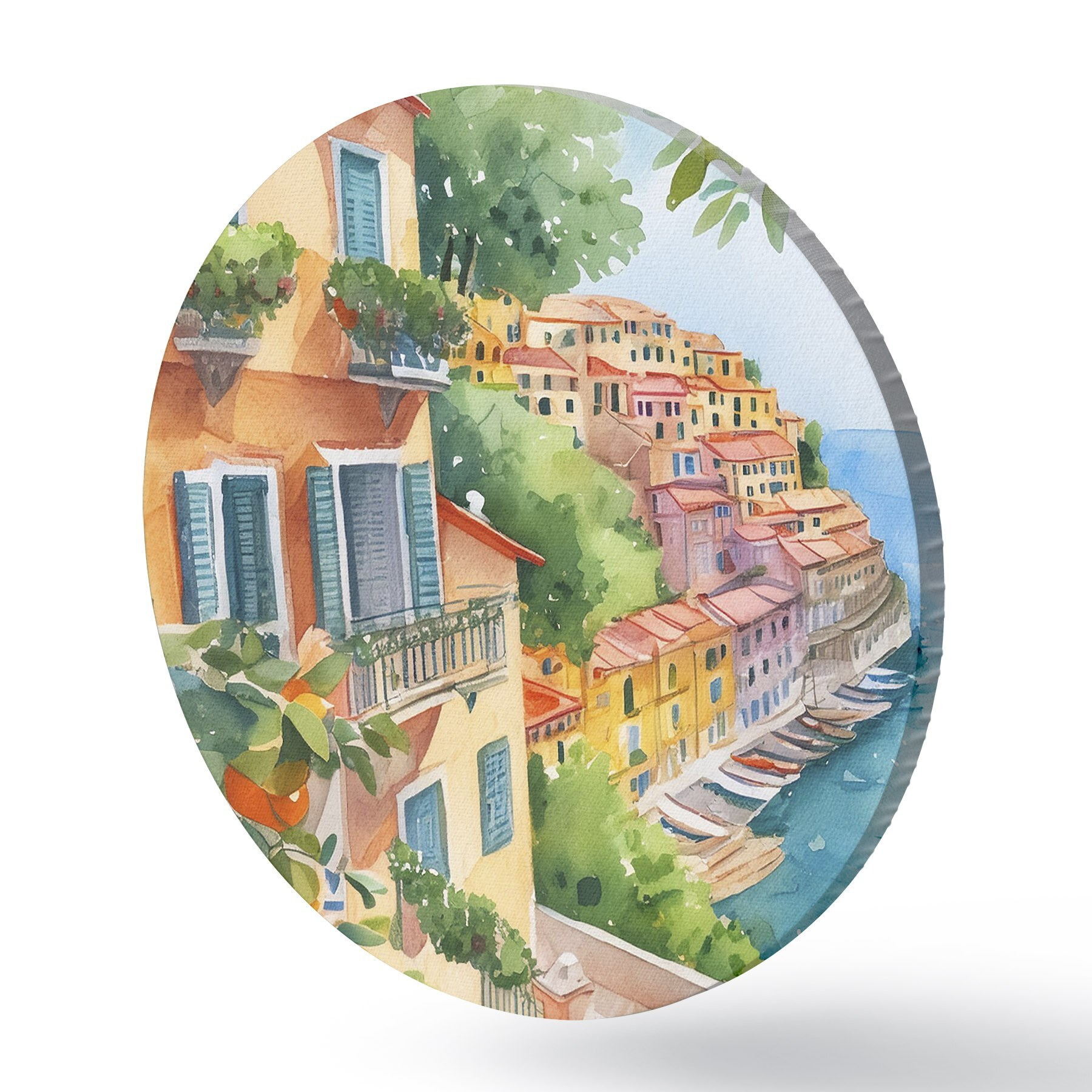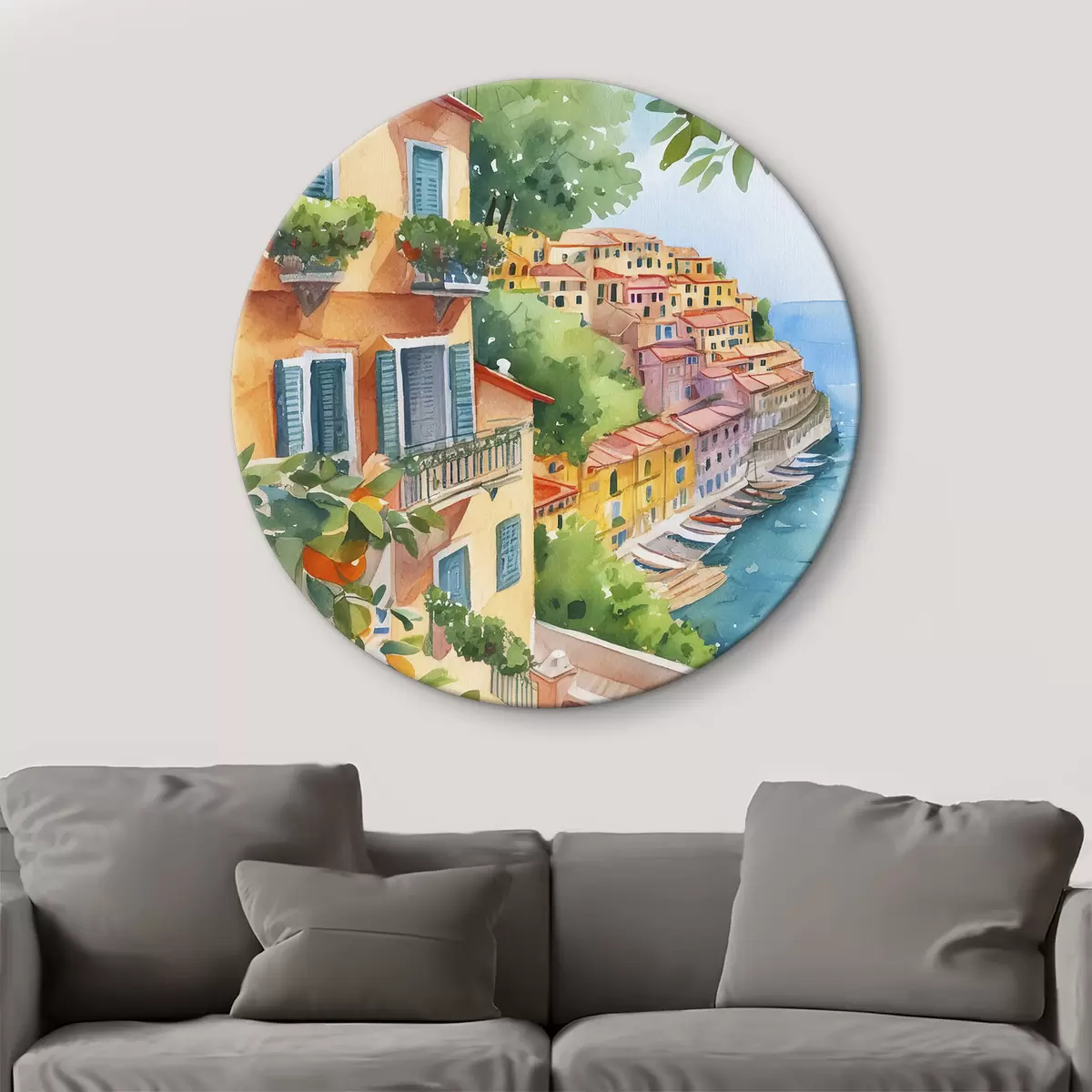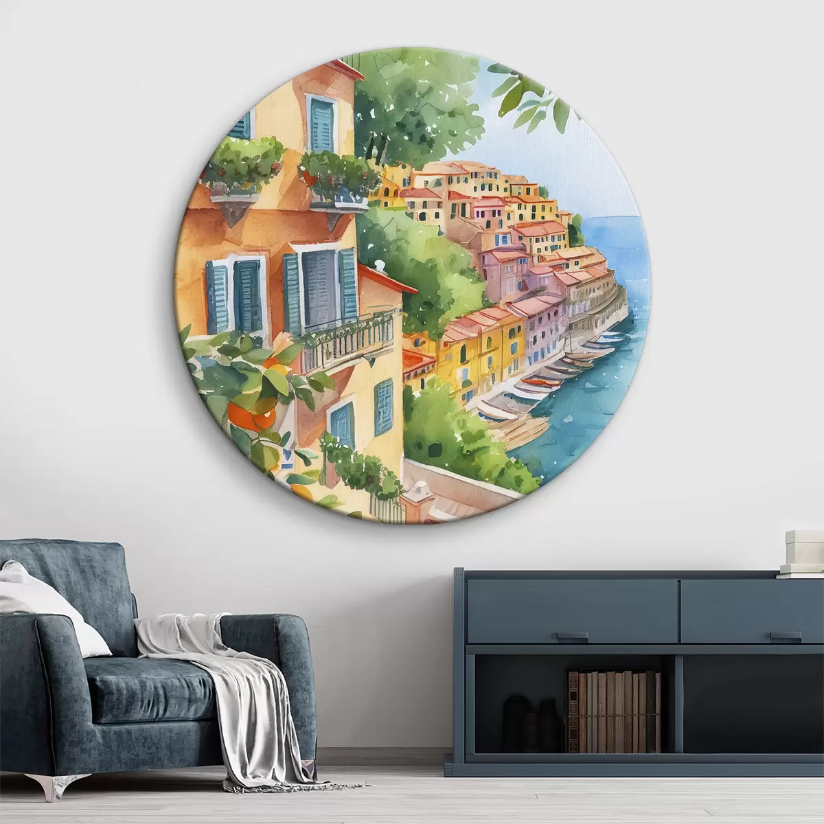 Runde Gemälde Italienische Stadtarchitektur, Amalfiküste, Sommer, Aquarell, Zitronenbaum r38393