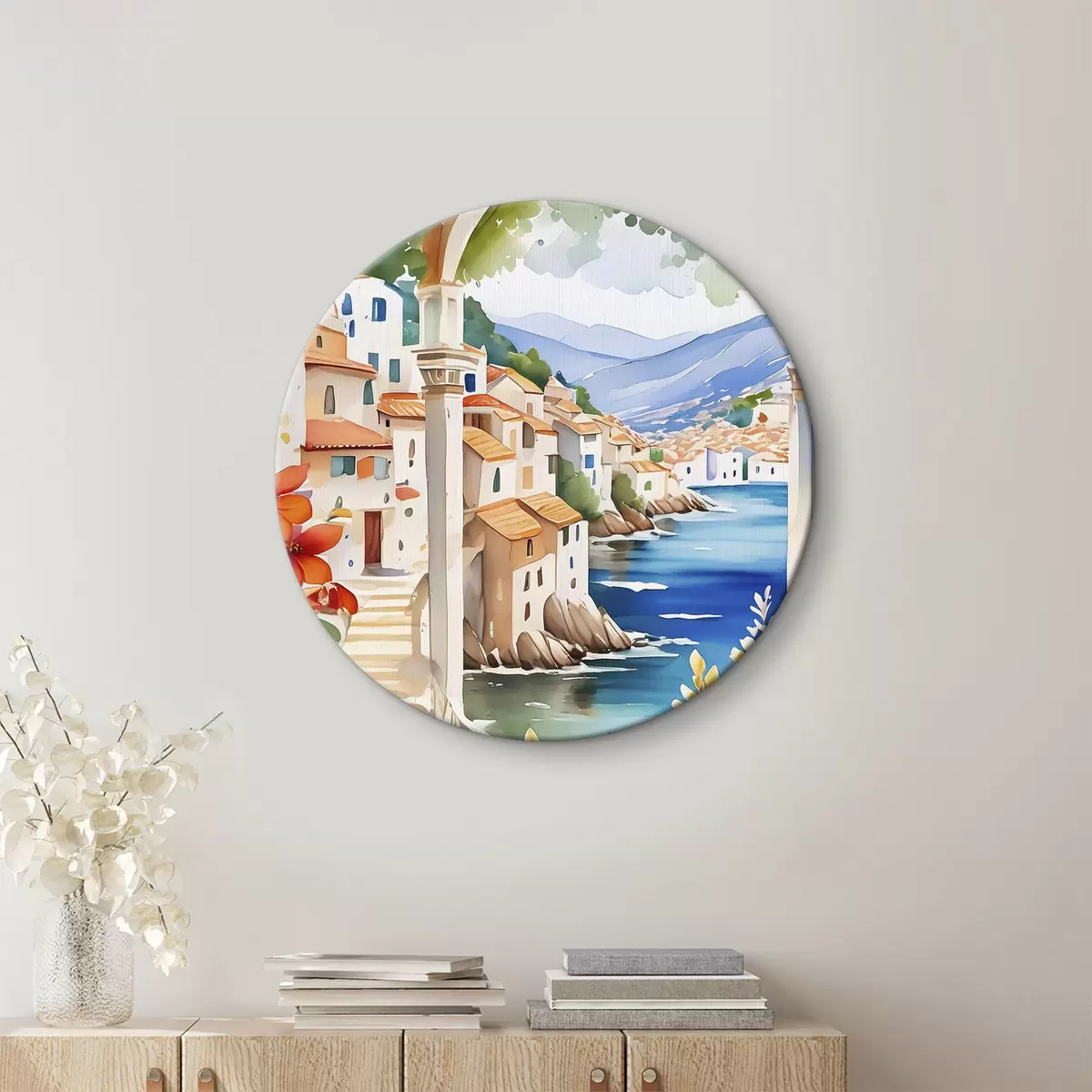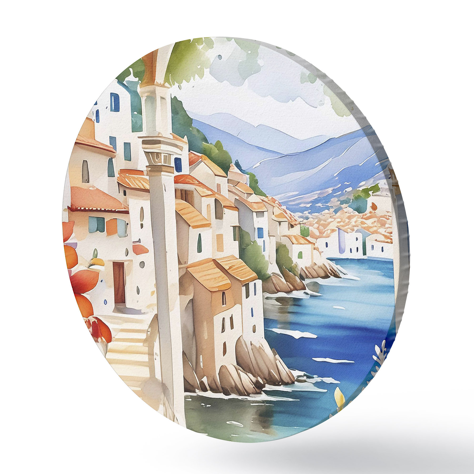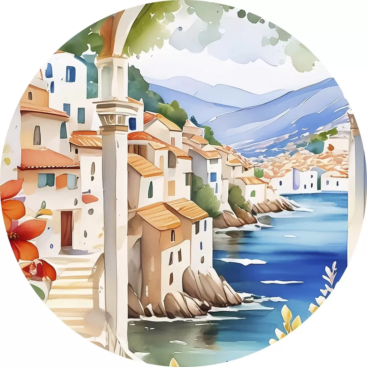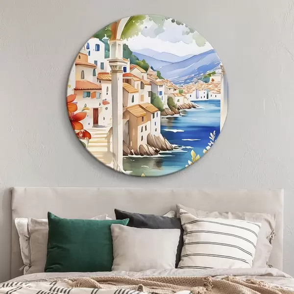 Runde Gemälde Bild einer Stadt mit einem Fluss und Blumen r38406