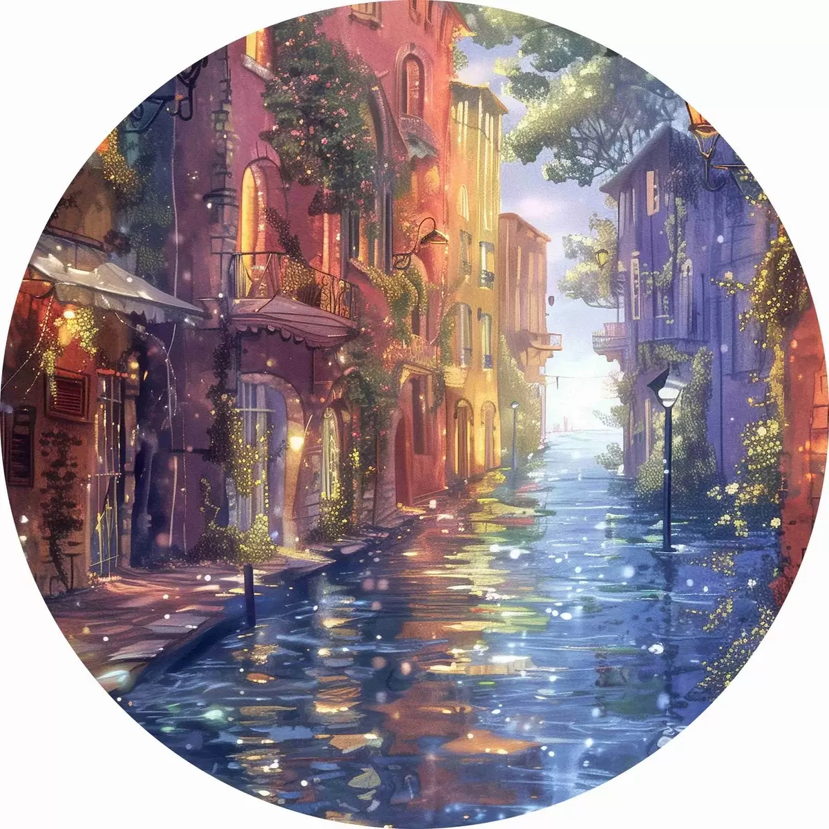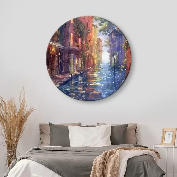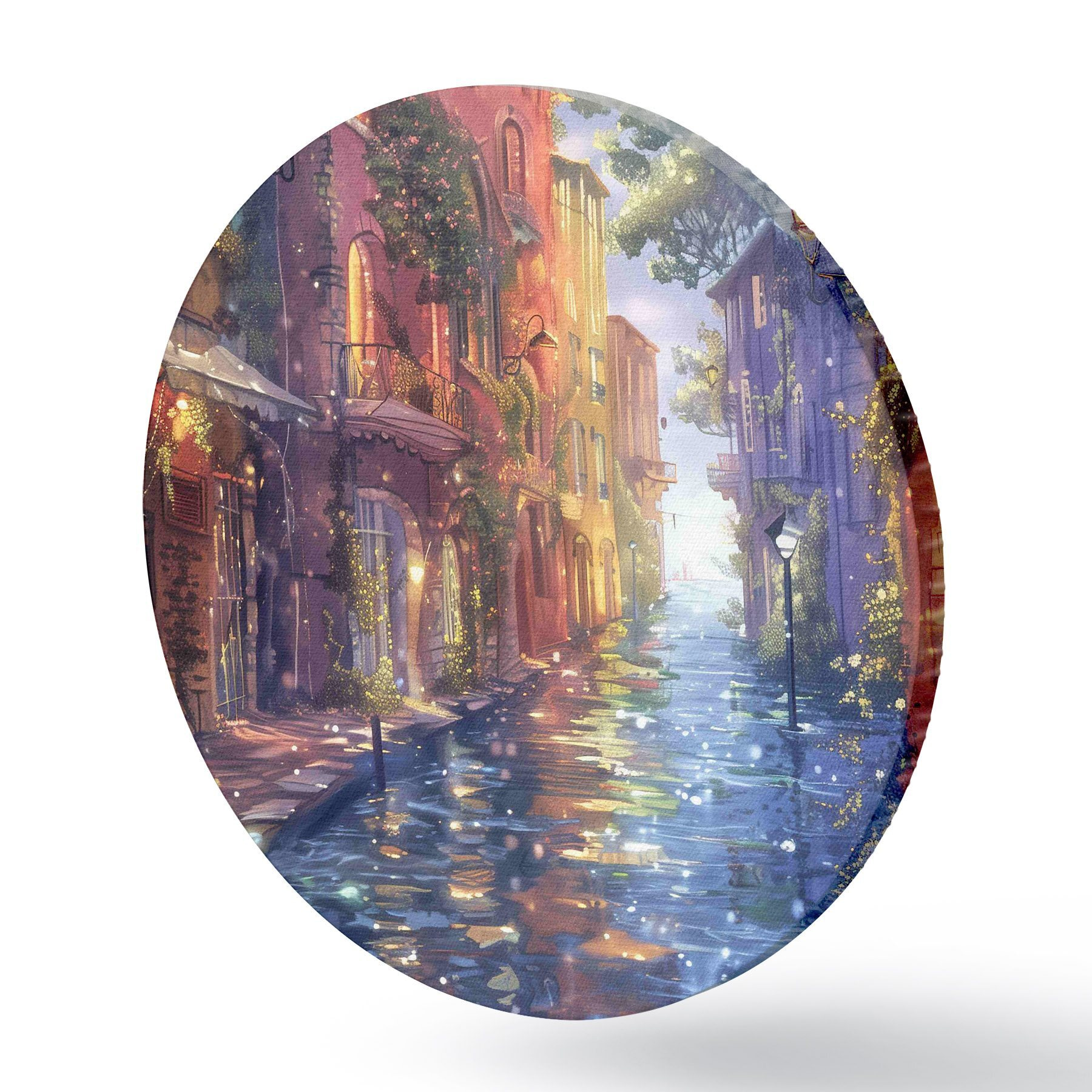 Runde Gemälde Wasserstraße mit Gebäuden und Bäumen r38450