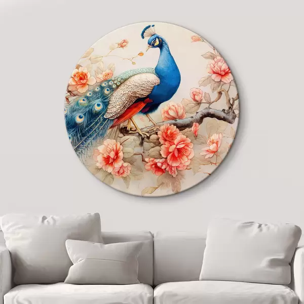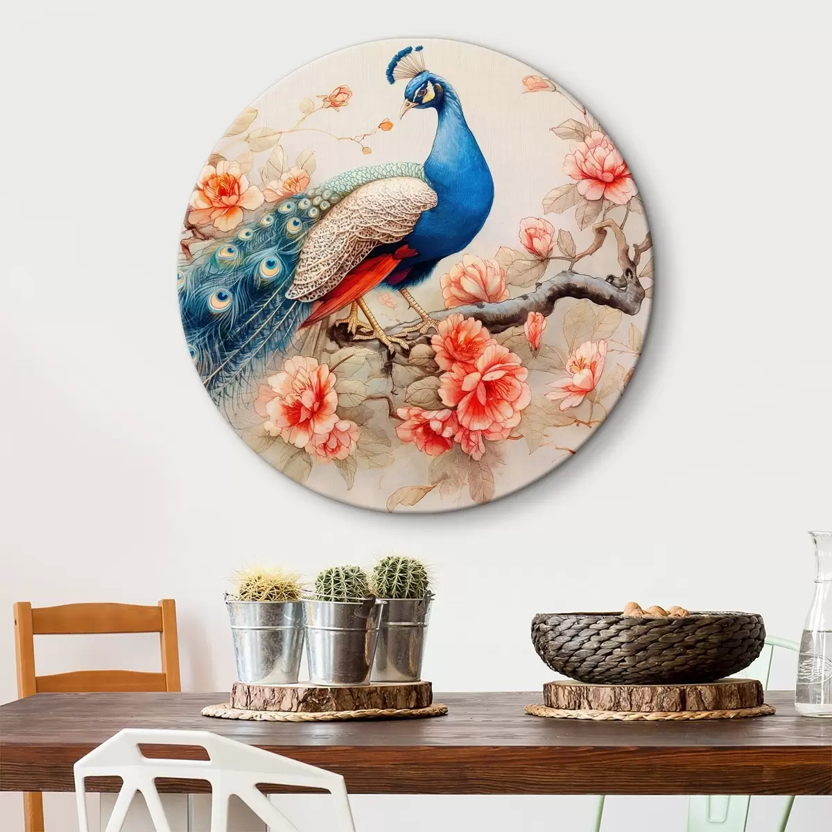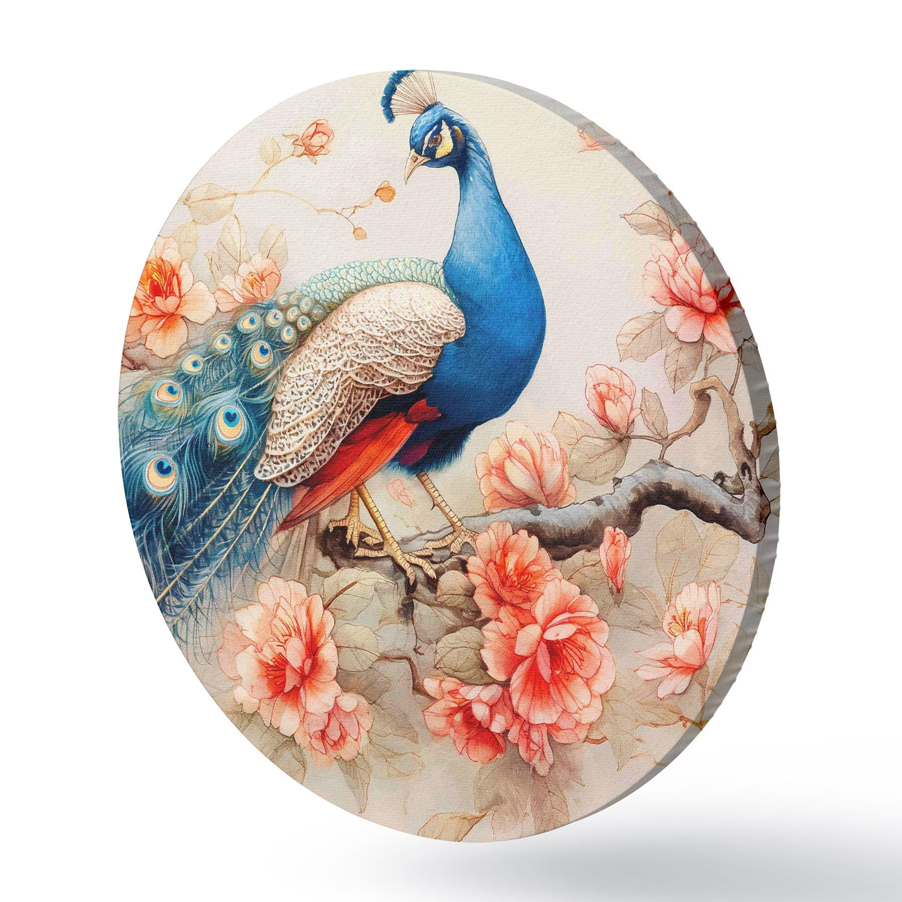 Runde Gemälde Ein Gemälde, das einen Pfau auf einem Ast mit Blumen zeigt r38451