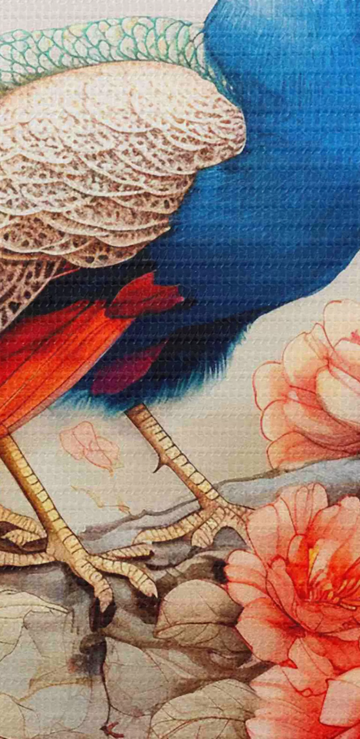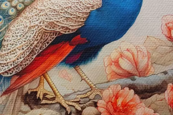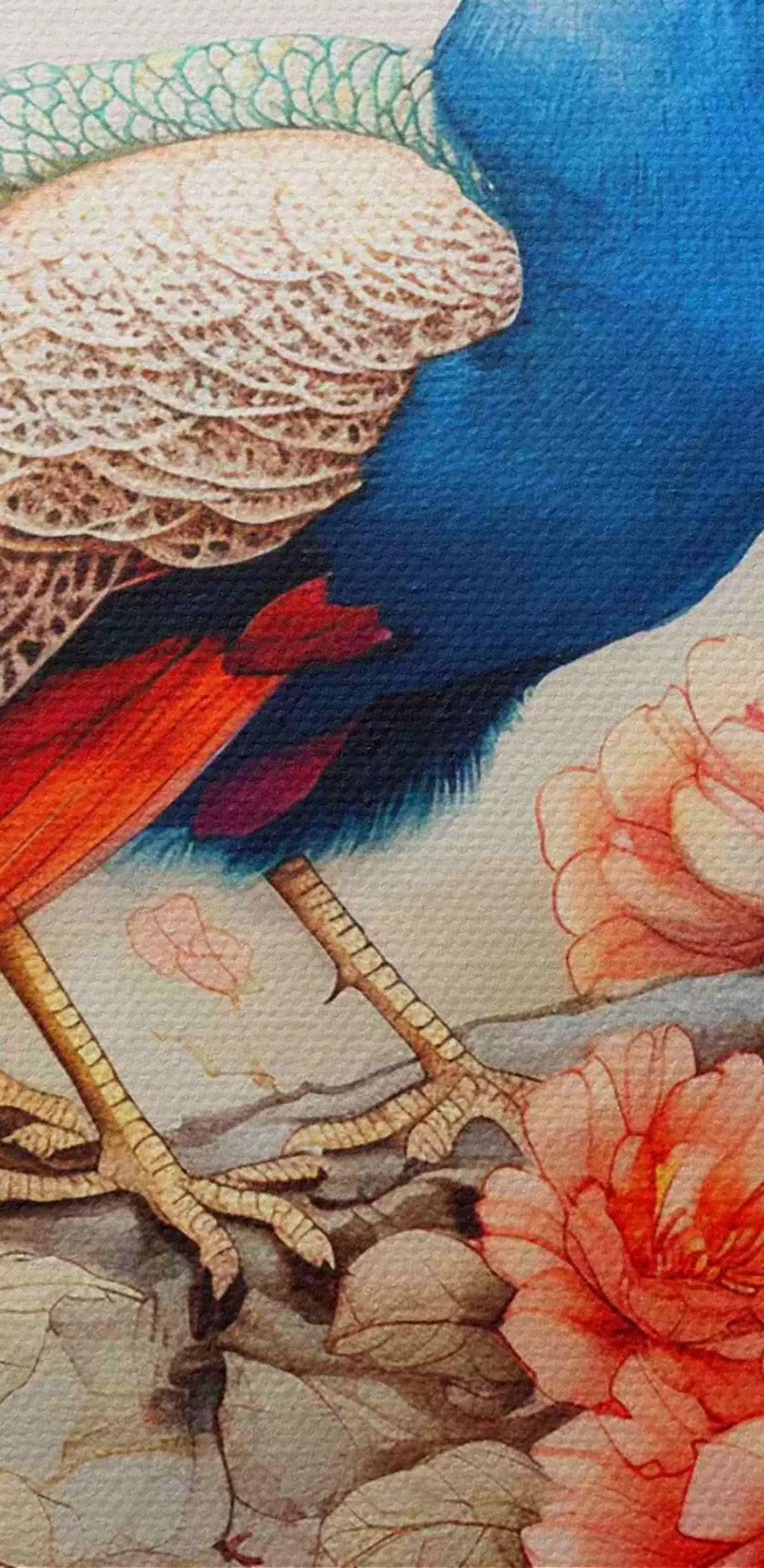 Bild Ein Gemälde, das einen Pfau auf einem Ast mit Blumen zeigt Nr r38451