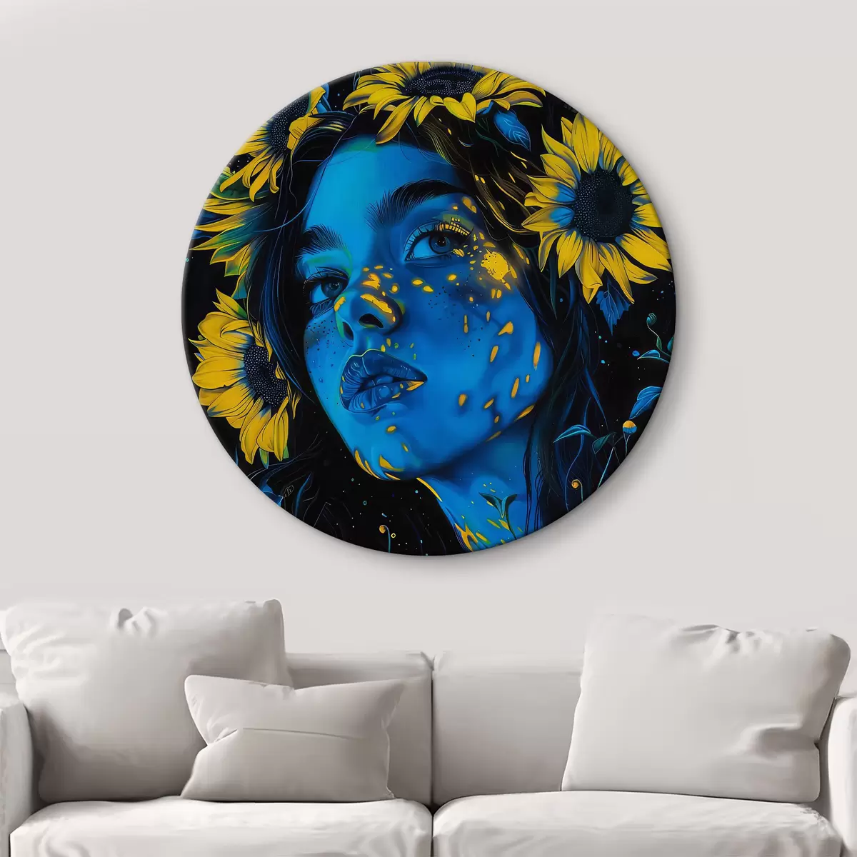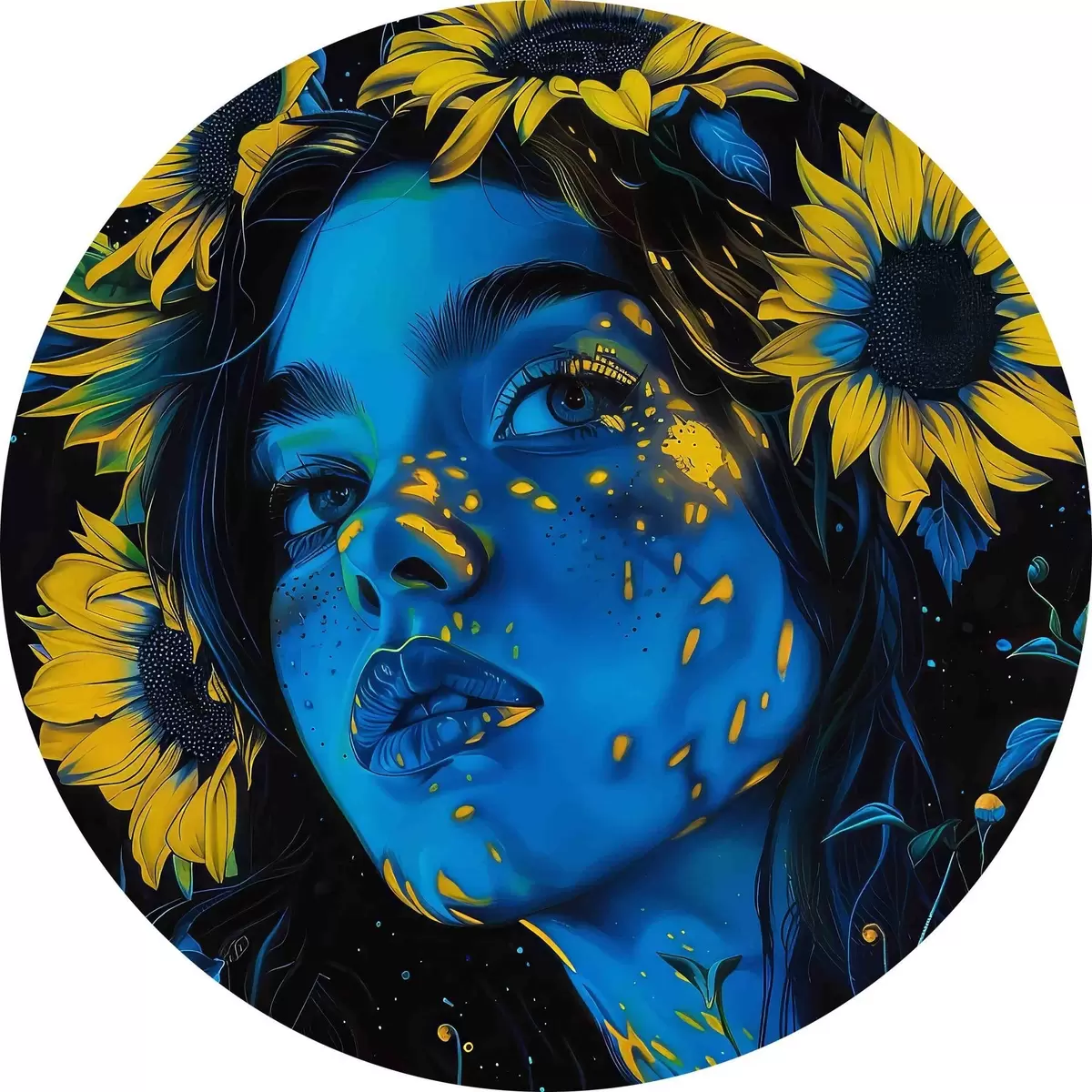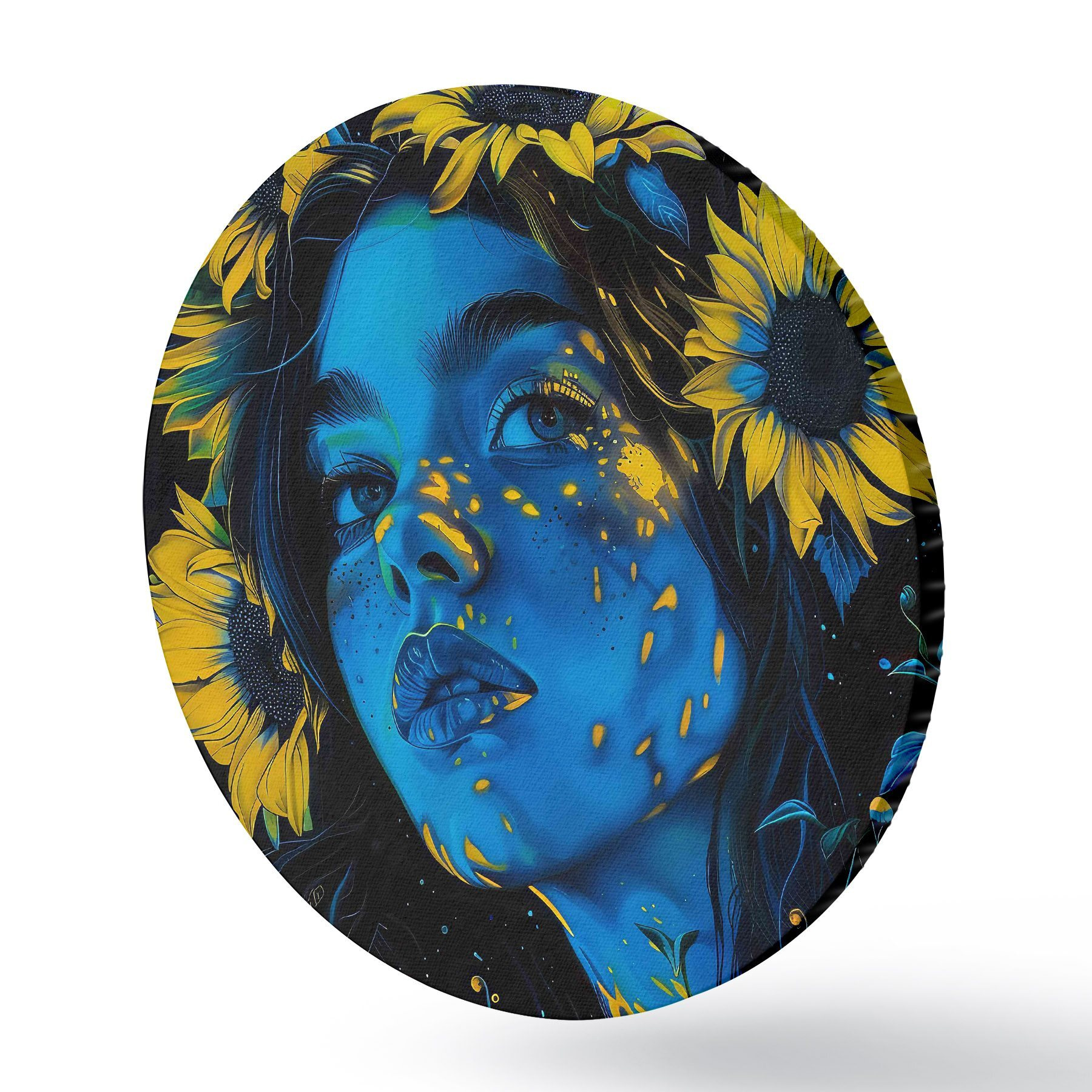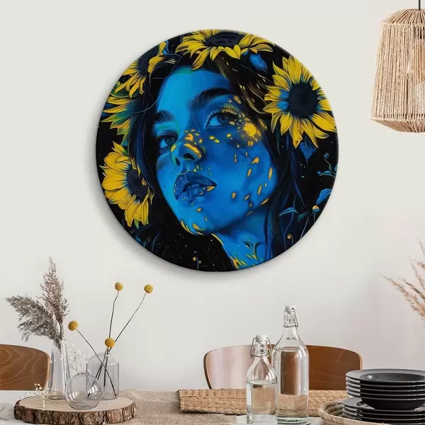 Runde Gemälde Frau mit Sonnenblumen in ihrem Haar r38504