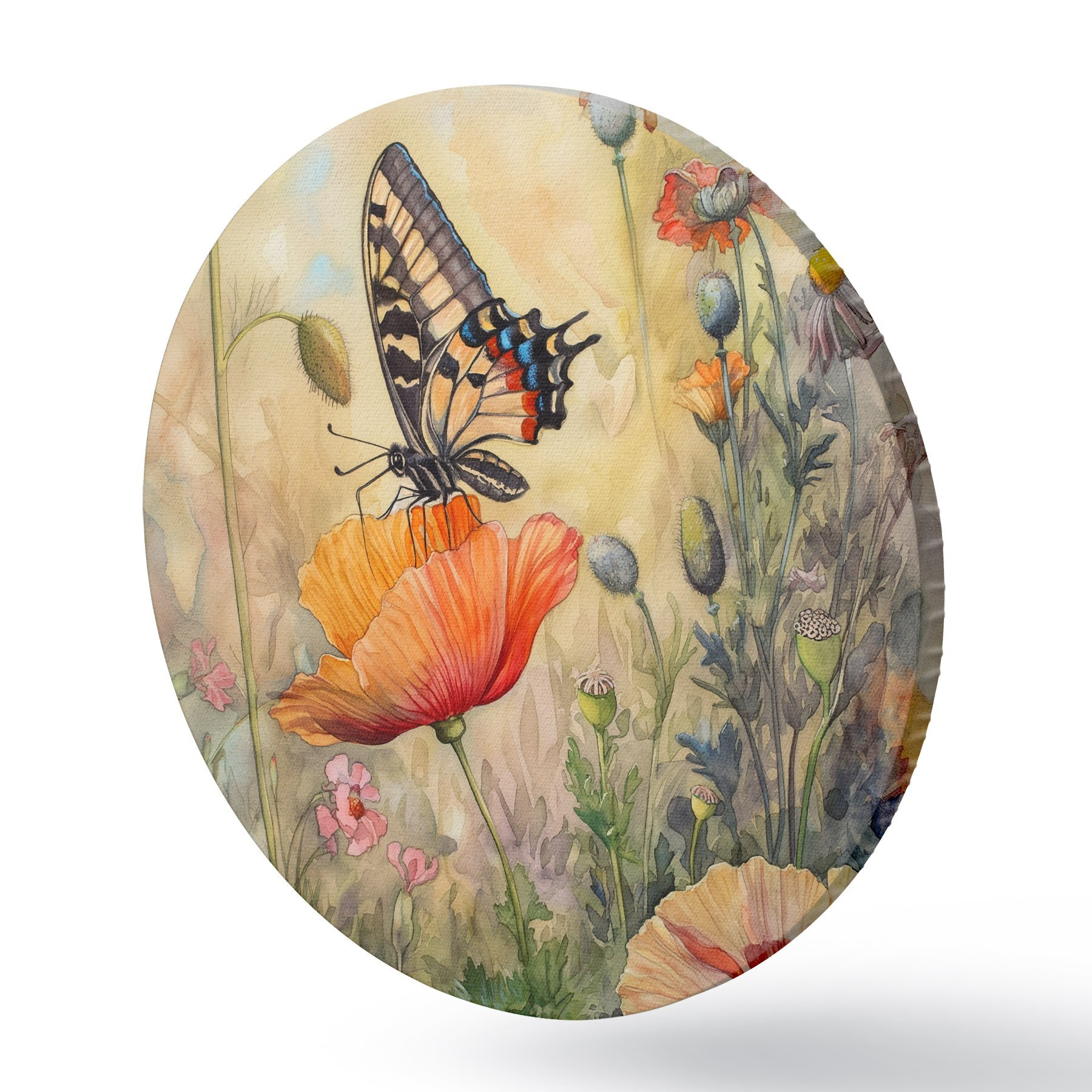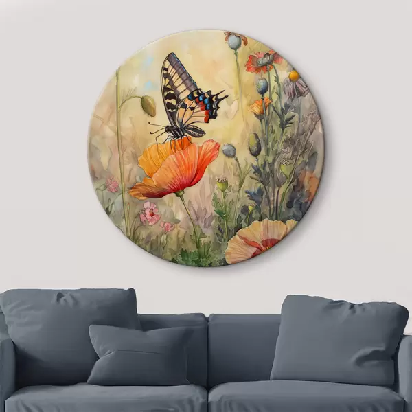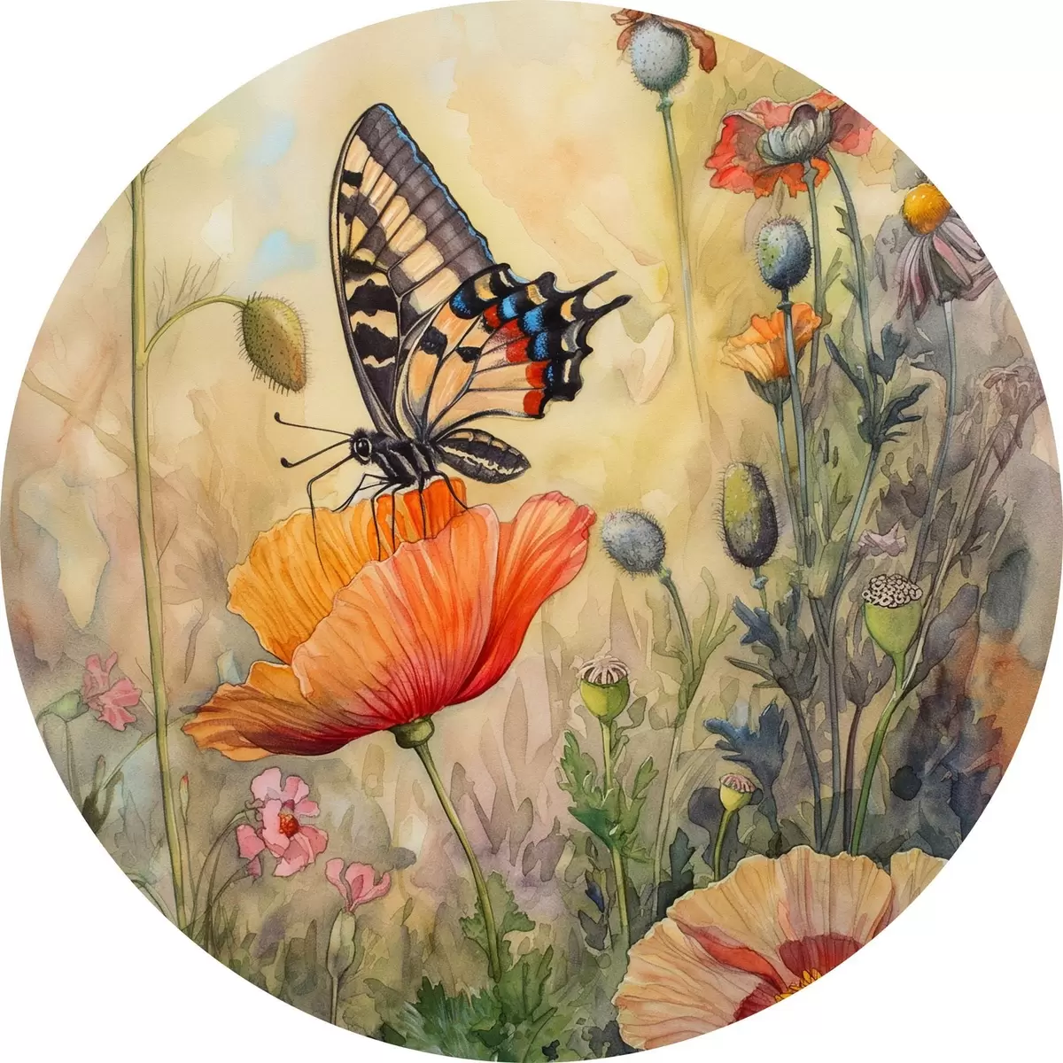 Runde Gemälde Mohnfeld und Schmetterling r38520