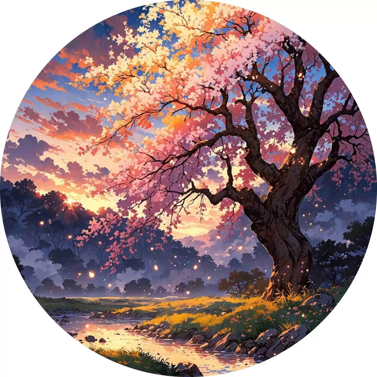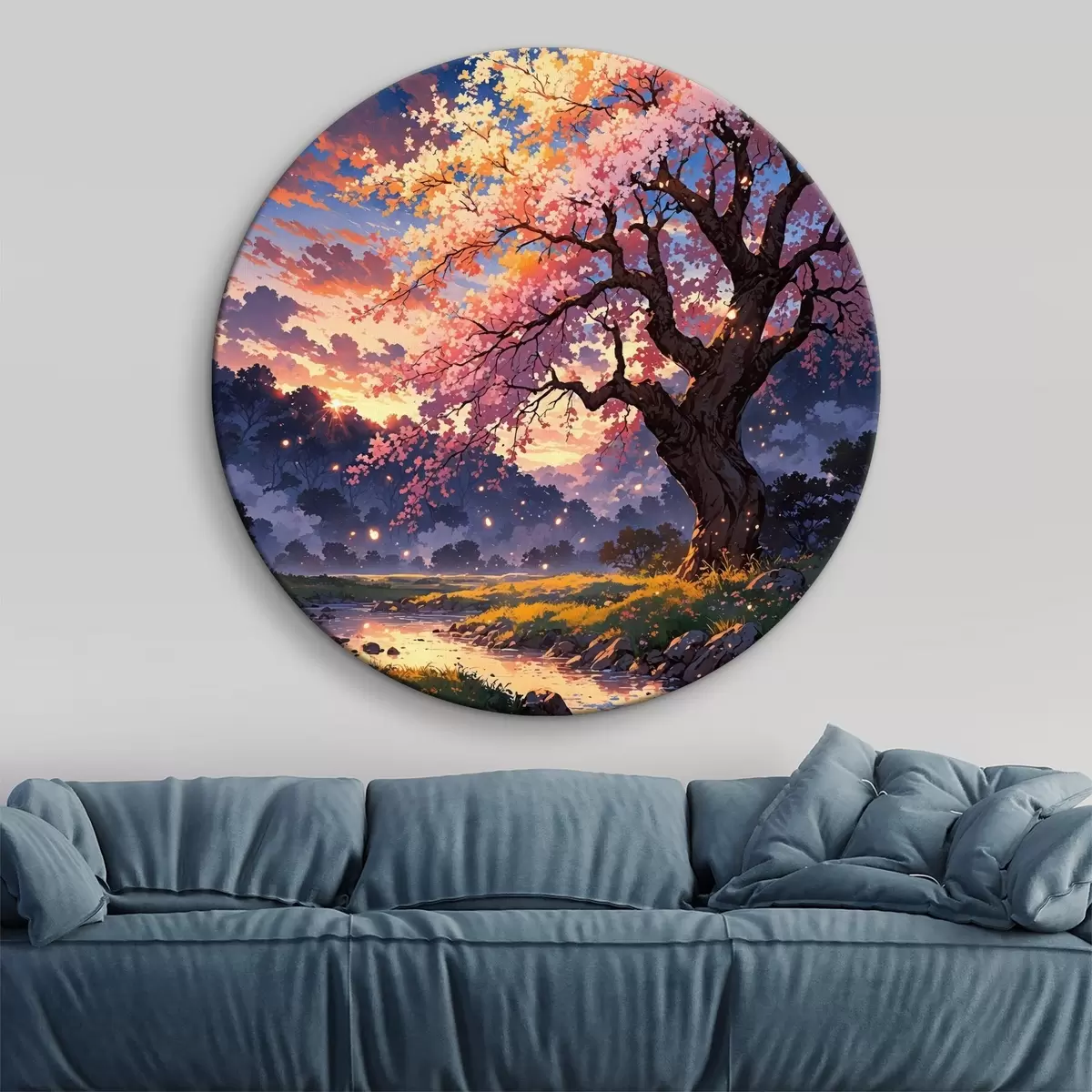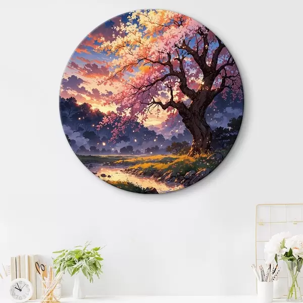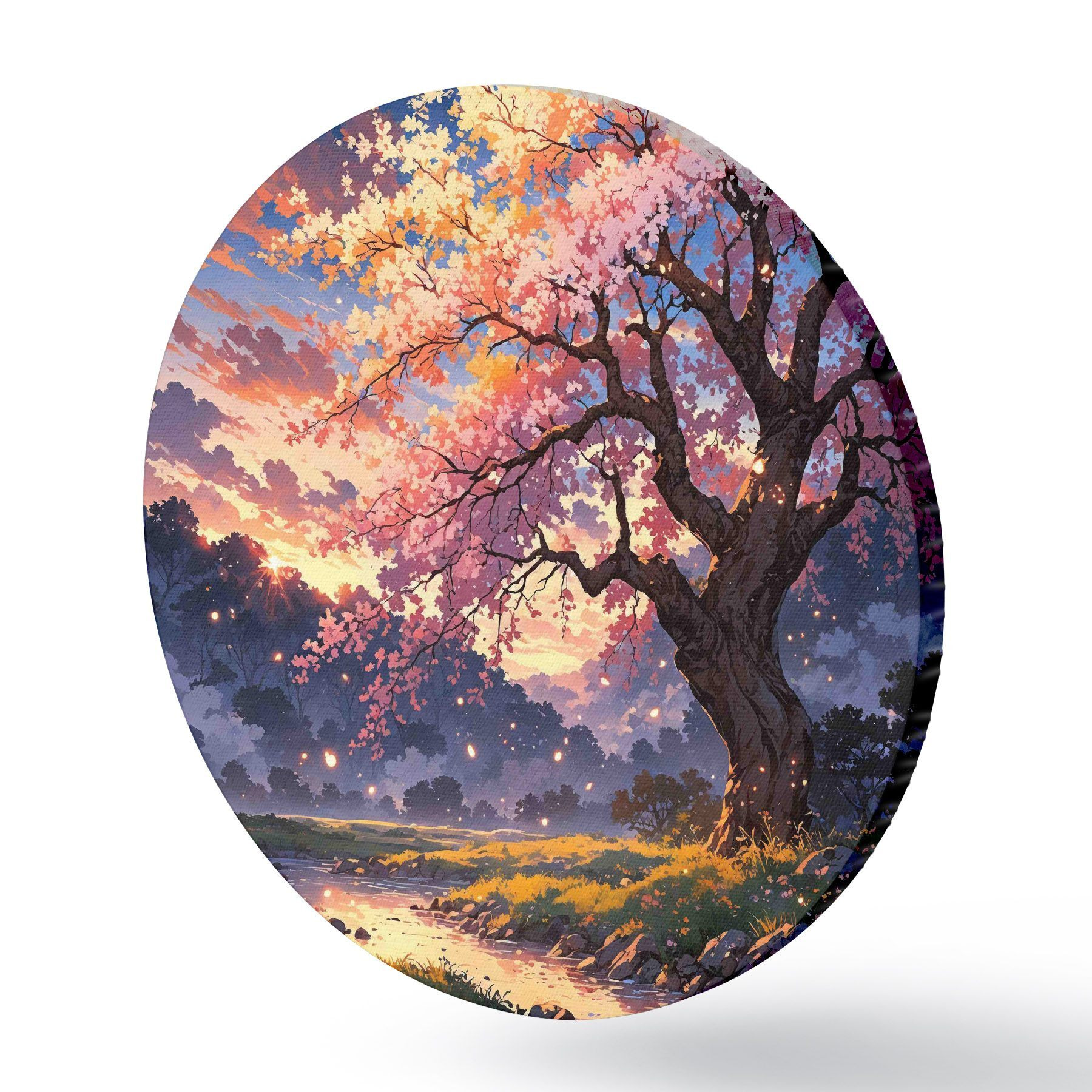 Runde Gemälde Ein Baum mit rosa Blüten, durch den ein Fluss fließt r38645