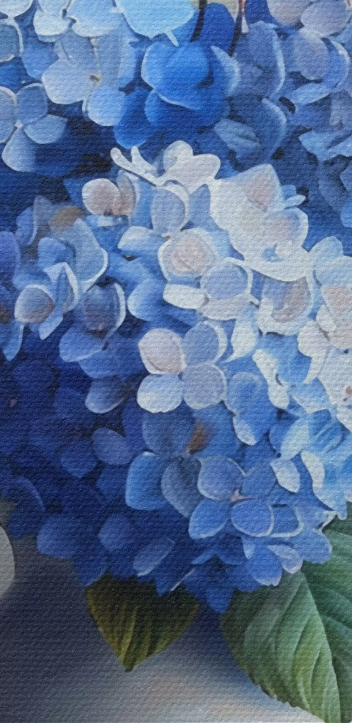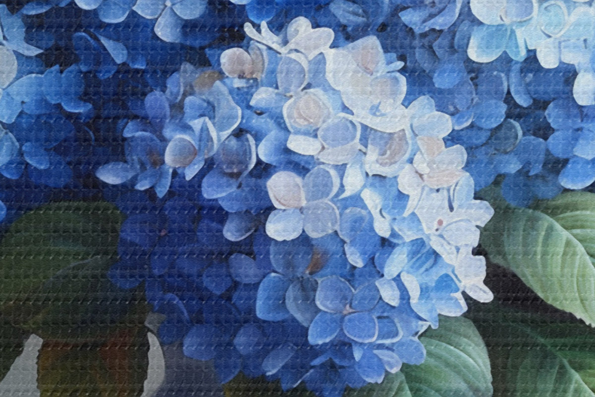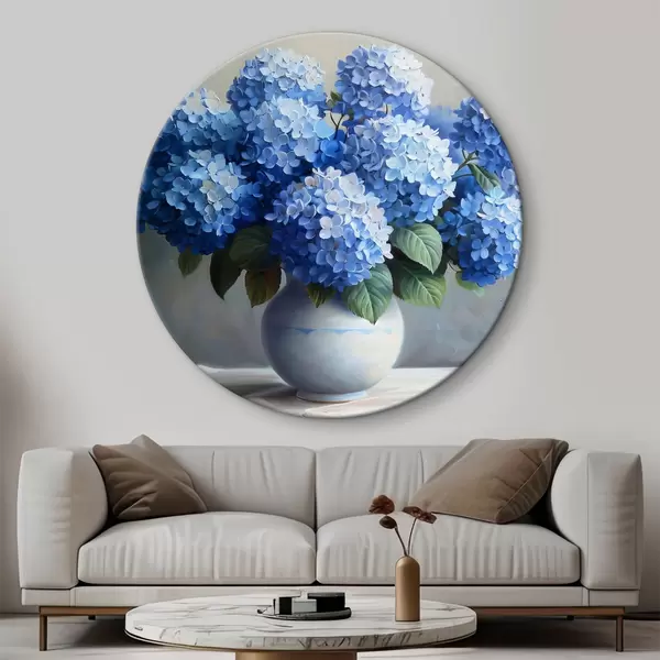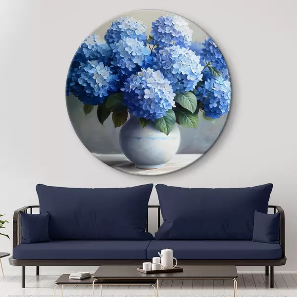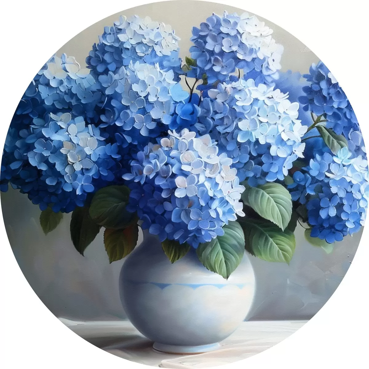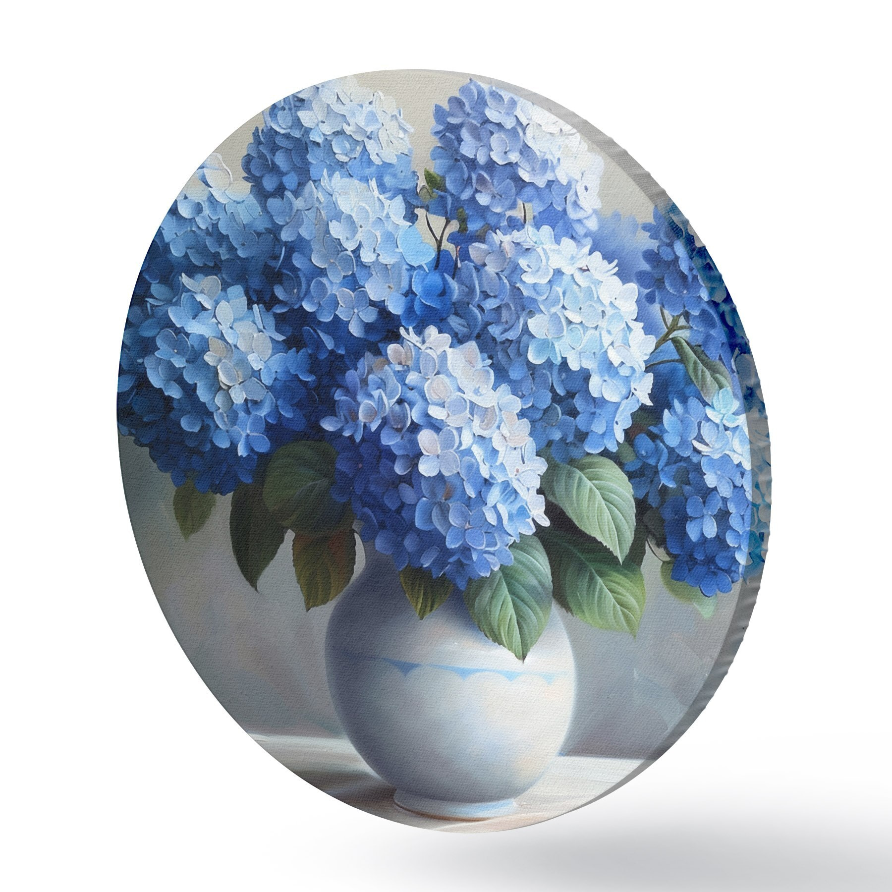 Runde Gemälde Blumenstrauß aus blauen Hortensien in einer weißen Vase r38696
