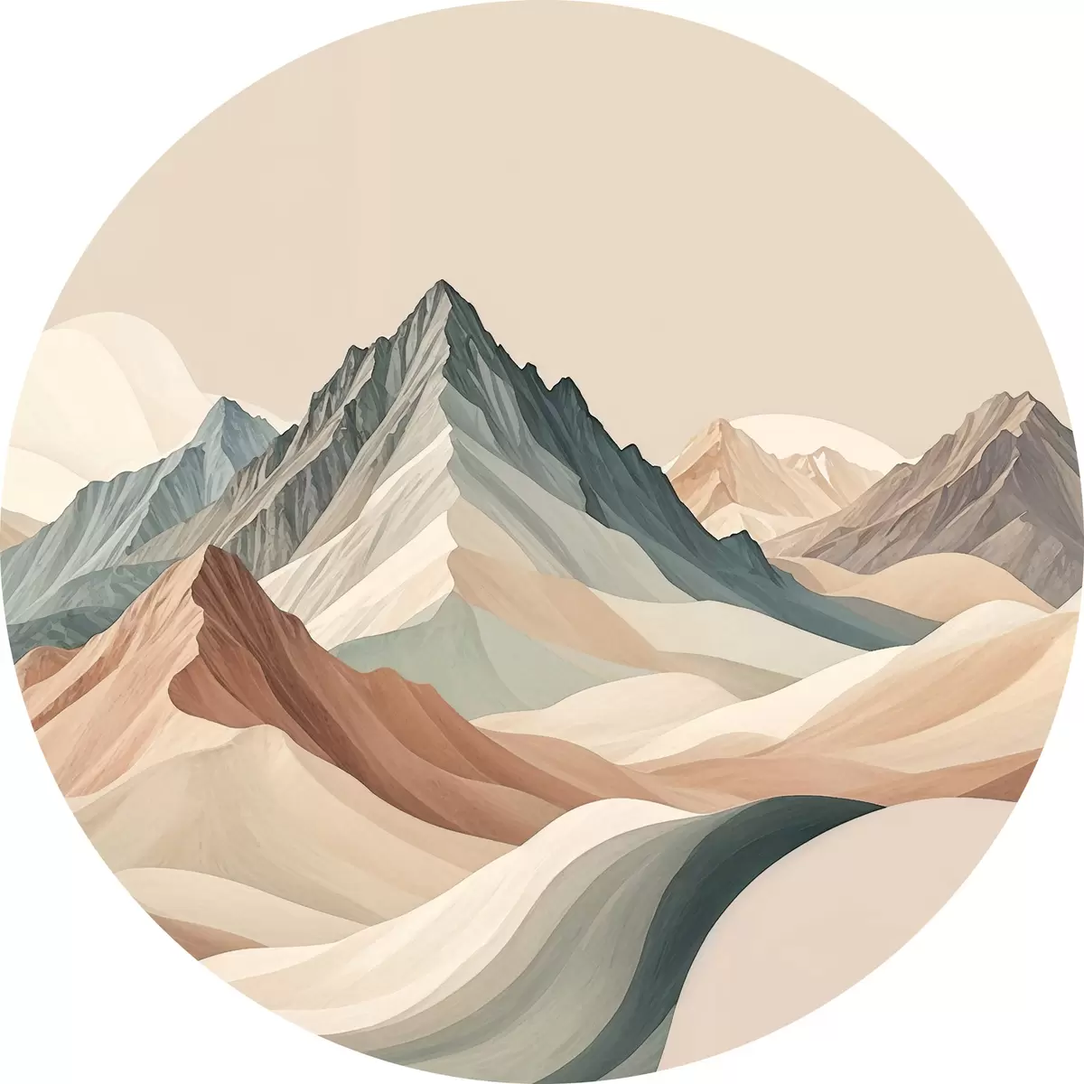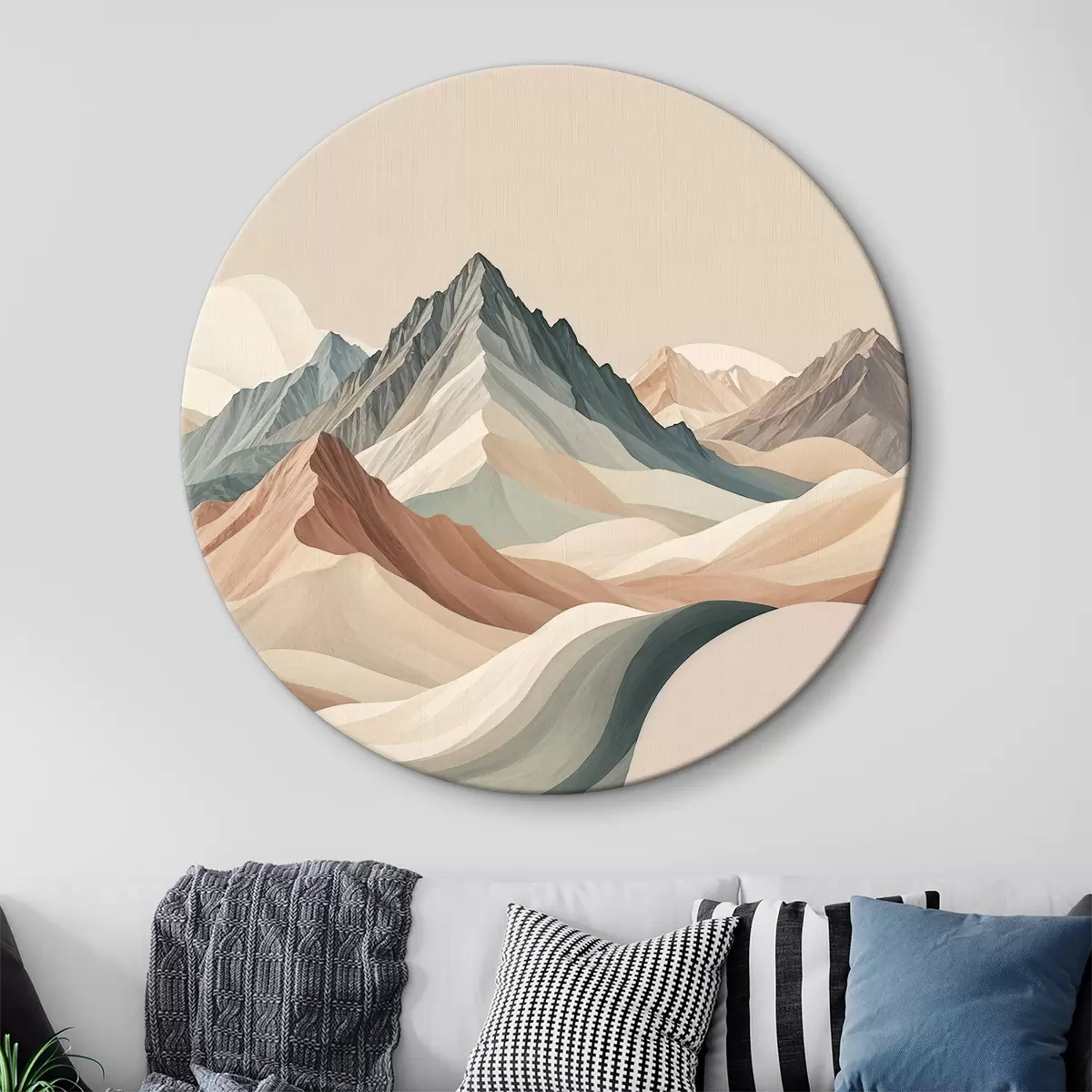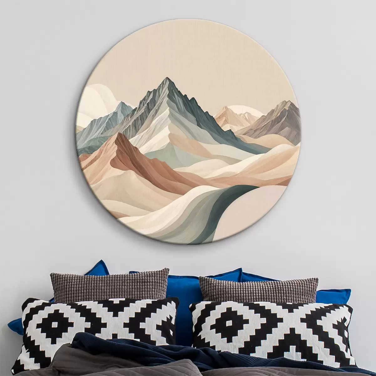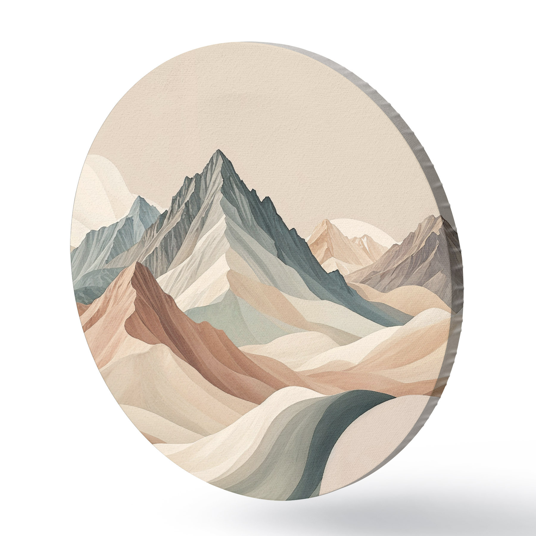 Runde Gemälde Minimalistische Berglandschaft mit felsigen Gipfeln und sanften Hügeln in Beige r38770