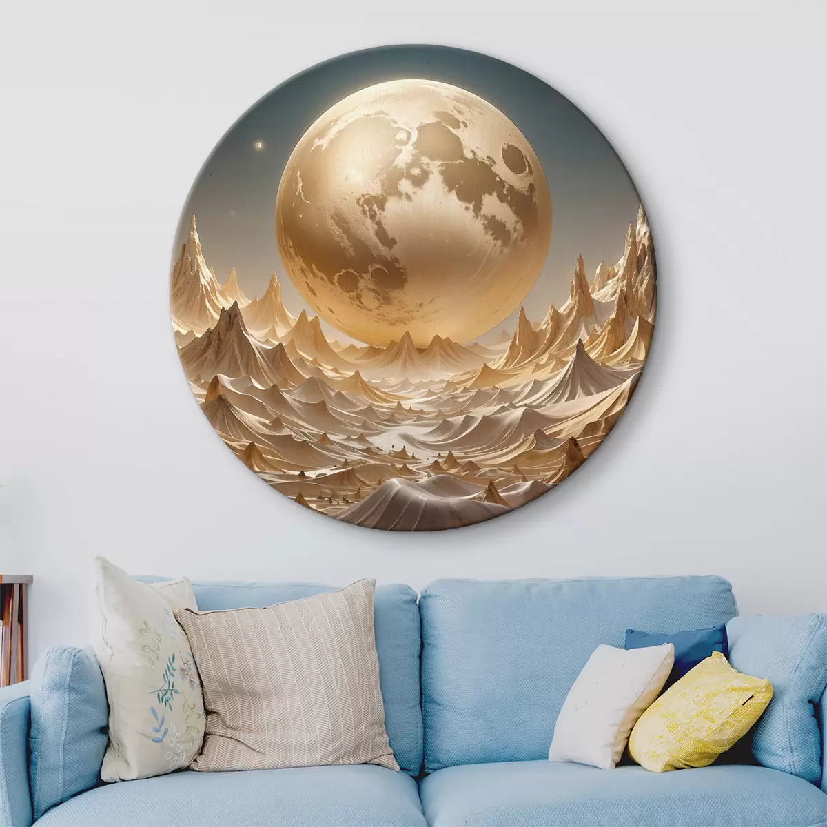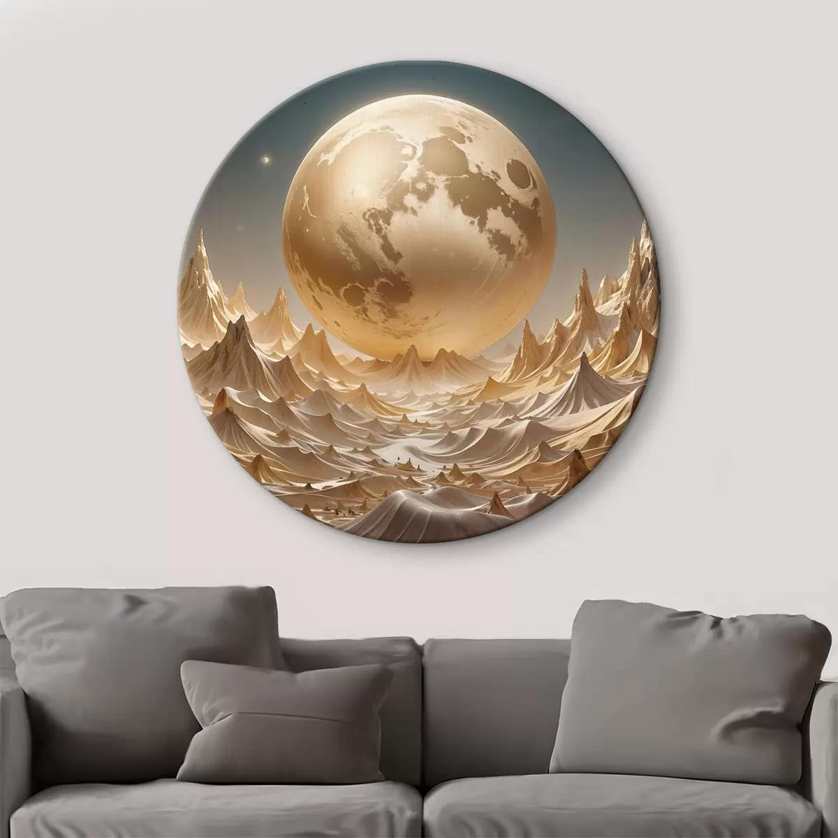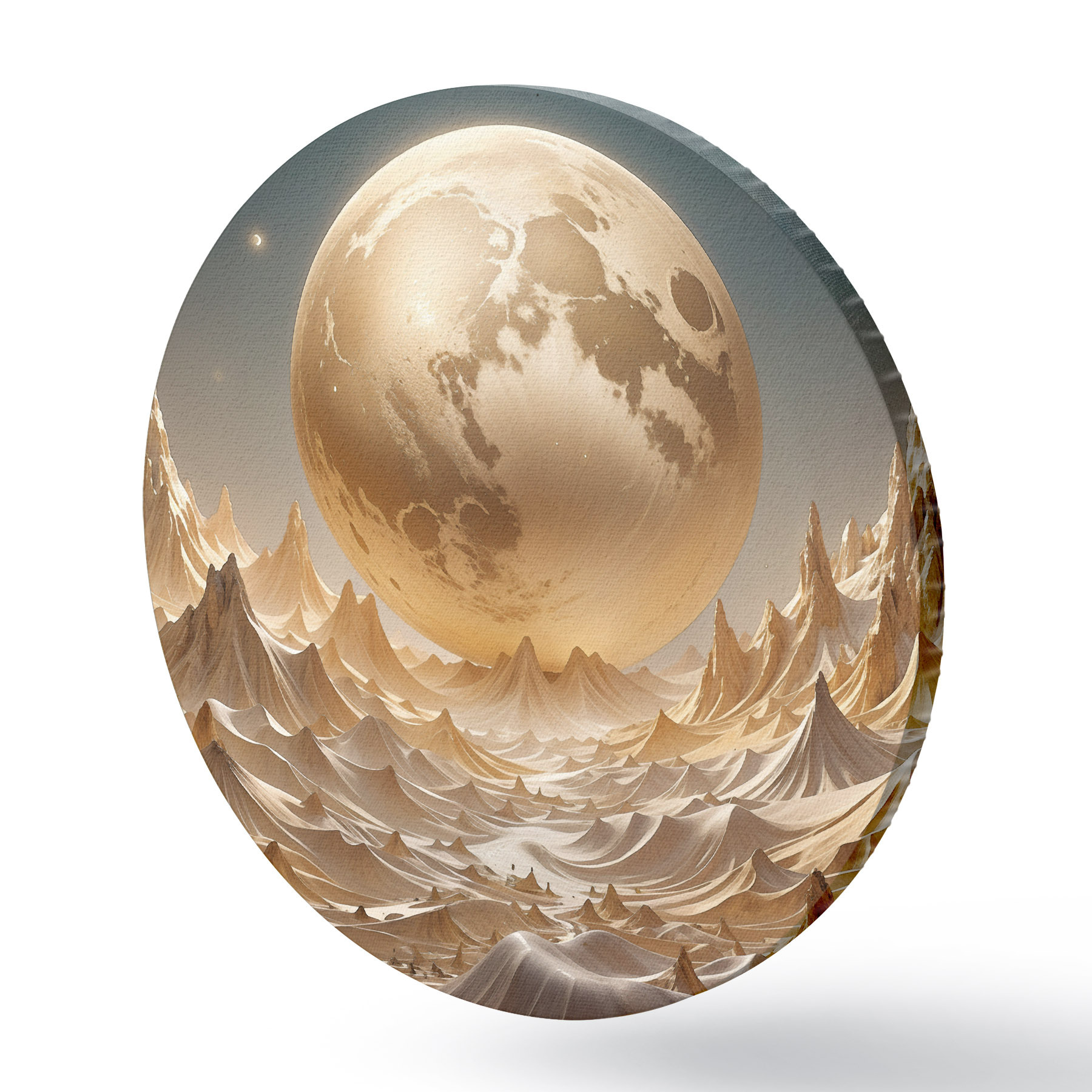 Runde Gemälde Glühender Vollmond über einer surrealen, bergigen Landschaft mit Gipfeln r38775