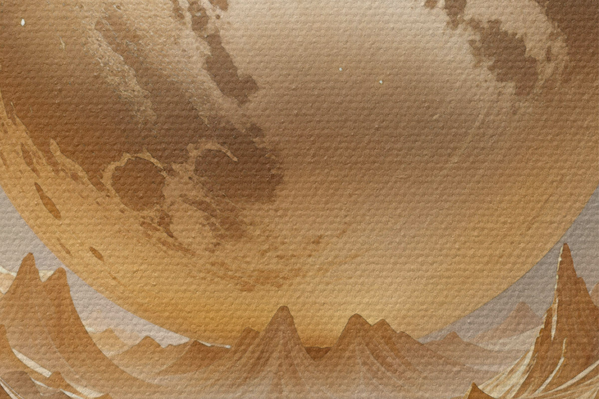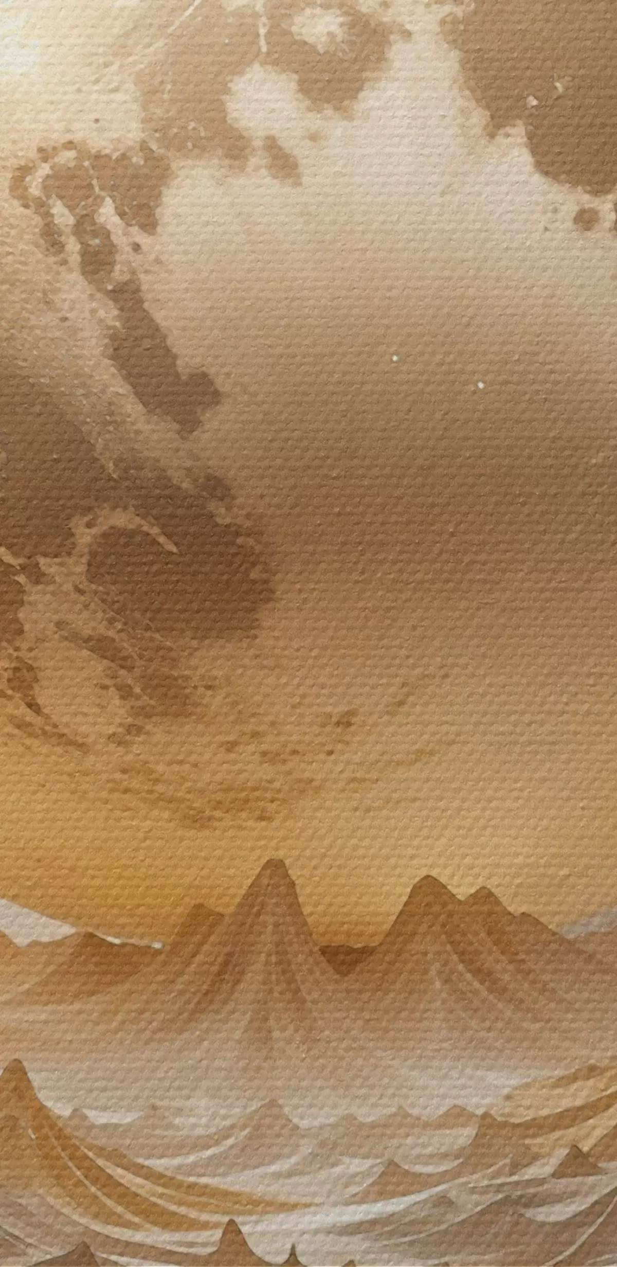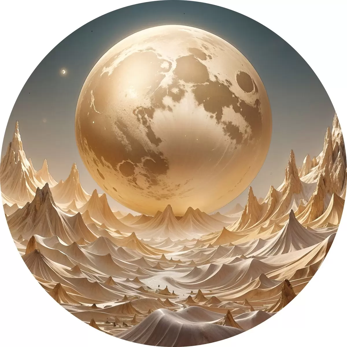 Runde Gemälde Glühender Vollmond über einer surrealen, bergigen Landschaft mit Gipfeln r38775