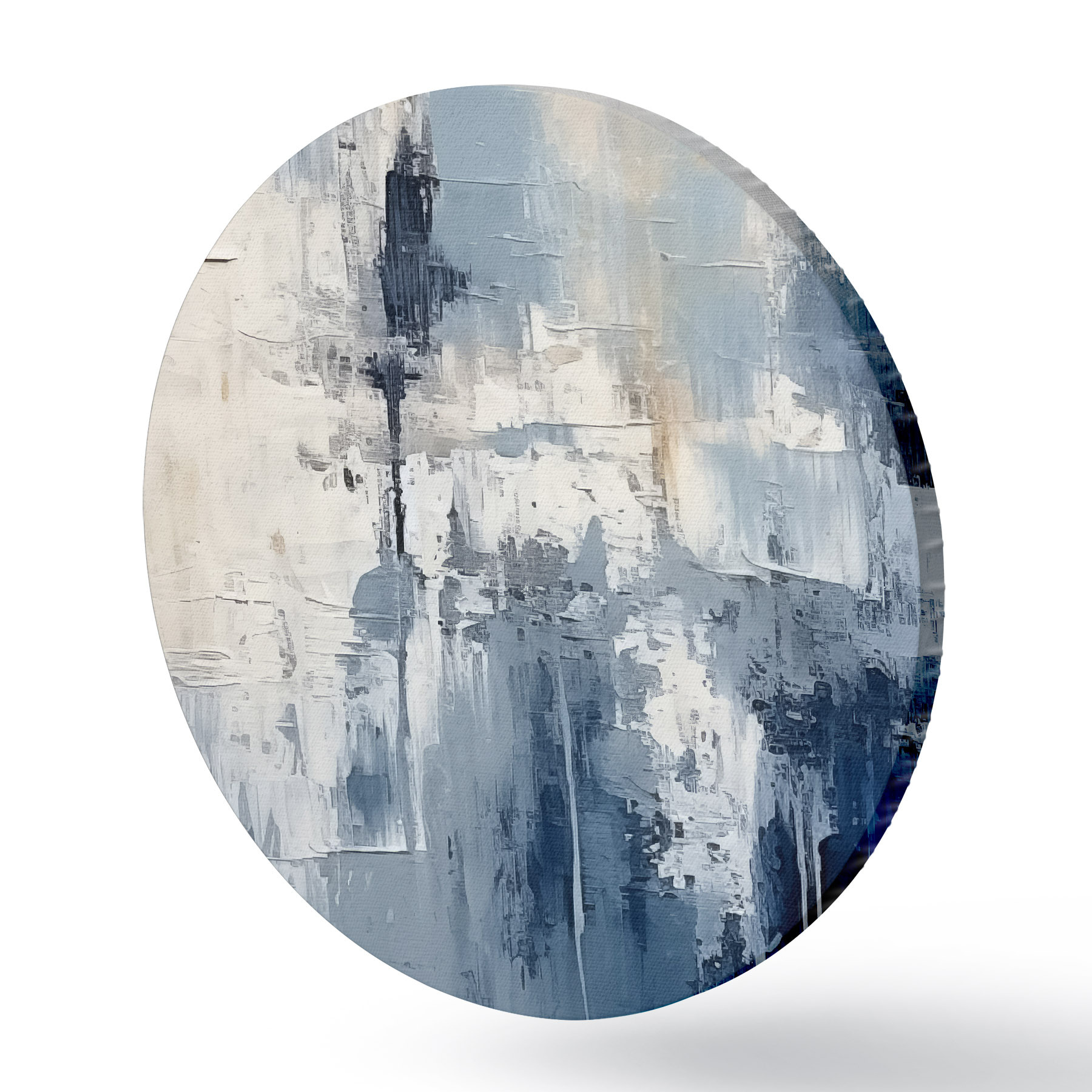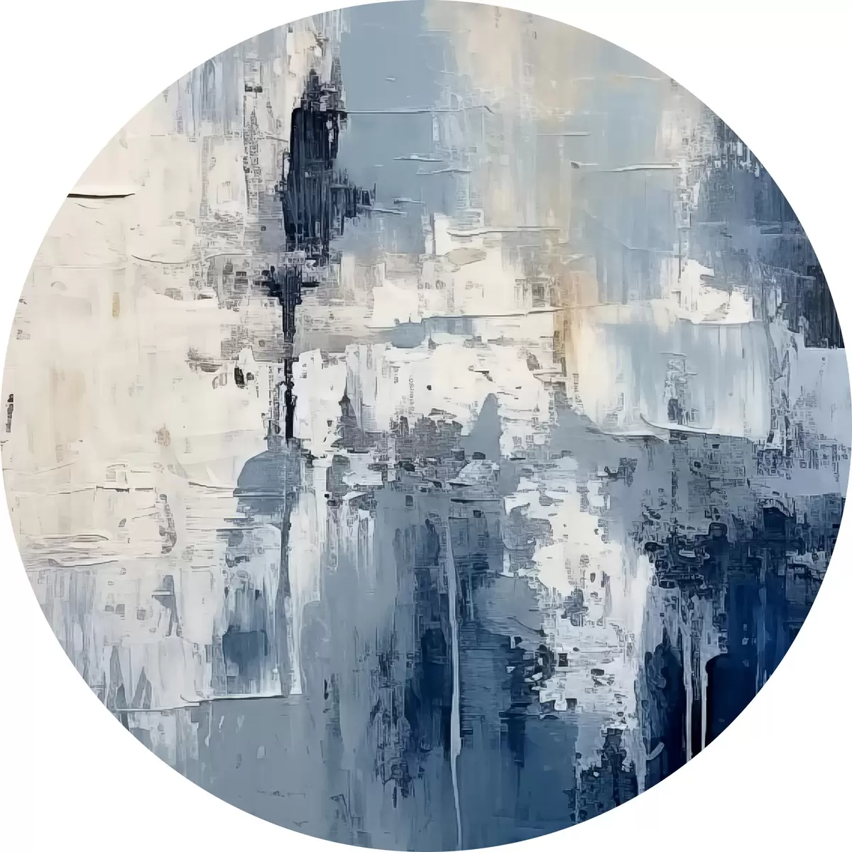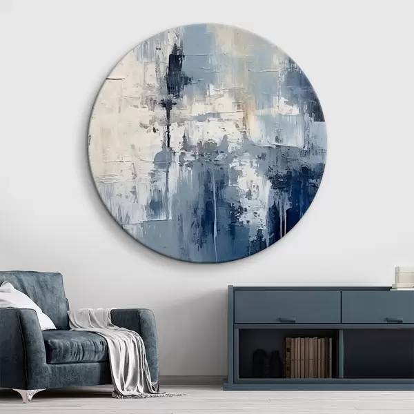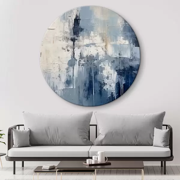 Runde Gemälde Abstraktes minimalistisches Ölgemälde, gerieben, geometrisch, Flecken, blaue und weiße Farbe r38906