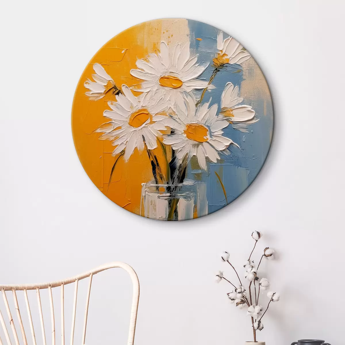 Runde Gemälde Weiße Gänseblümchen in einer Glasvase auf blauem und gelbem Hintergrund, Imitation eines Ölgemäldes, große Striche r38907