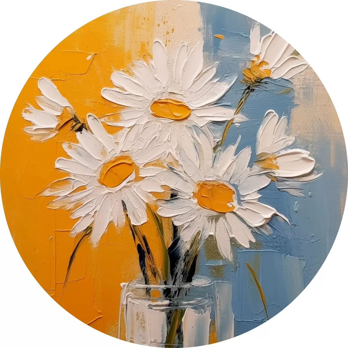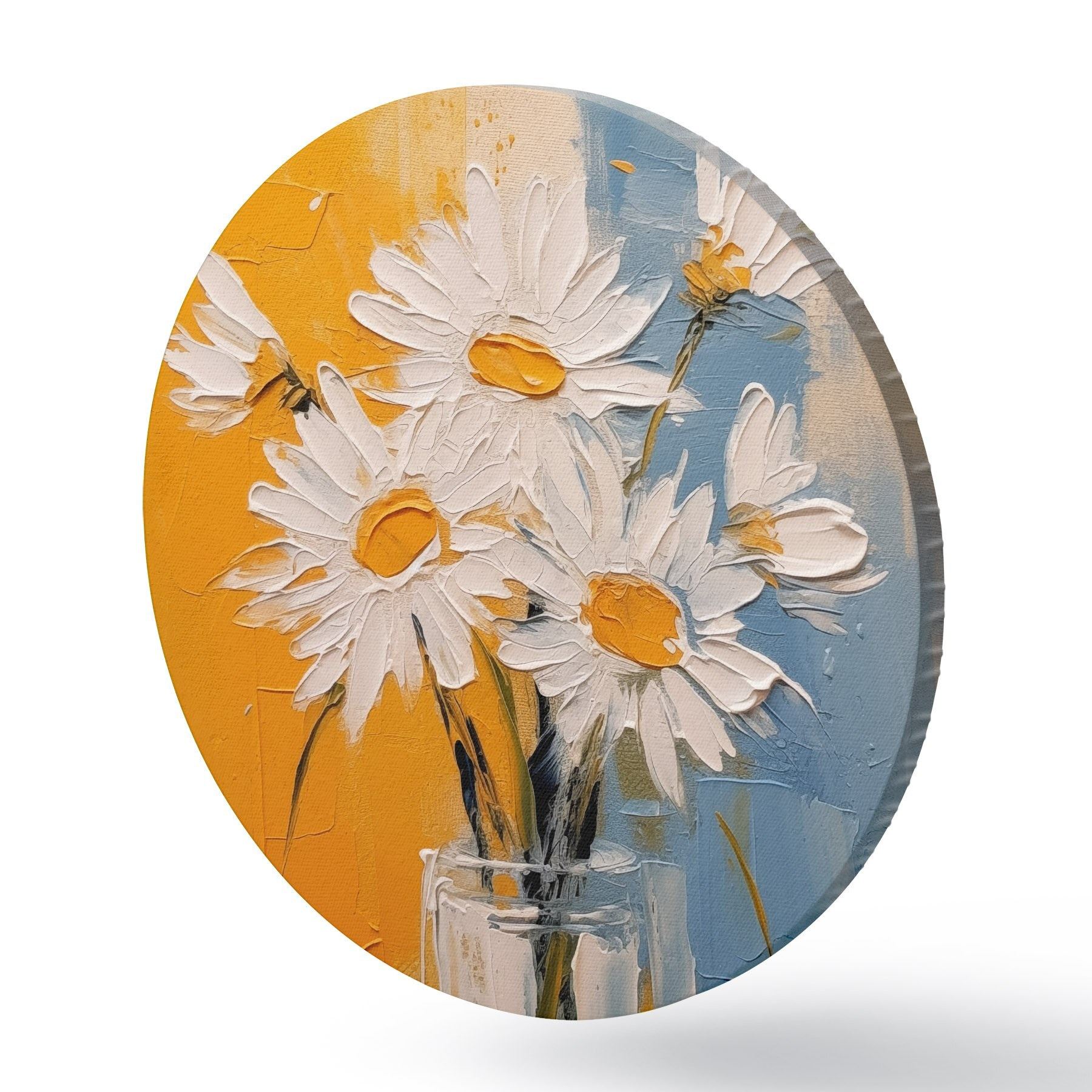 Runde Gemälde Weiße Gänseblümchen in einer Glasvase auf blauem und gelbem Hintergrund, Imitation eines Ölgemäldes, große Striche r38907