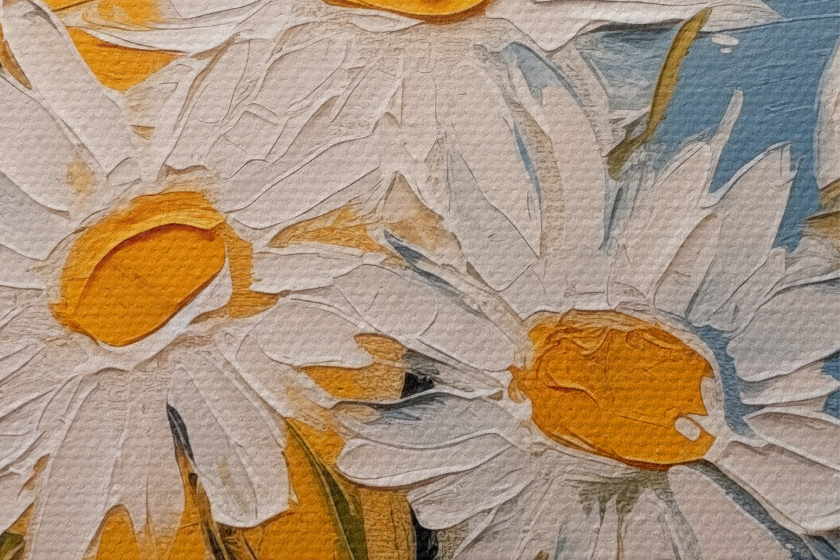 Bild Weiße Gänseblümchen in einer Glasvase auf blauem und gelbem Hintergrund, Imitation eines Ölgemäldes, große Striche Nr r38907