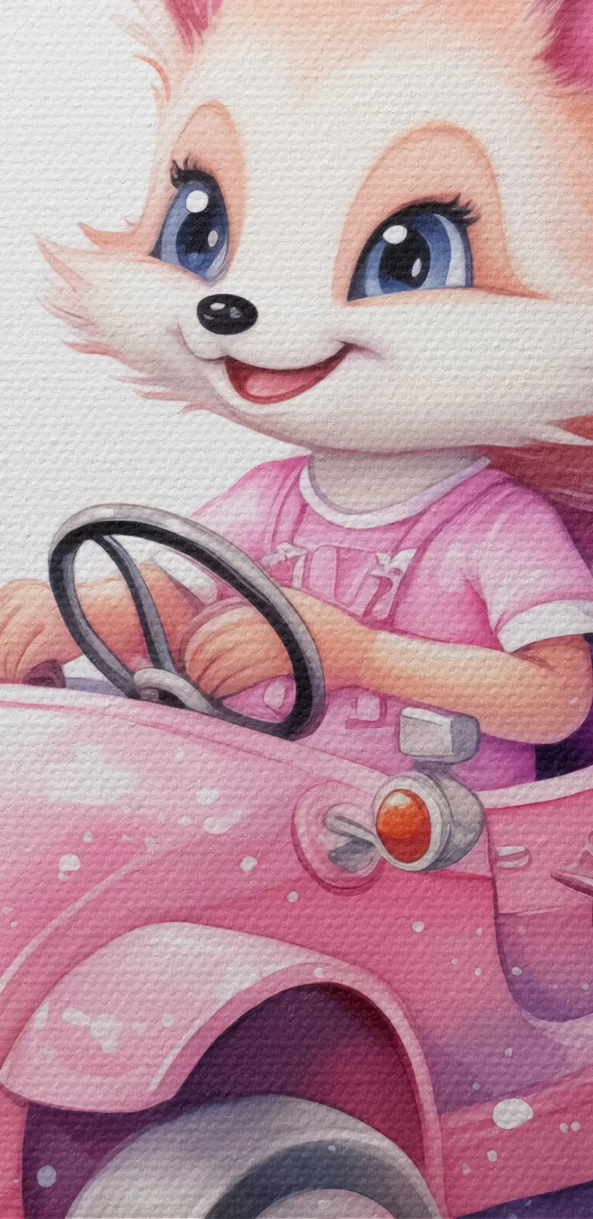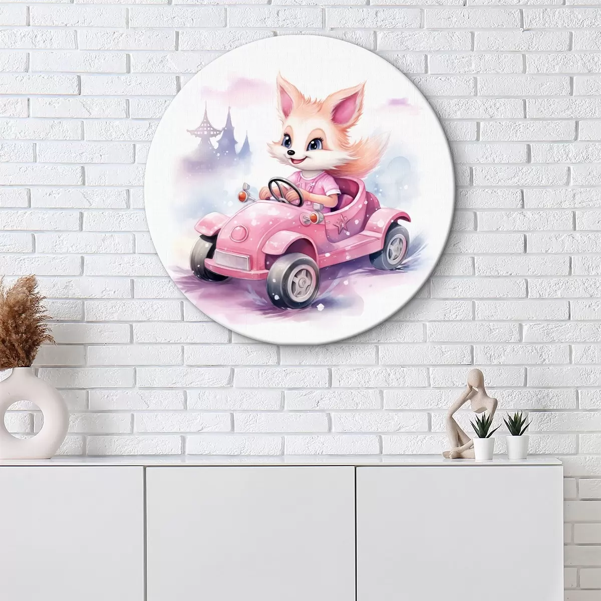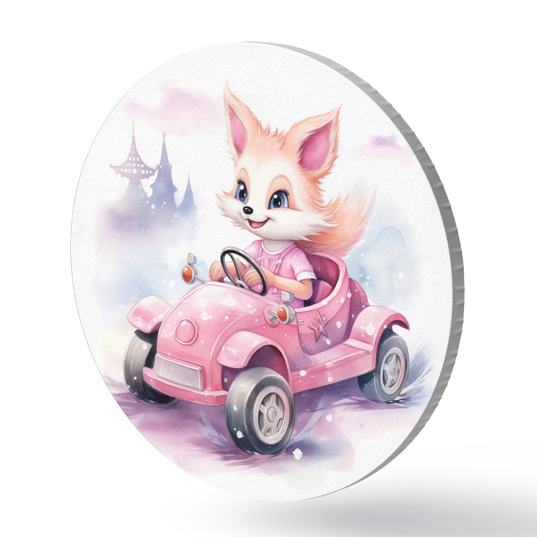 Runde Gemälde Kleiner Fuchs fährt ein rosa Auto Aquarell-Illustration für Kinder r38943