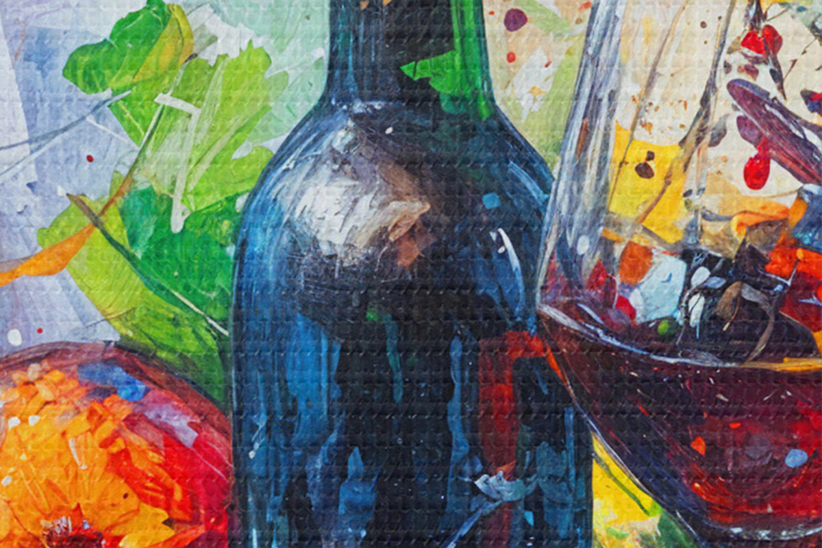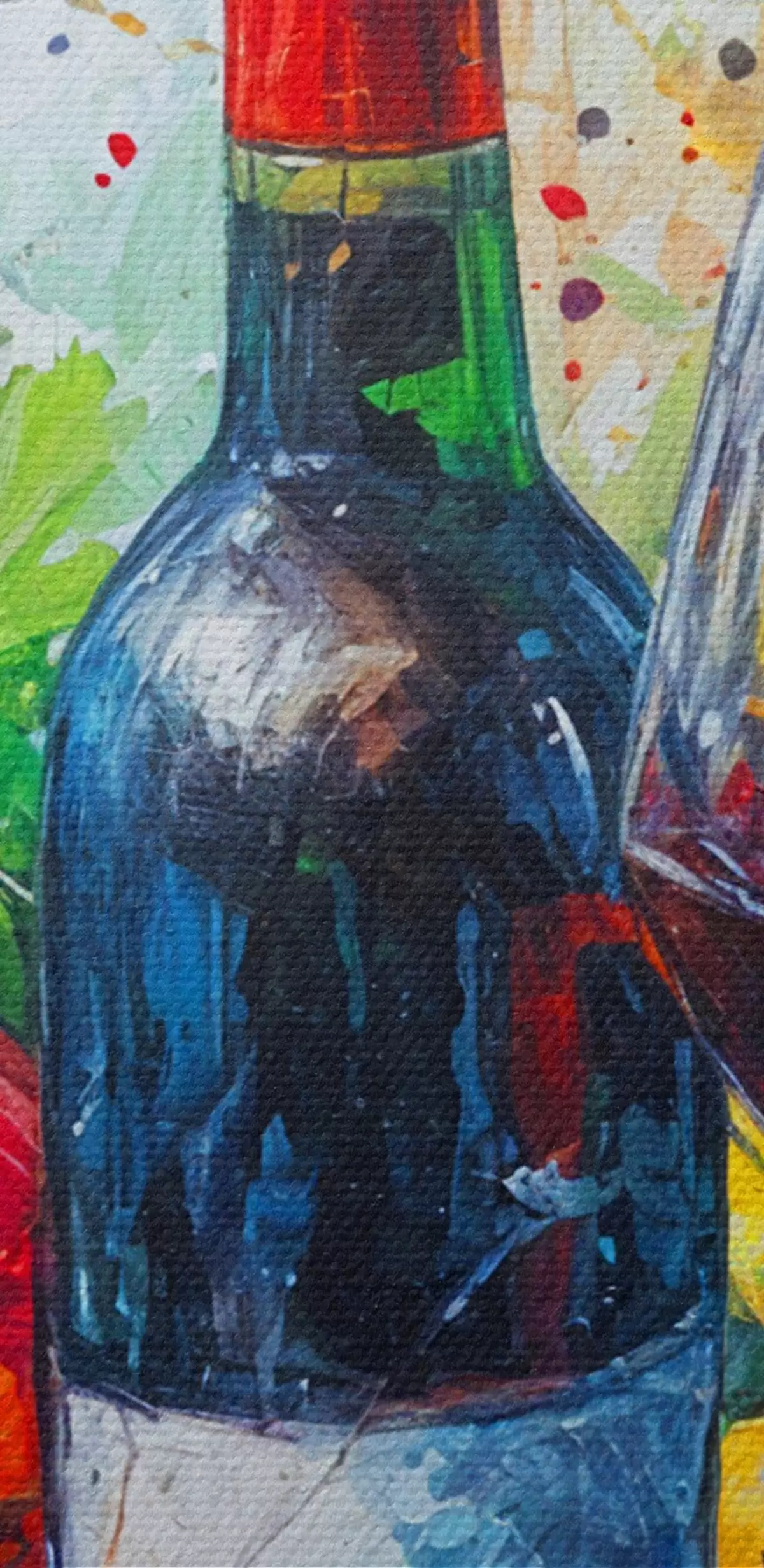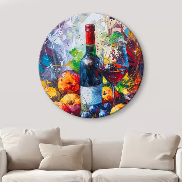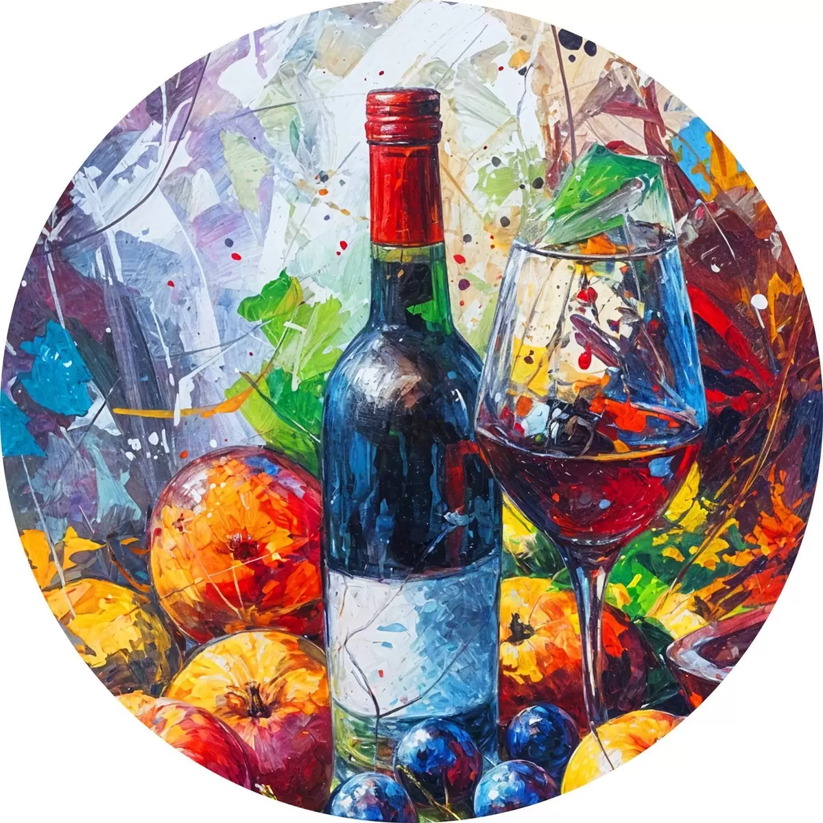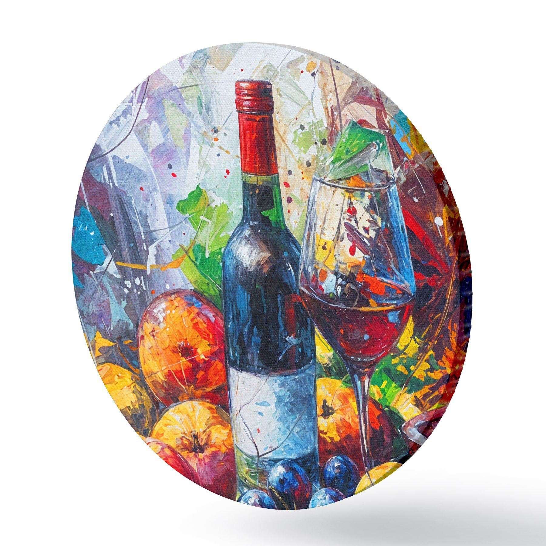 Runde Gemälde Abstraktes Stillleben mit einer Flasche Wein, einem Glas Wein und bunten Früchten mit Spritzern in verschiedenen Farben r38958