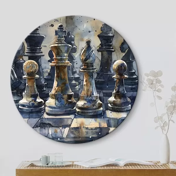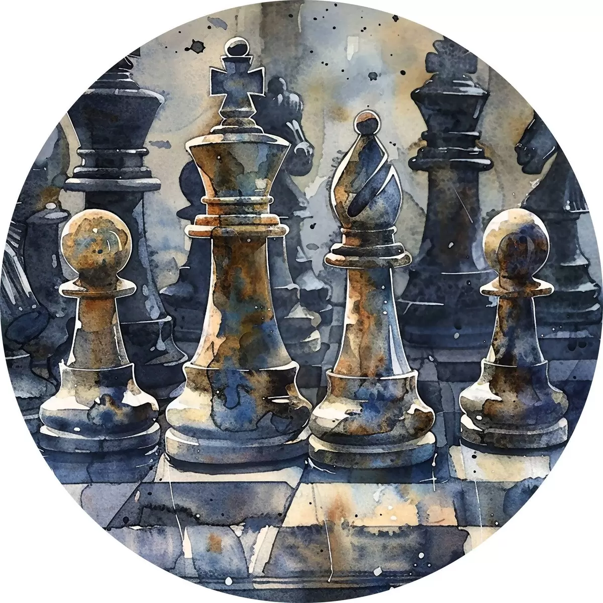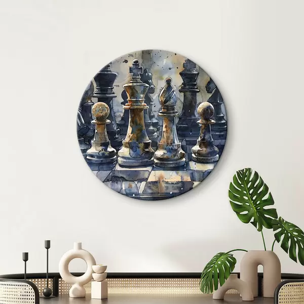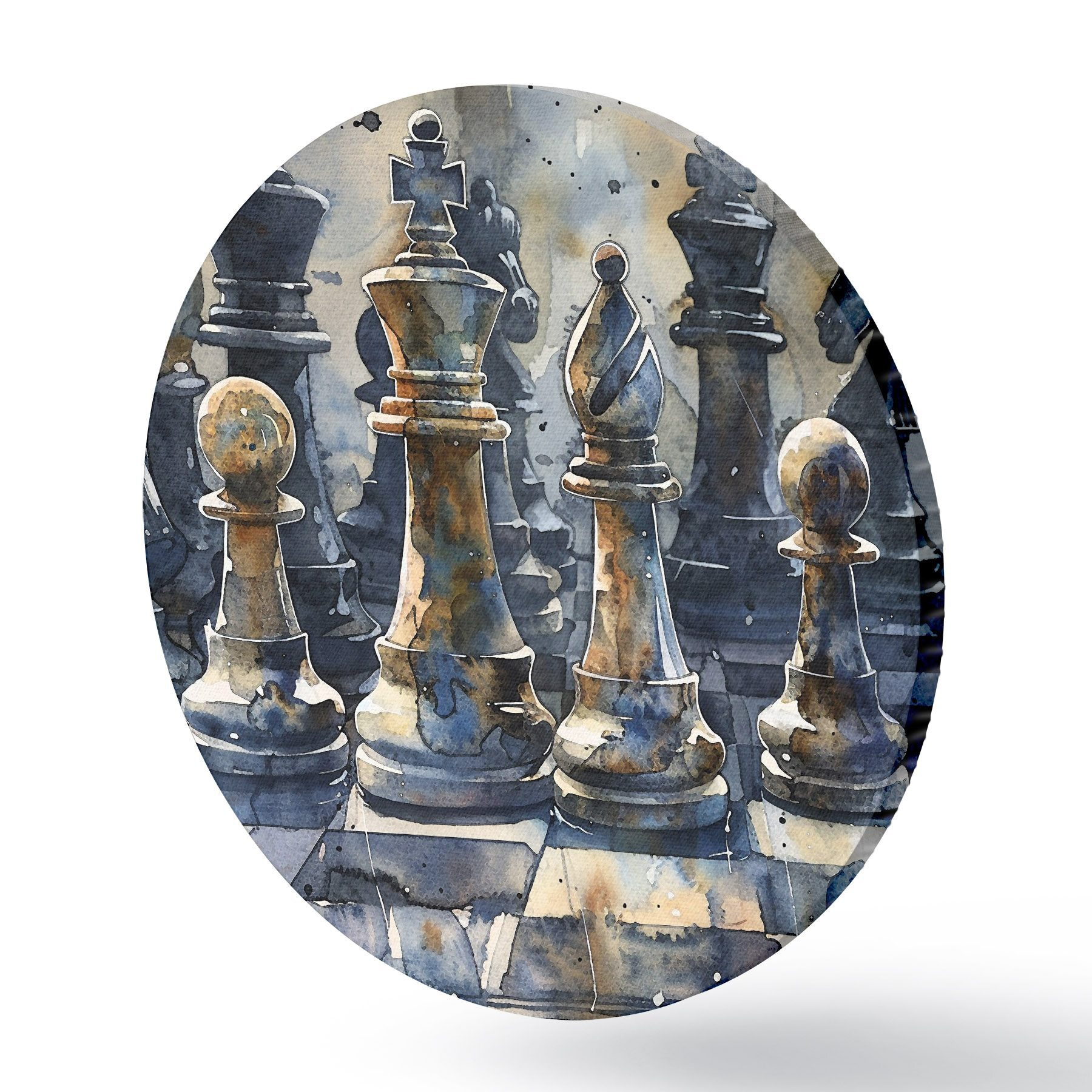 Runde Gemälde Aquarellmalerei, Nahaufnahme eines Schachspiels aus Metall oder Stein, mit detaillierten Designs und Texturen r38960