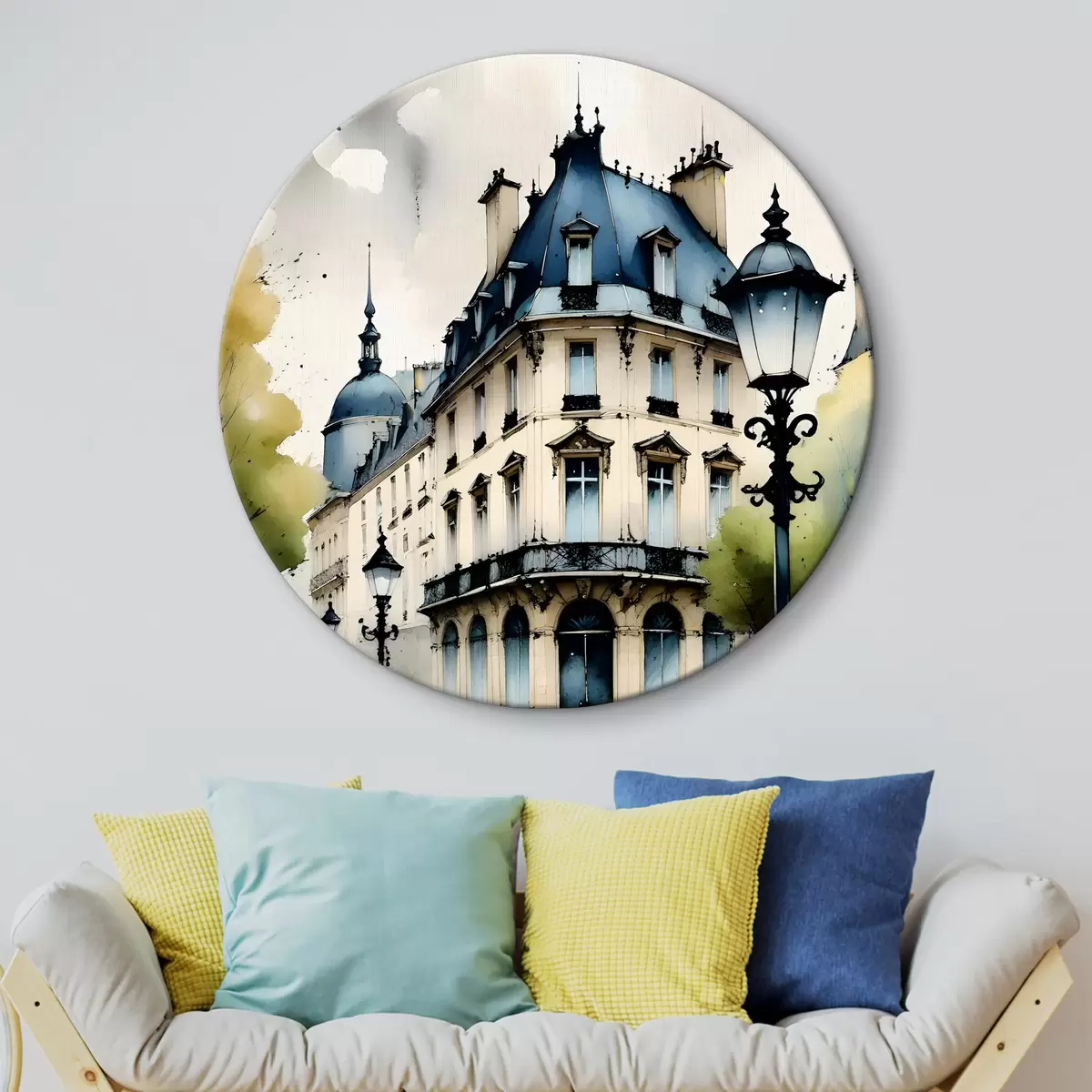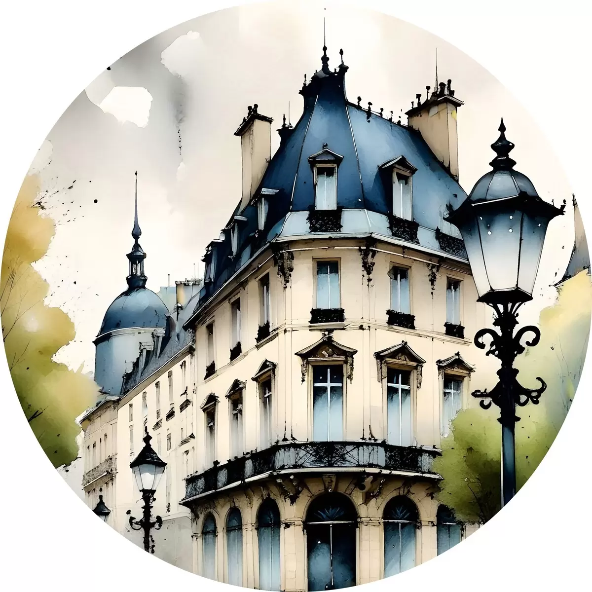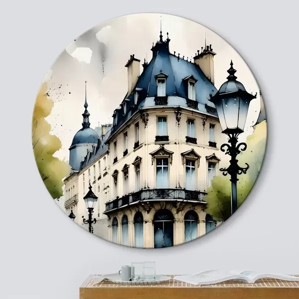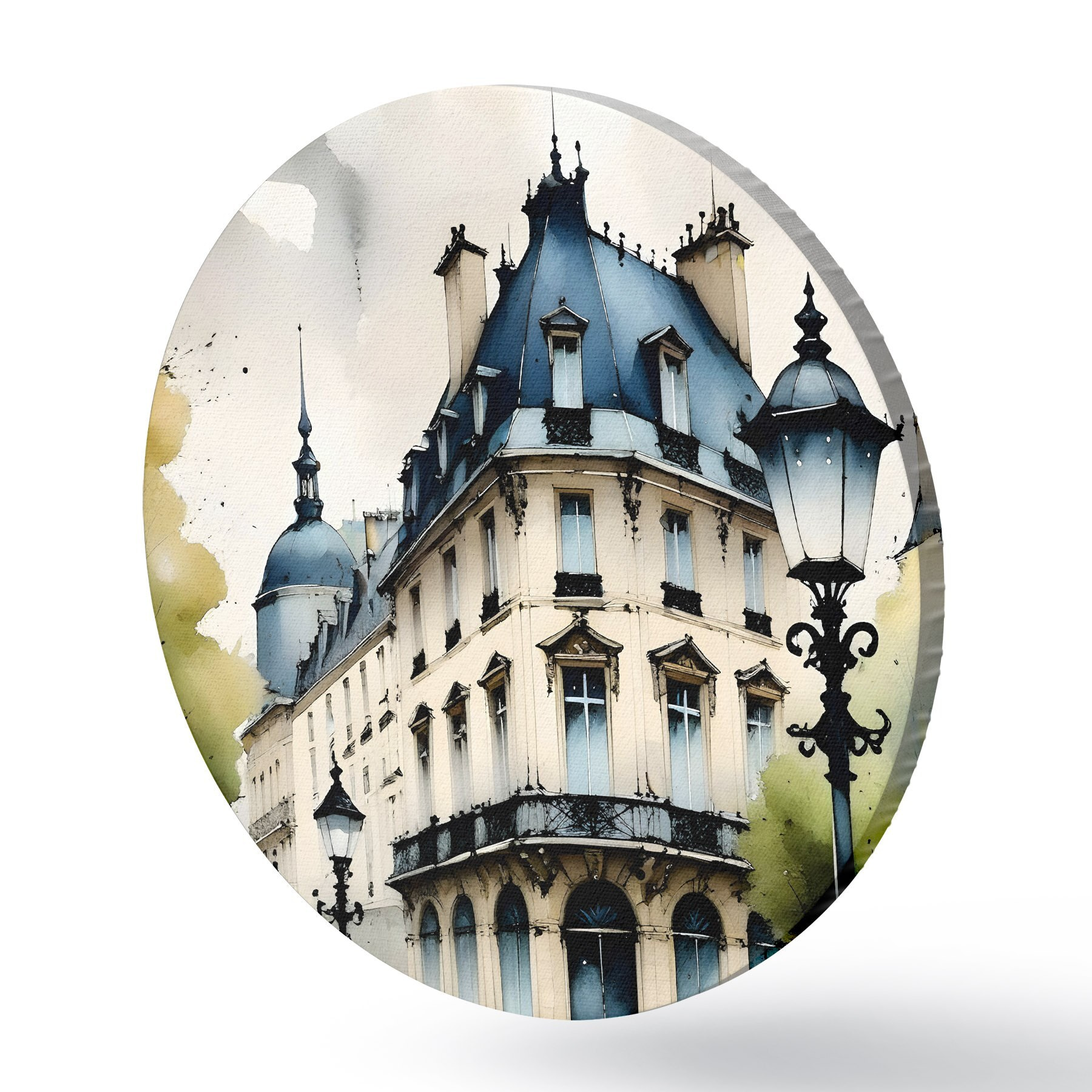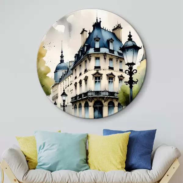 Runde Gemälde Aquarellmalerei eines historischen Gebäudes mit geschwungener Fassade und dekorativen architektonischen Elementen r38975