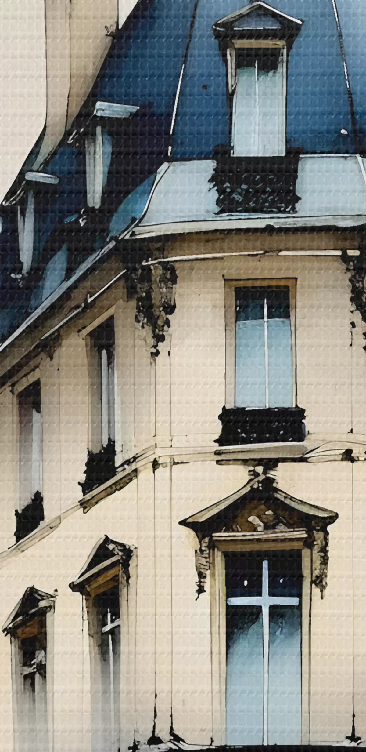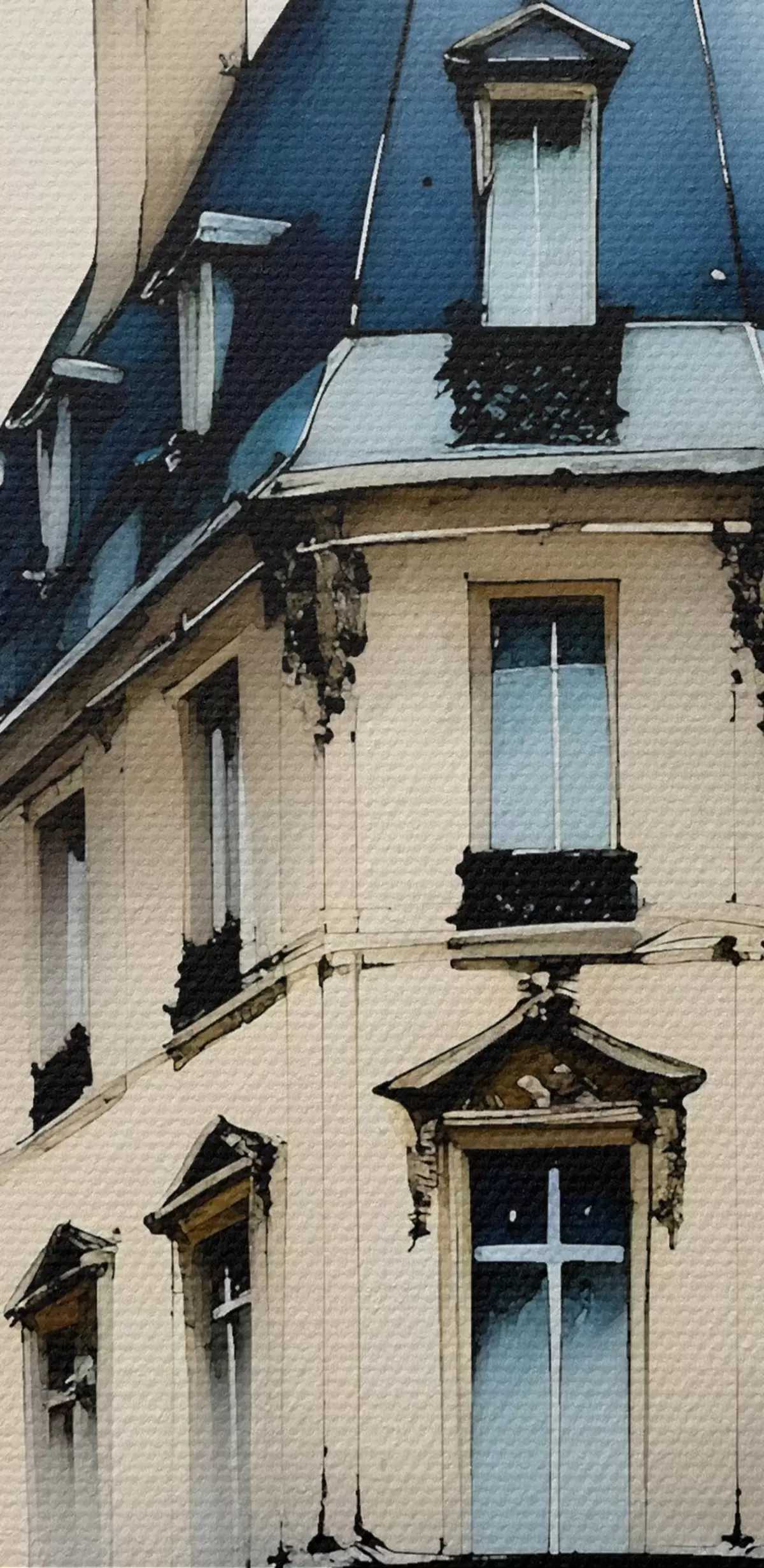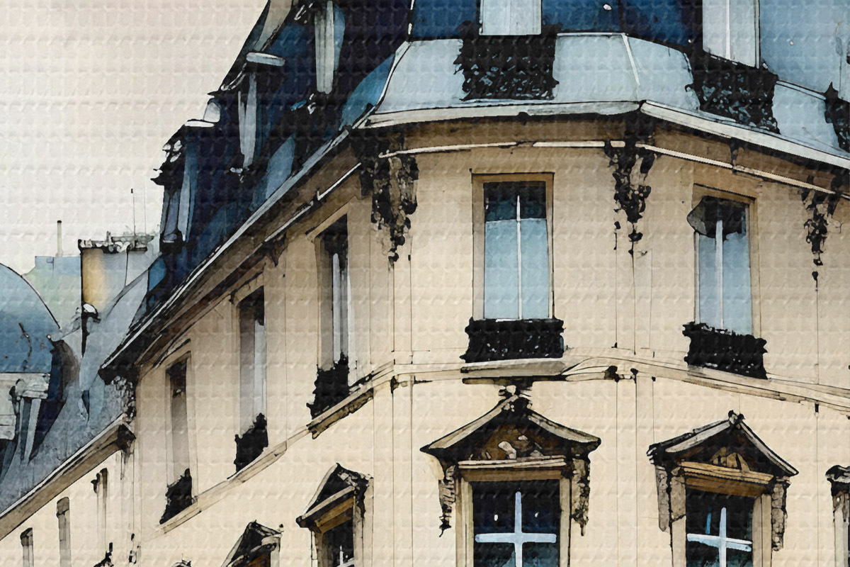 Bild Aquarellmalerei eines historischen Gebäudes mit geschwungener Fassade und dekorativen architektonischen Elementen Nr r38975