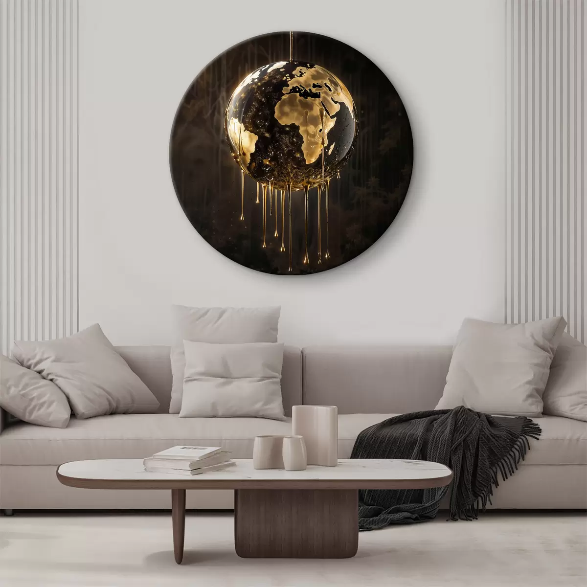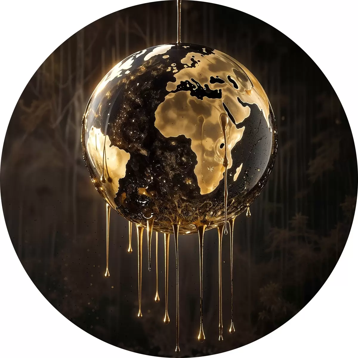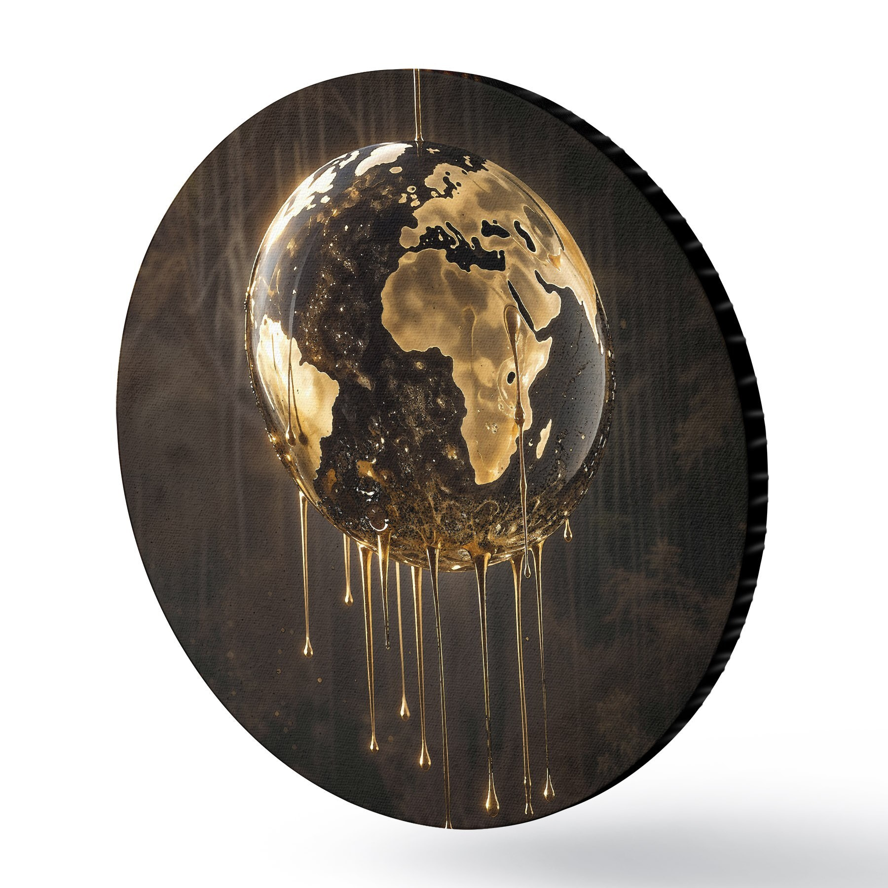 Runde Gemälde Ein glühender Globus, der die Erde inmitten einer tropfenden Flüssigkeit vor einem dunklen Hintergrund darstellt r38983