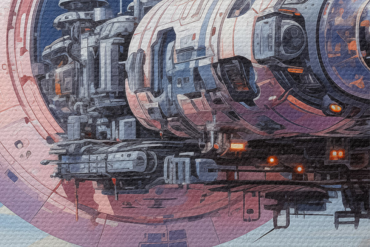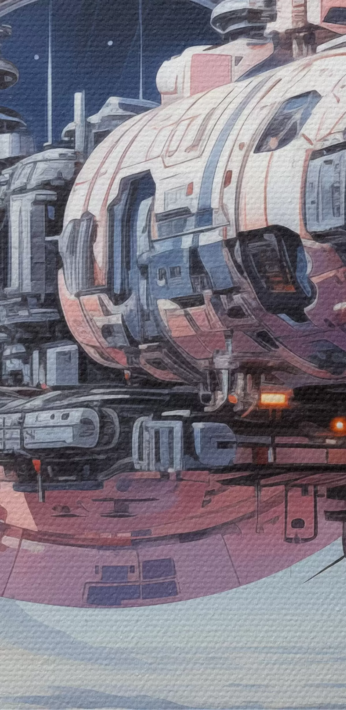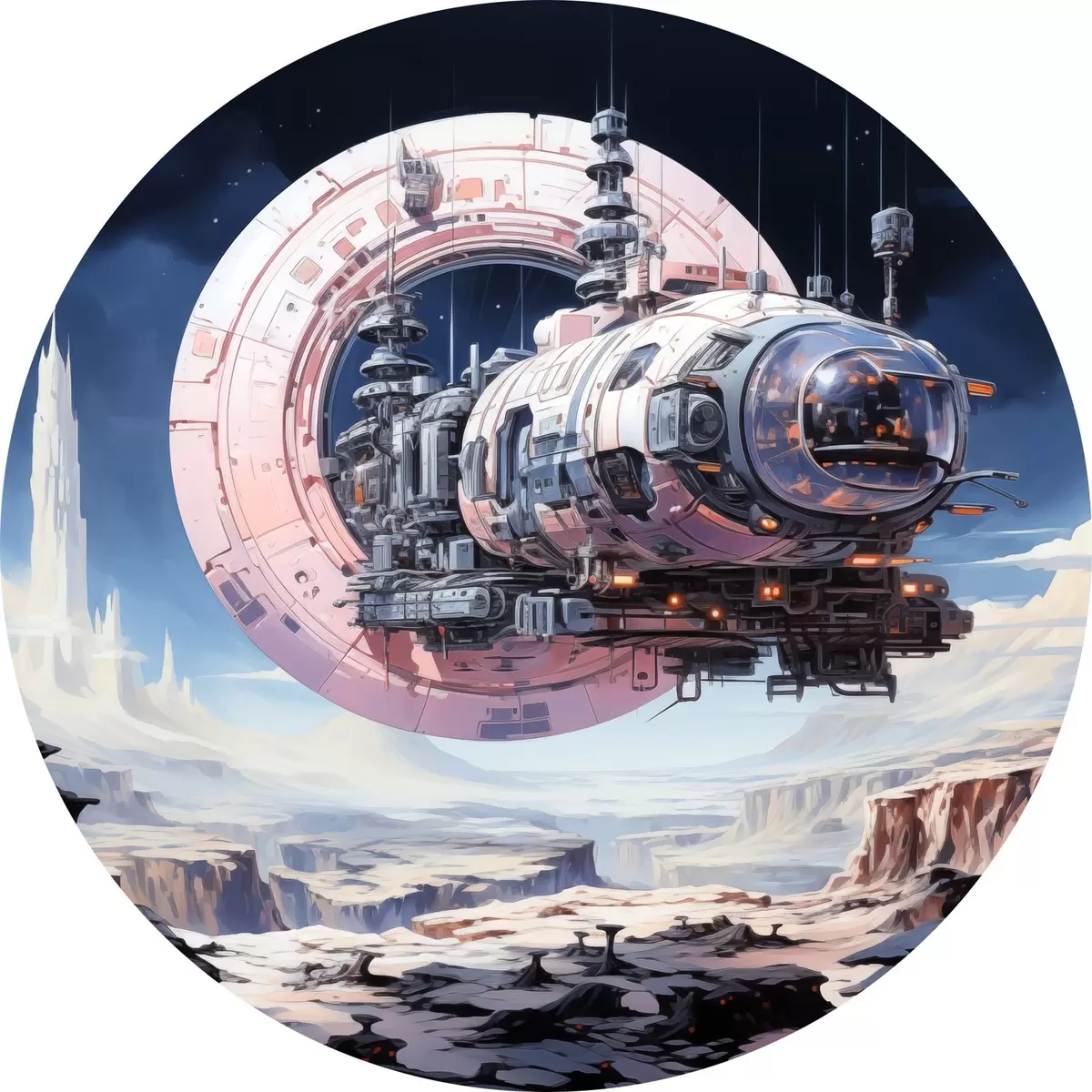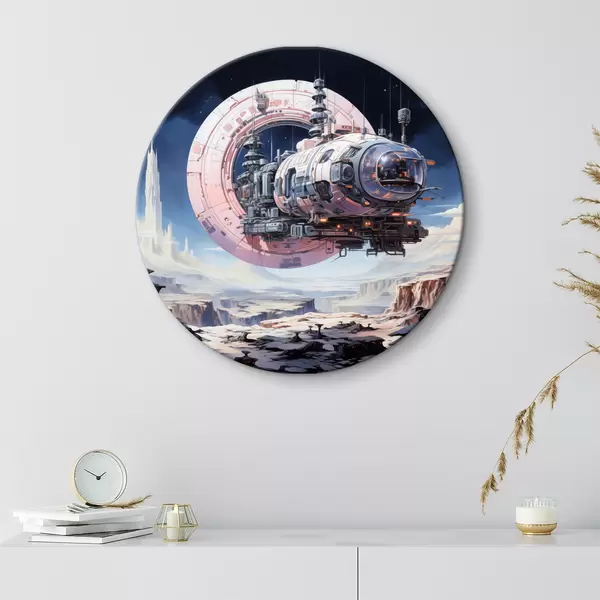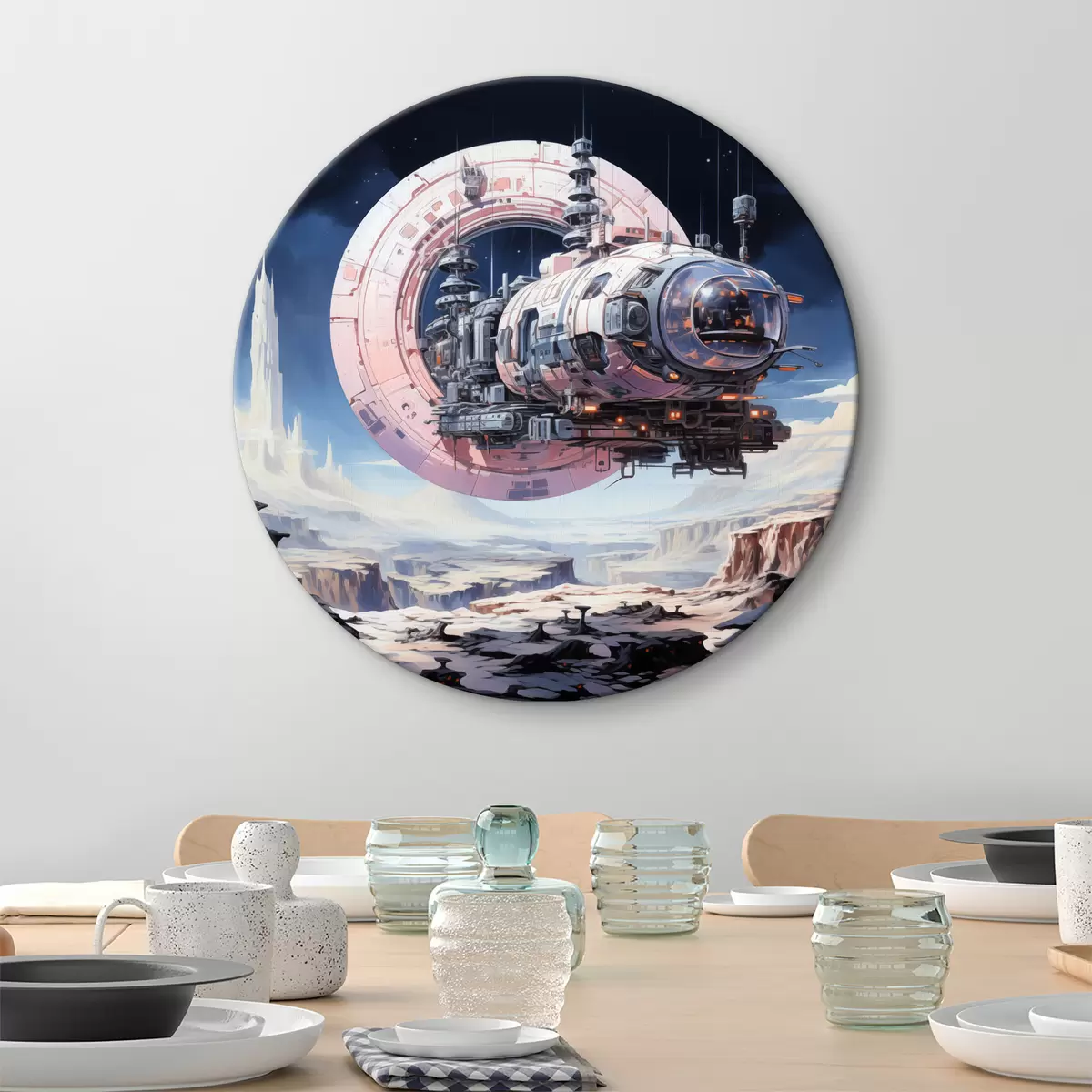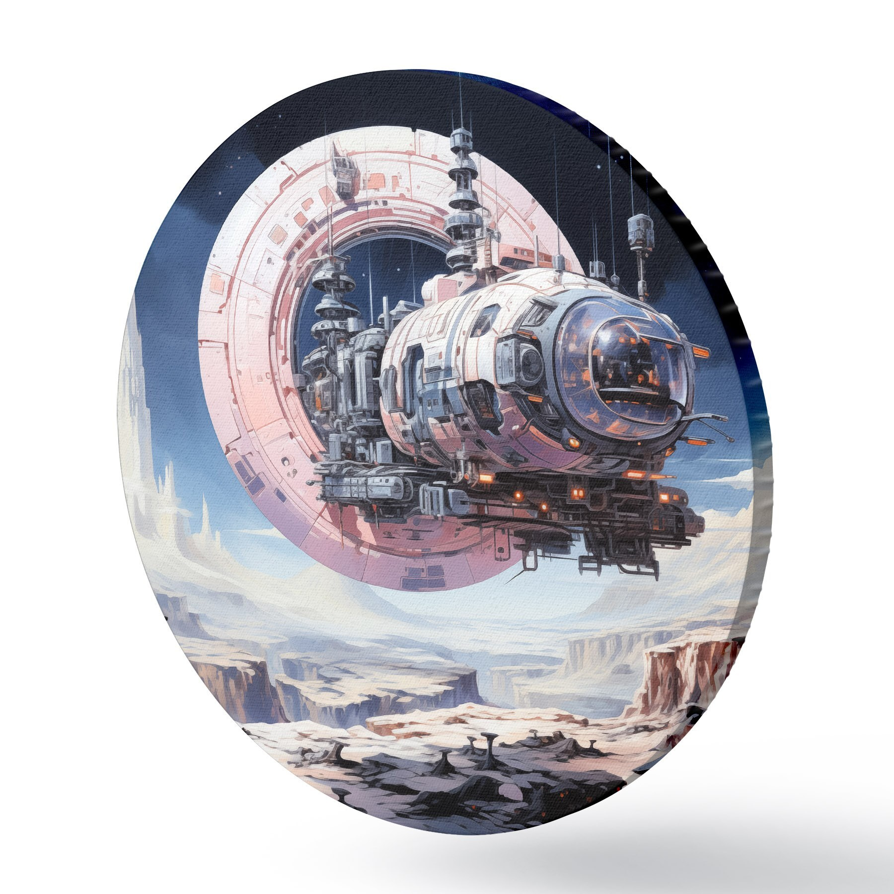 Runde Gemälde Ein Raumschiff im Cyberpunk-Stil fliegt im Weltraum über einem Asteroiden und einem Planeten, Farbe: blau, beige, rosa, weiß r39115