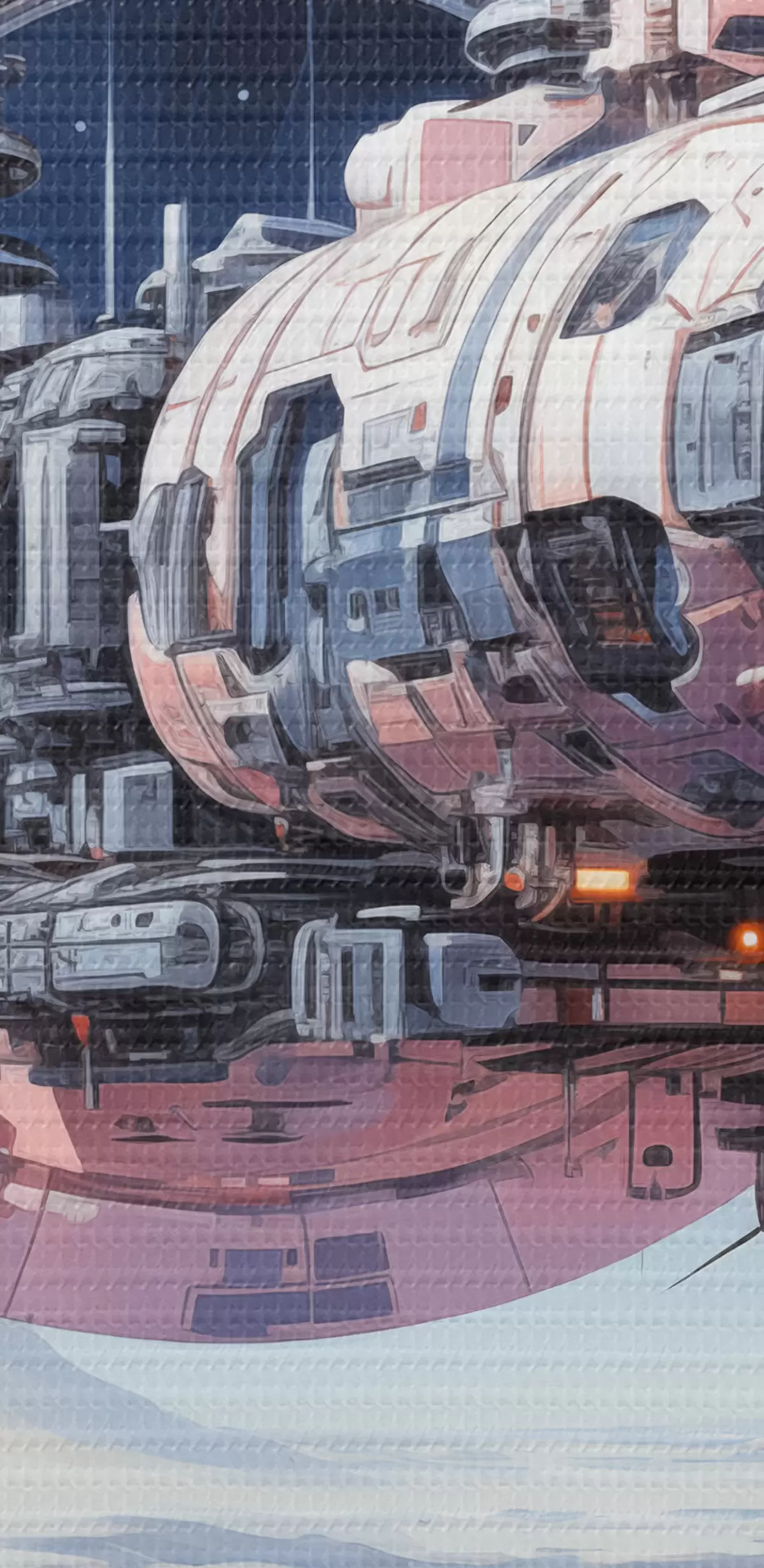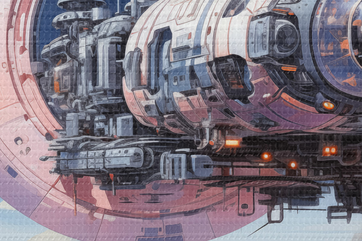 Bild Ein Raumschiff im Cyberpunk-Stil fliegt im Weltraum über einem Asteroiden und einem Planeten, Farbe: blau, beige, rosa, weiß Nr r39115
