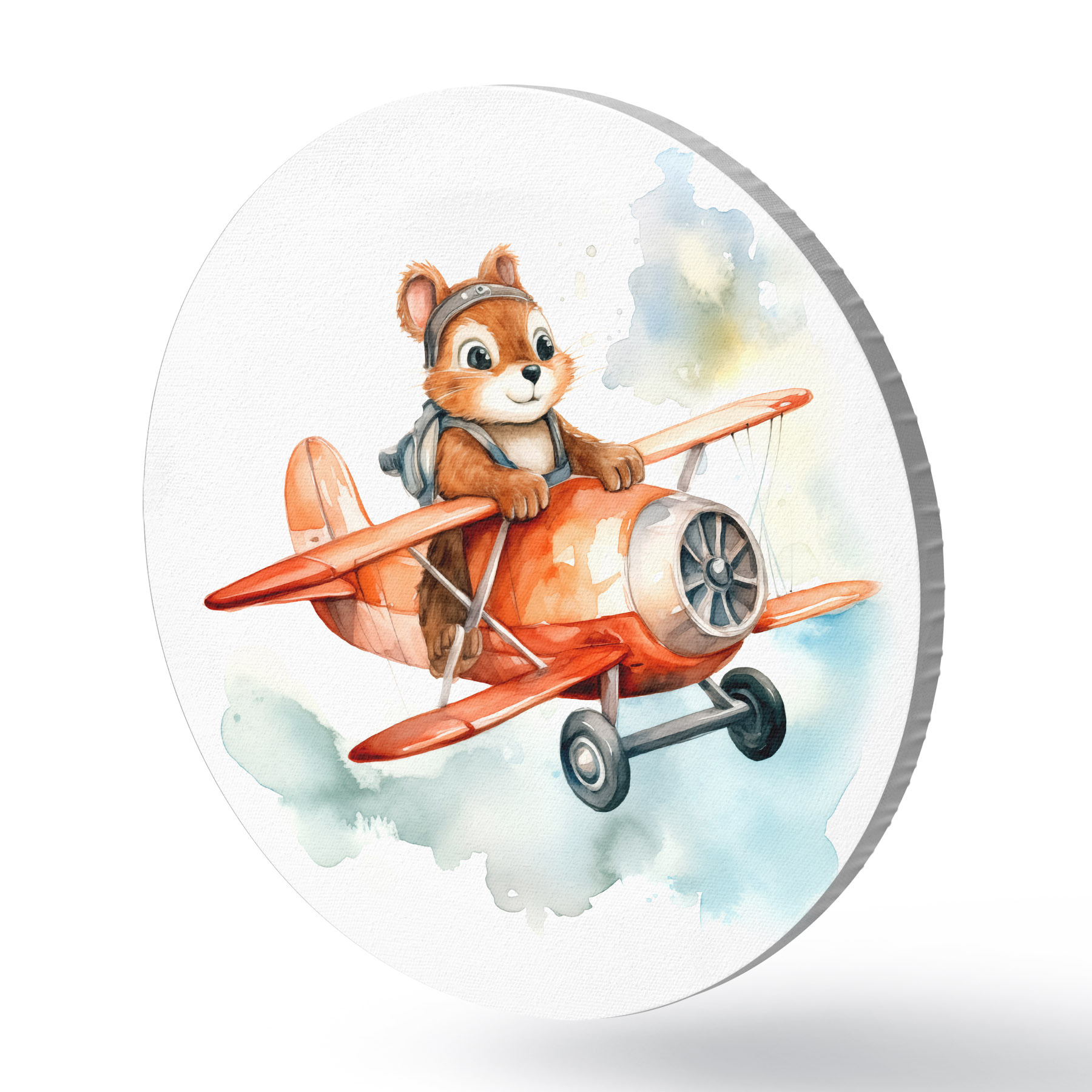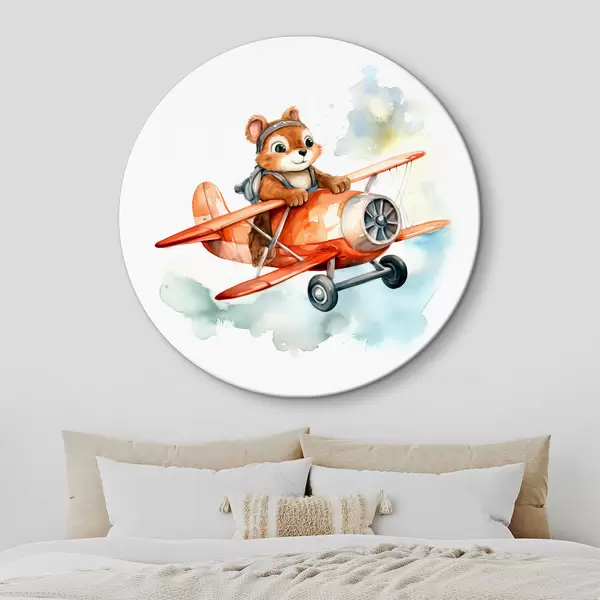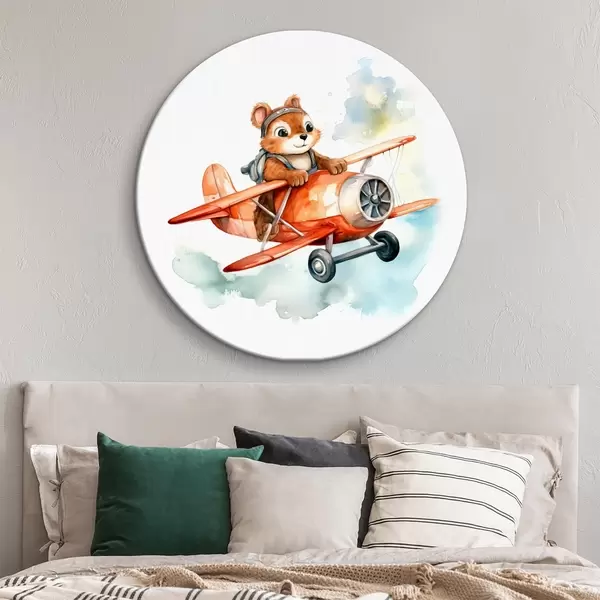 Runde Gemälde Baby-Eichhörnchen fliegt in einem roten Flugzeug Kinder Illustration Aquarell r39116