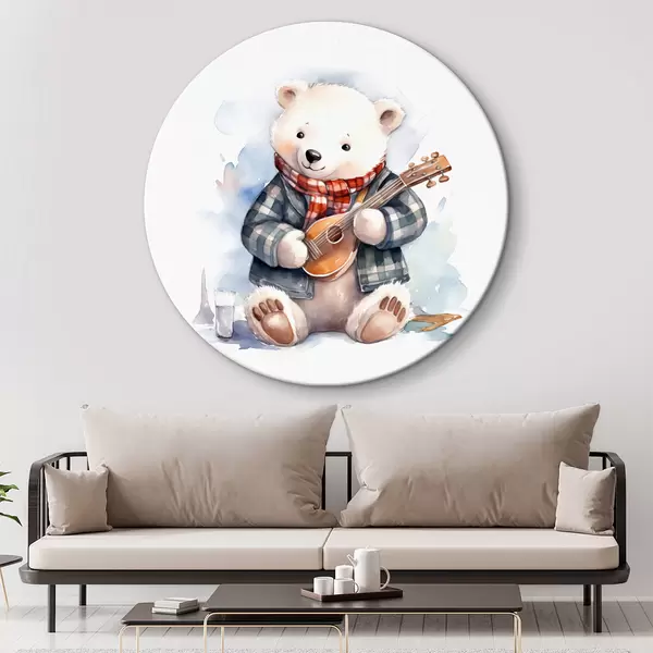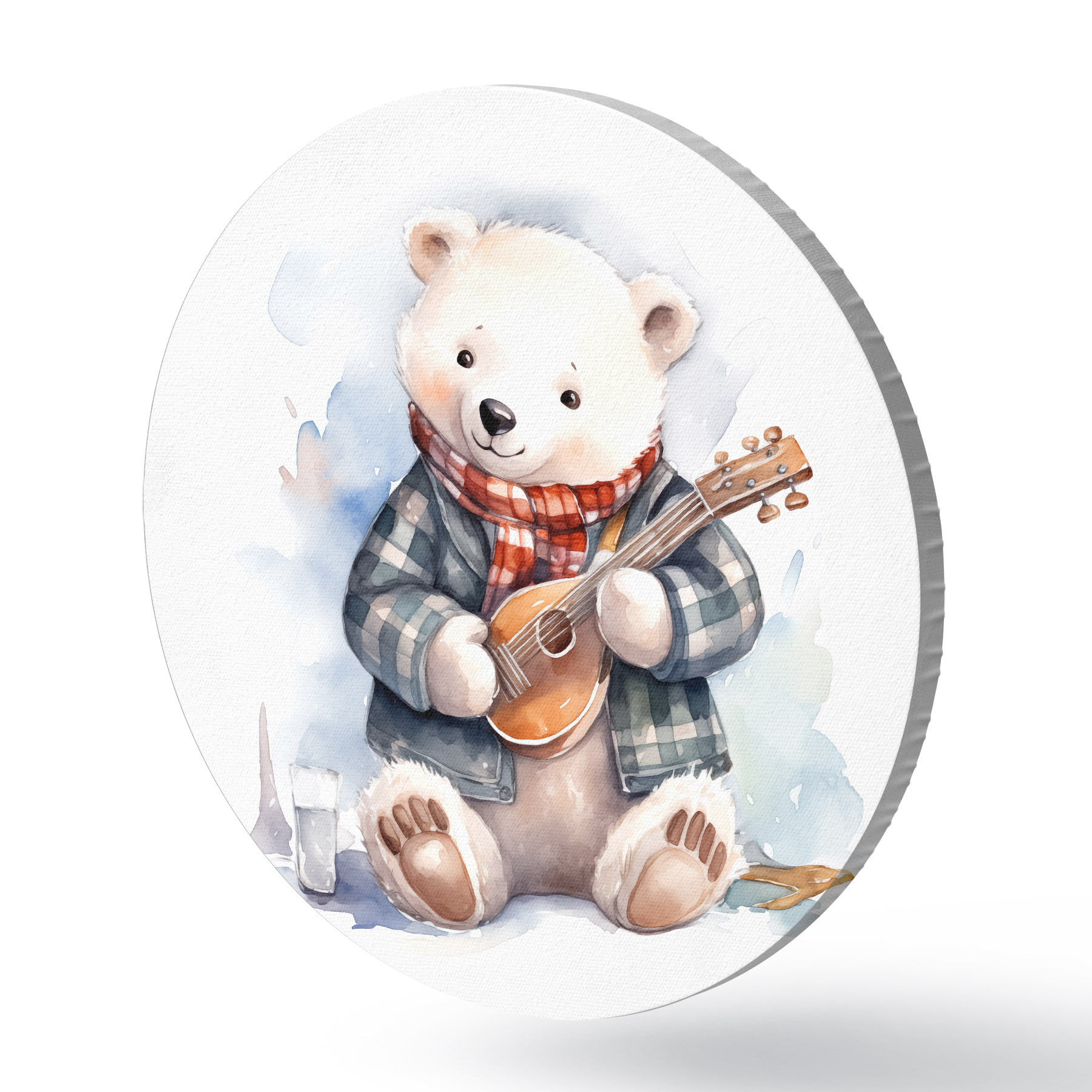 Runde Gemälde Eisbär-Musiker in blau kariertem Anzug und rotem Schal spielt Gitarre, Aquarell-Illustration für Kinder r39120