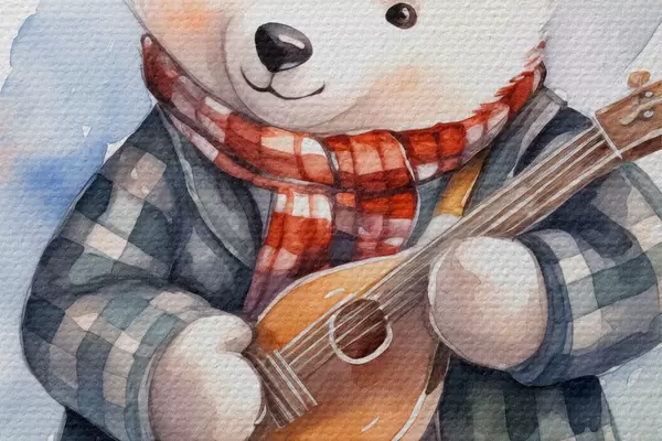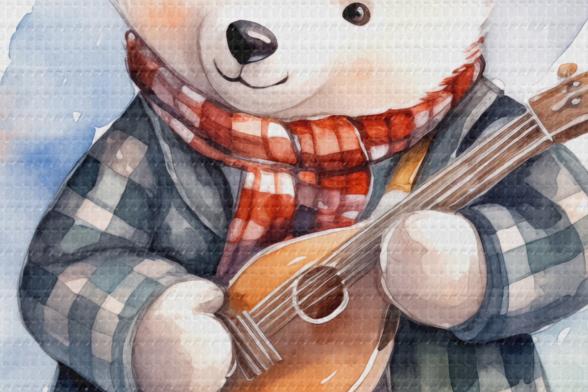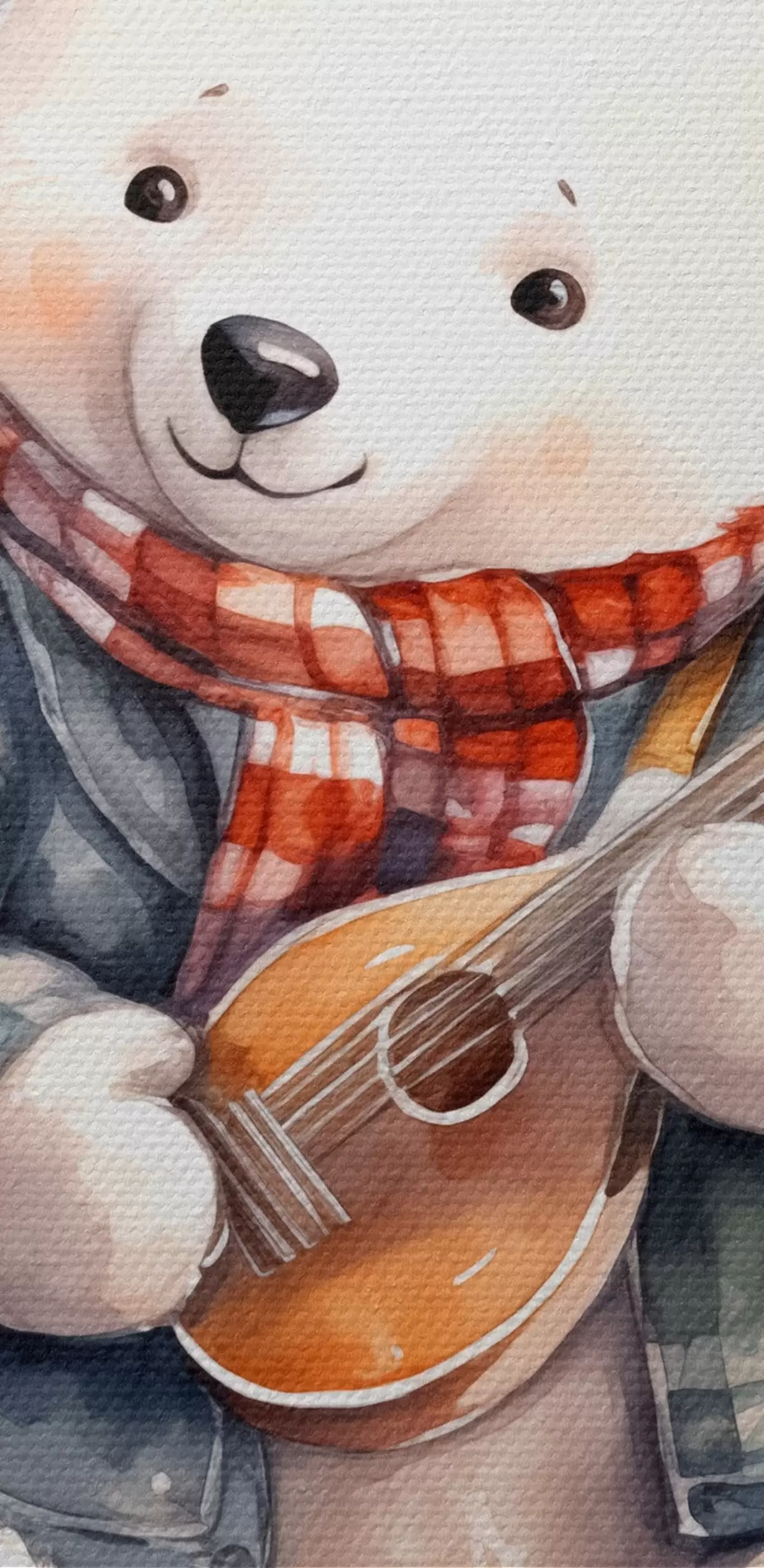 Bild Eisbär-Musiker in blau kariertem Anzug und rotem Schal spielt Gitarre, Aquarell-Illustration für Kinder Nr r39120