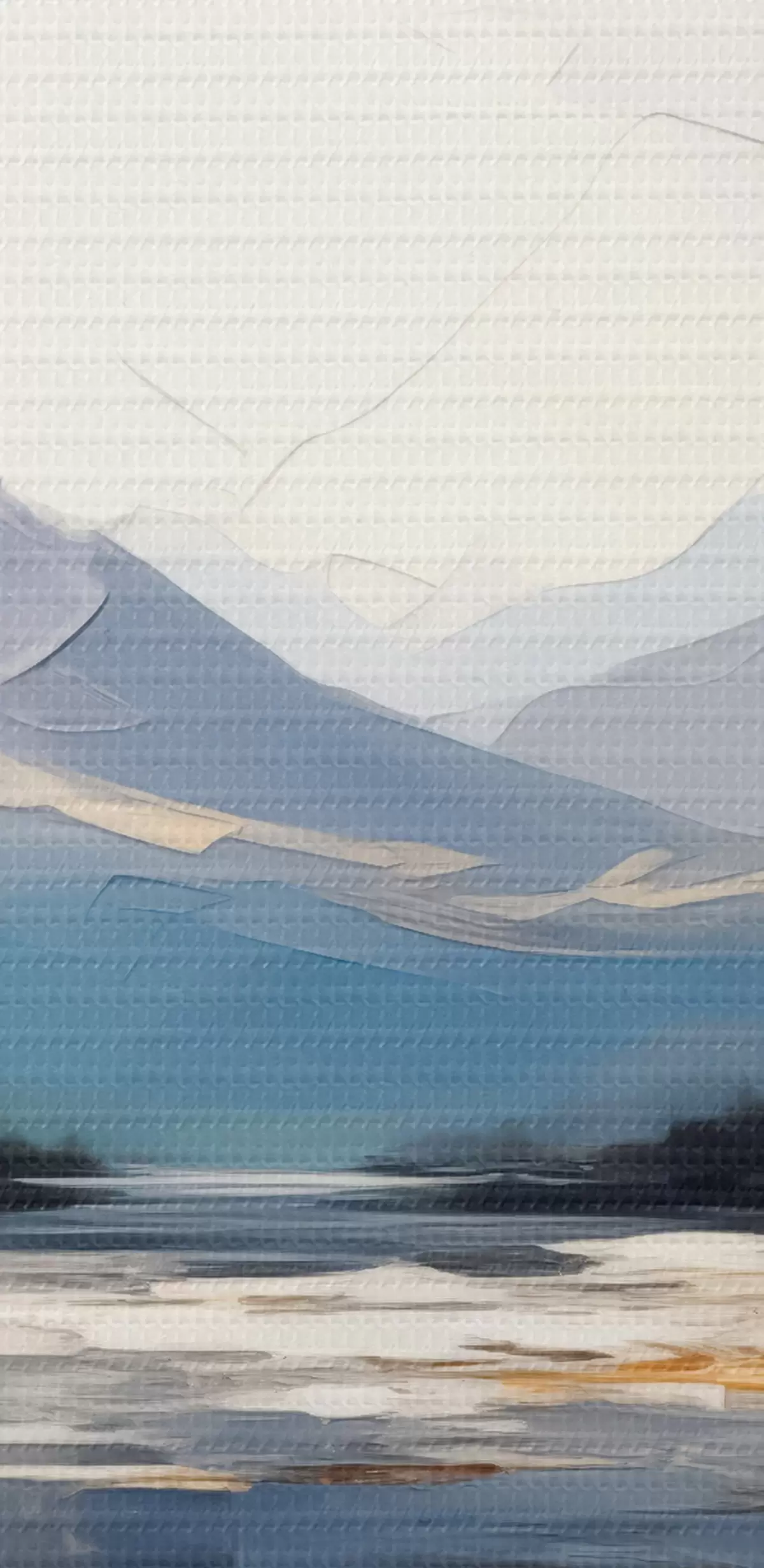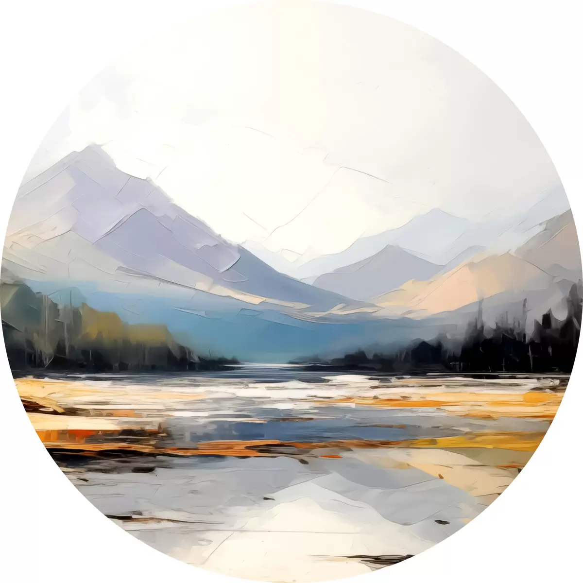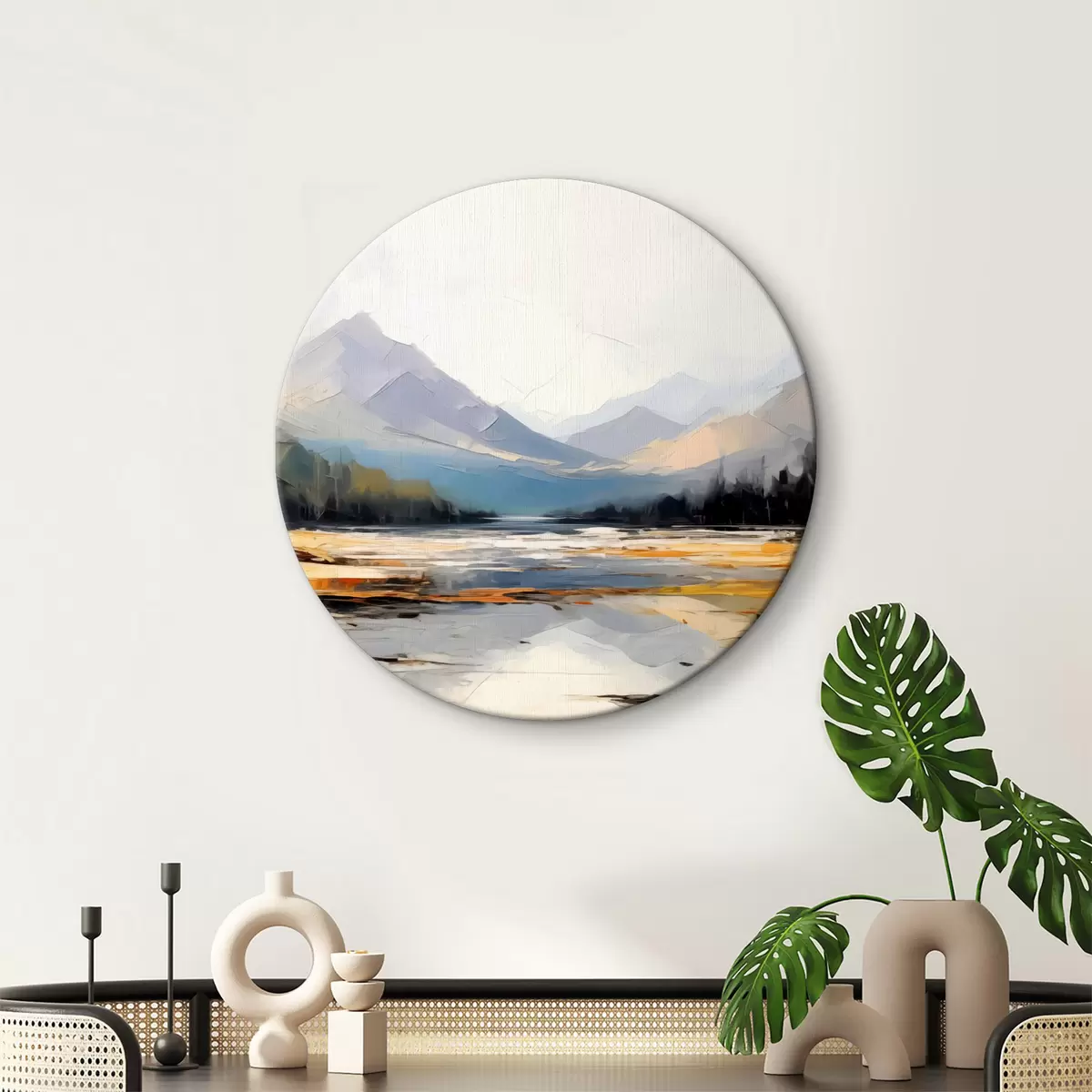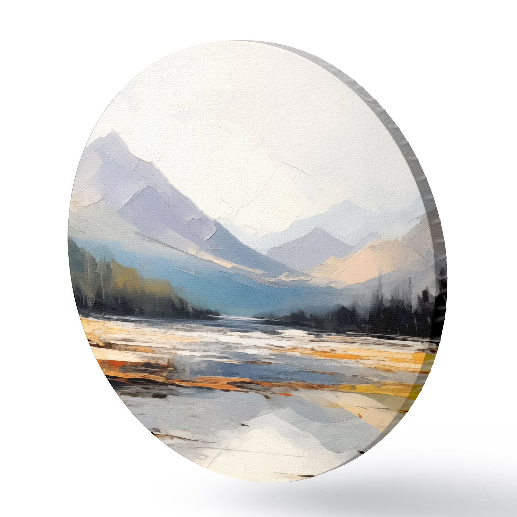 Runde Gemälde Bergketten im Tal Ölgemälde, Landschaft, Natur, blau, weiß, gelb Farbe r39128