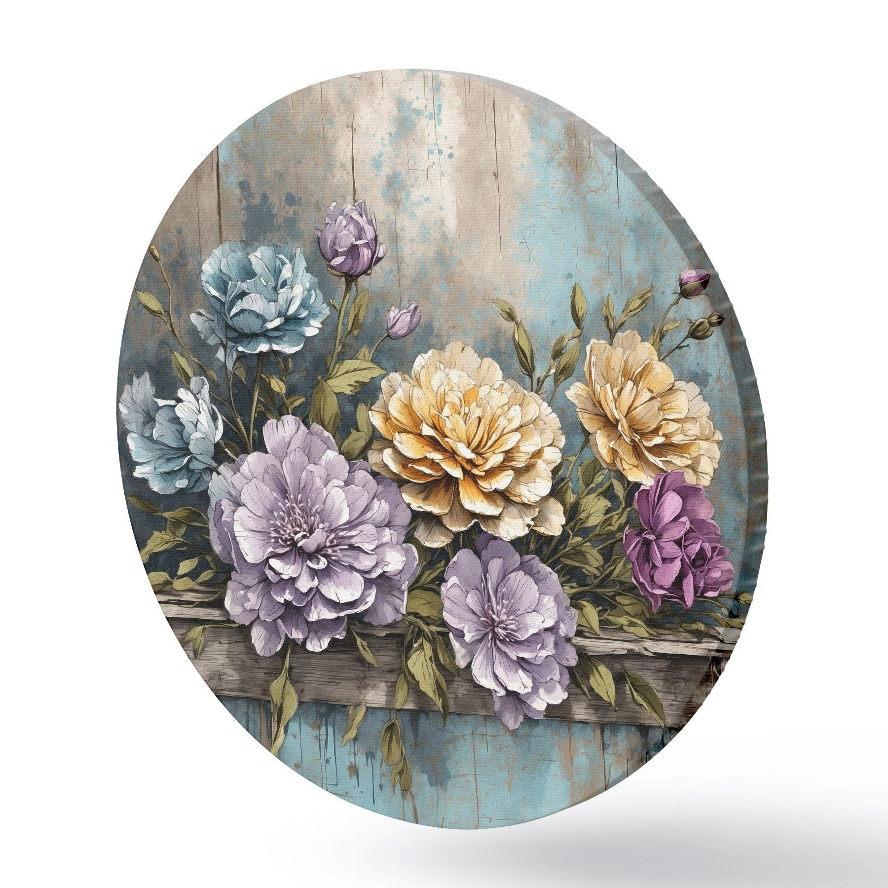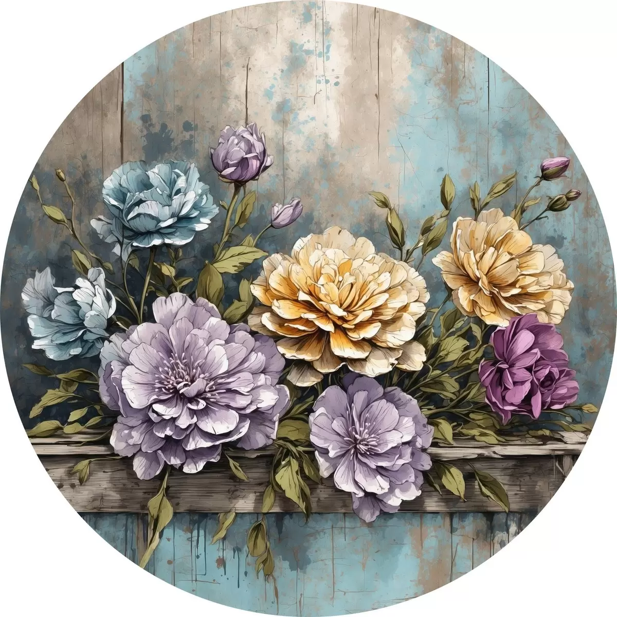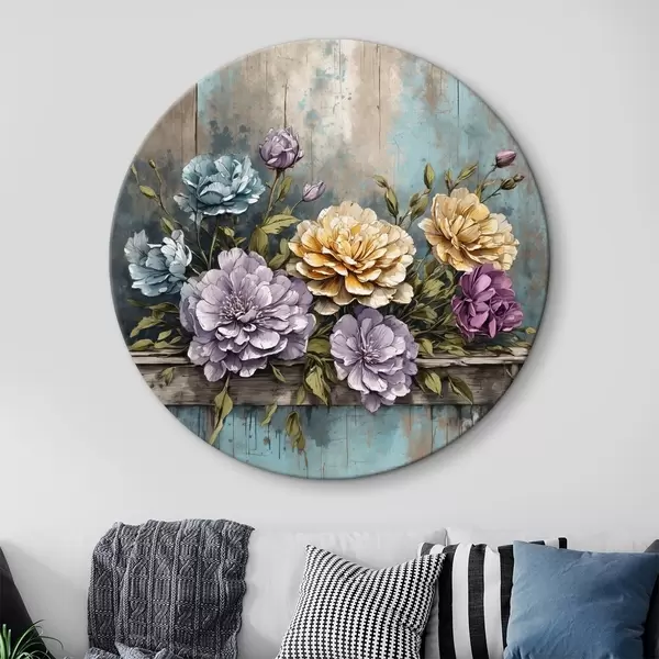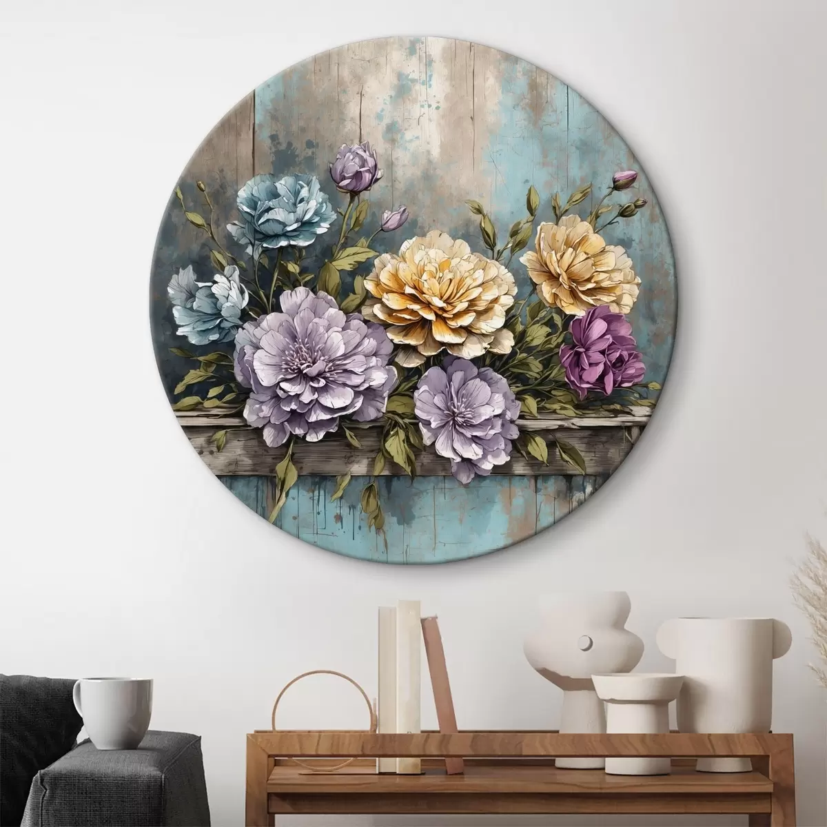 Runde Gemälde Blumen und Blätter auf altem Holzregal r39169
