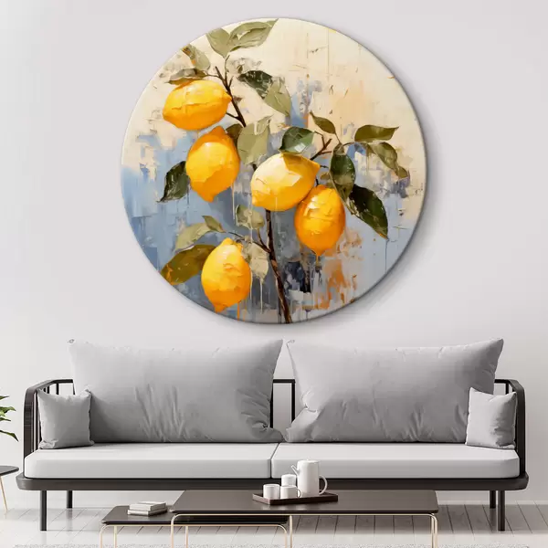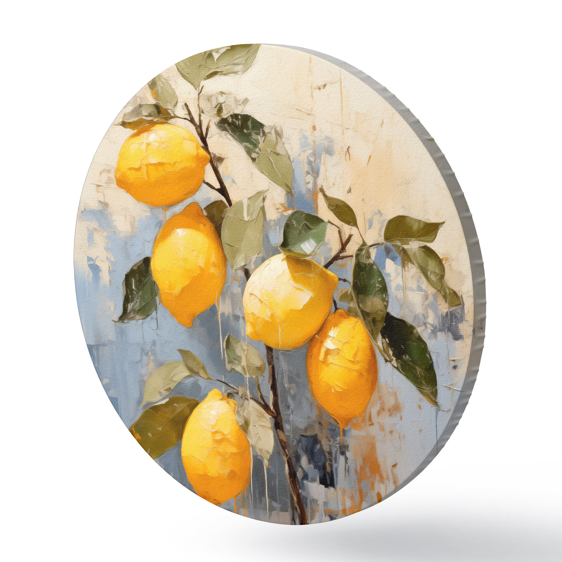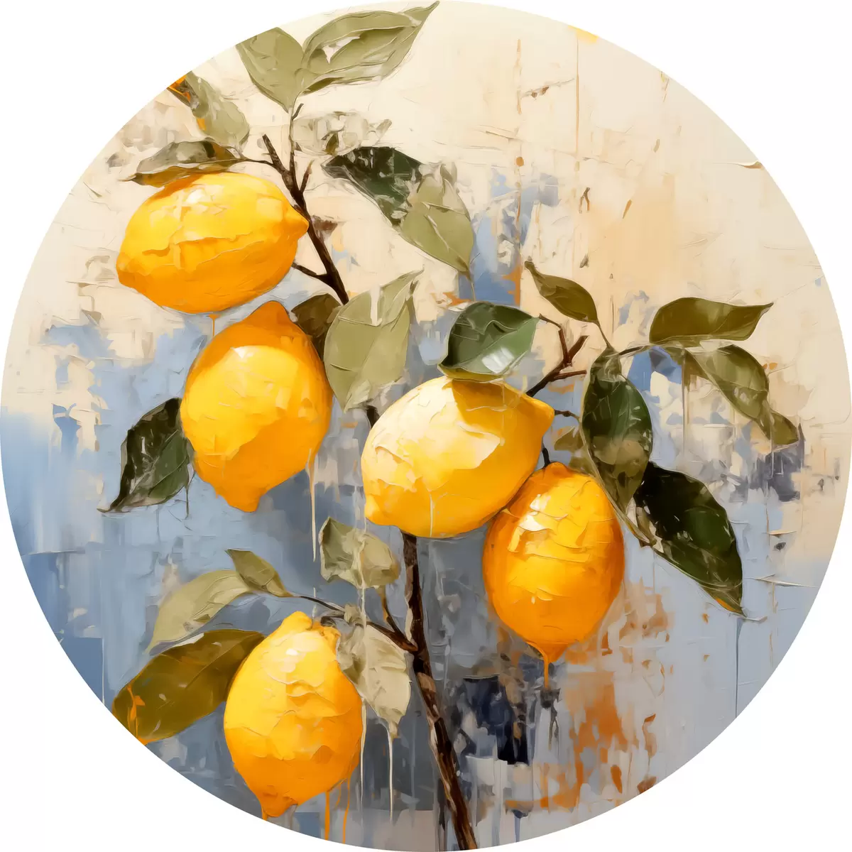 Runde Gemälde Zweig mit reifen Zitronen Ölgemälde abstrakte Kunst, gelb, blau und grün r39186