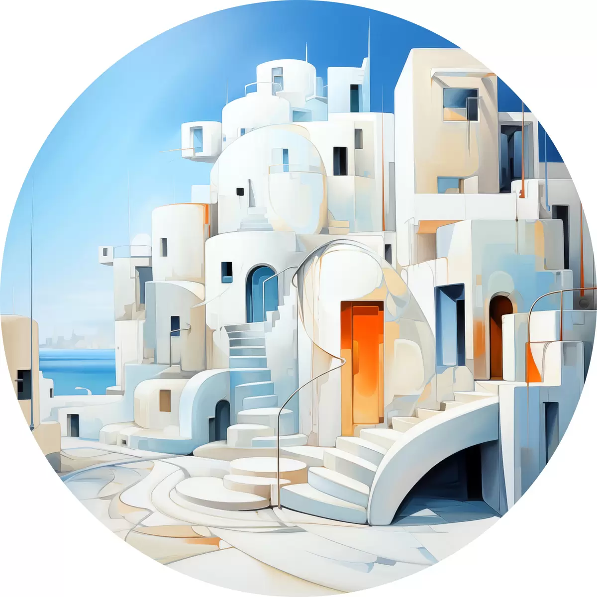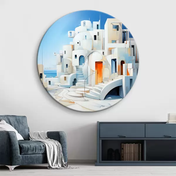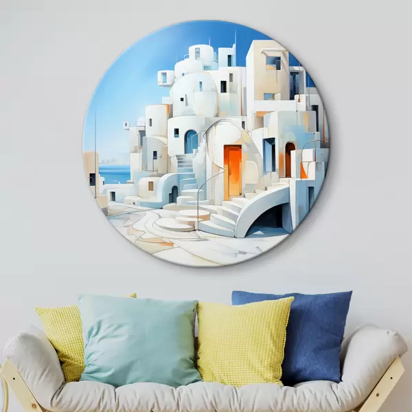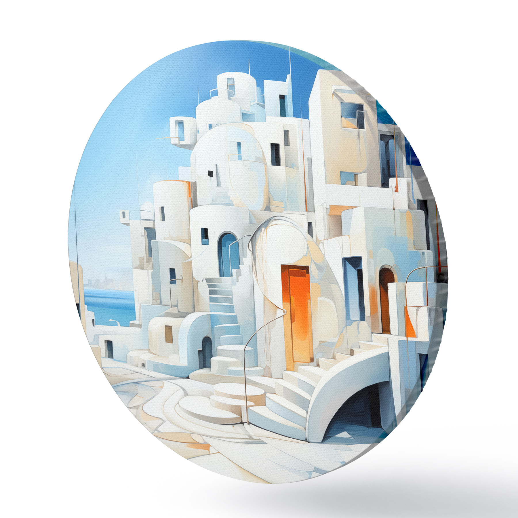 Runde Gemälde Abstrakte weiße Stadt am Meer, Architektur, Gebäude, blaue Farbe r39188