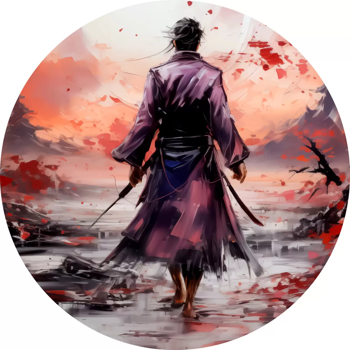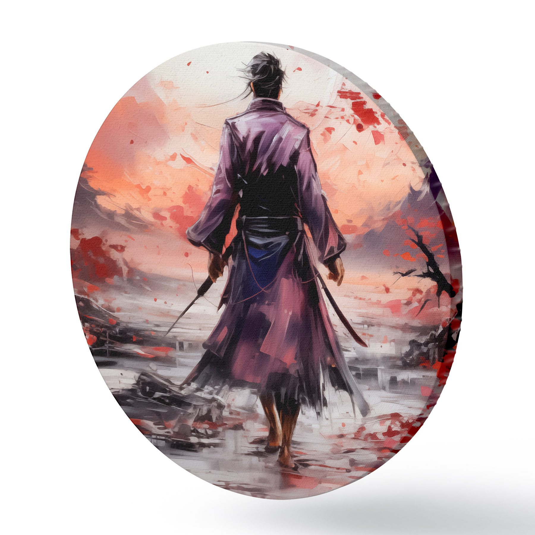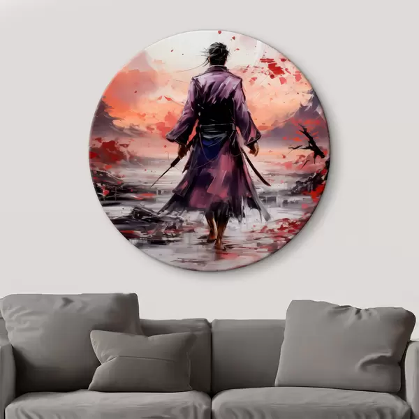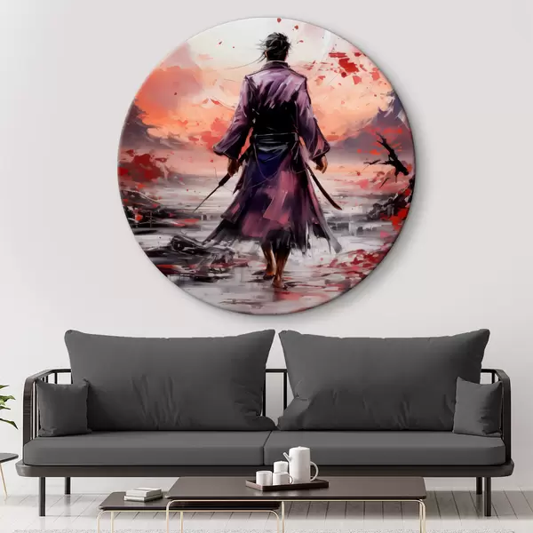 Runde Gemälde Ein Samurai mit einem Schwert in einem lila Mantel geht in Richtung der Berge abstrakte Kunst Malerei r39194