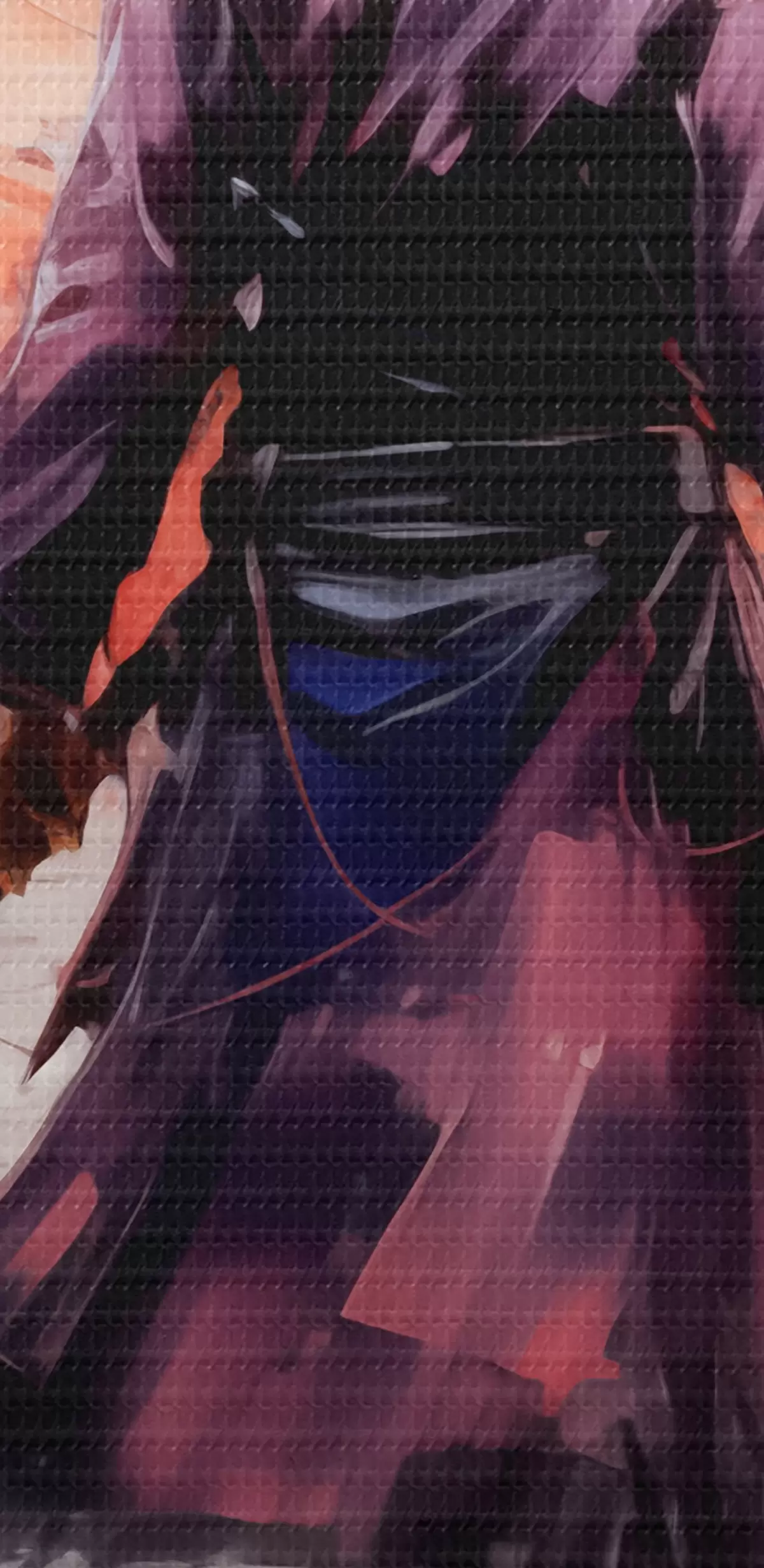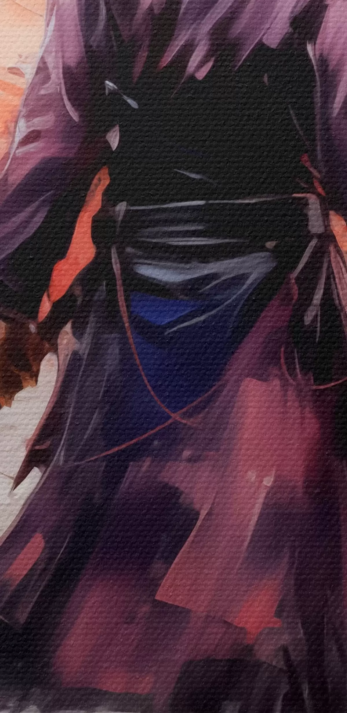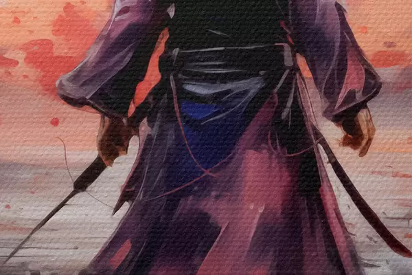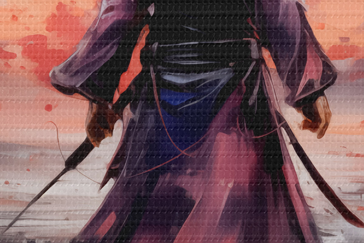 Bild Ein Samurai mit einem Schwert in einem lila Mantel geht in Richtung der Berge abstrakte Kunst Malerei Nr r39194