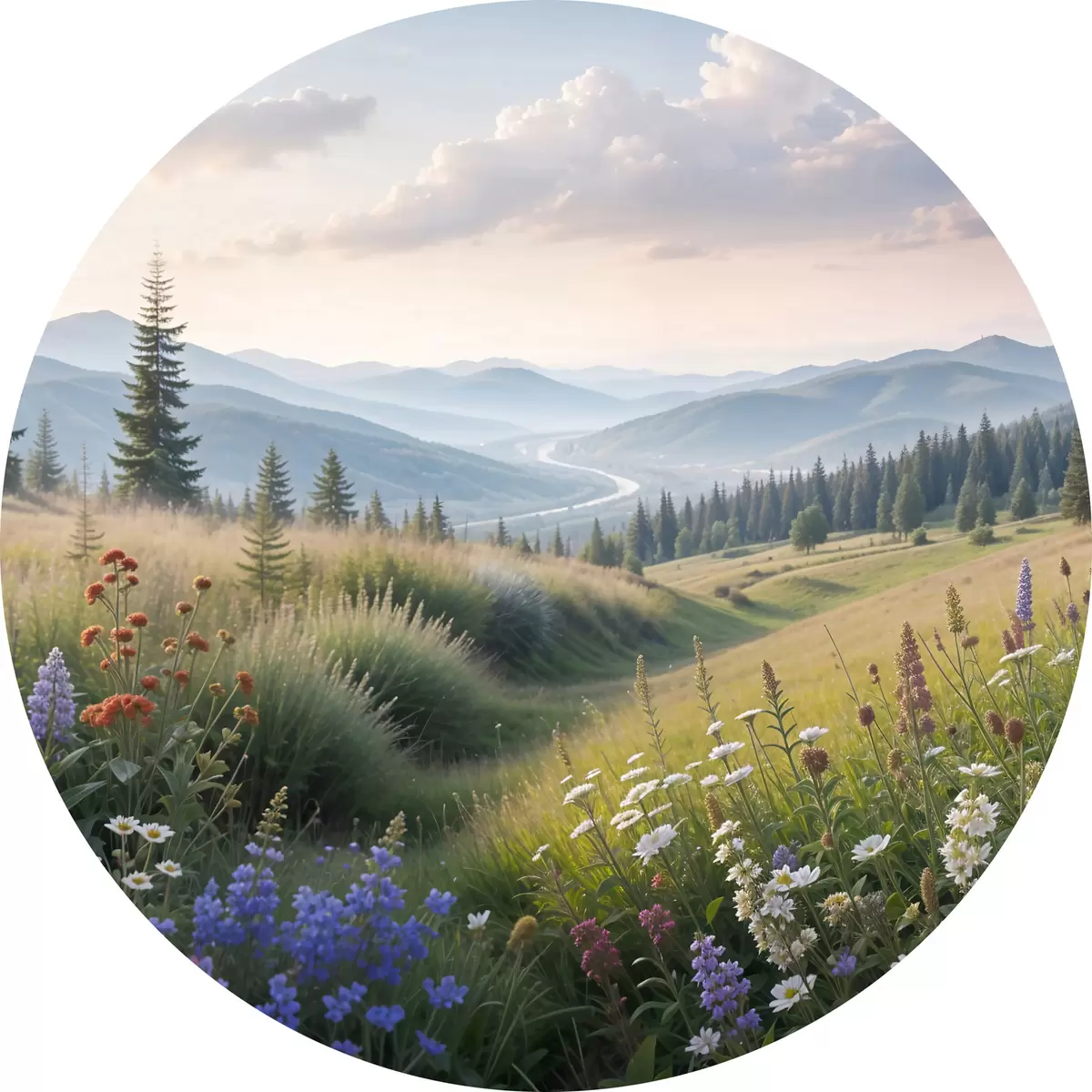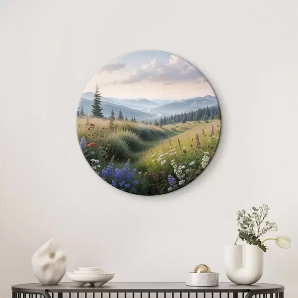 Runde Gemälde Berglandschaft mit einer Graswiese im Vordergrund voller bunter Wildblumen r39382