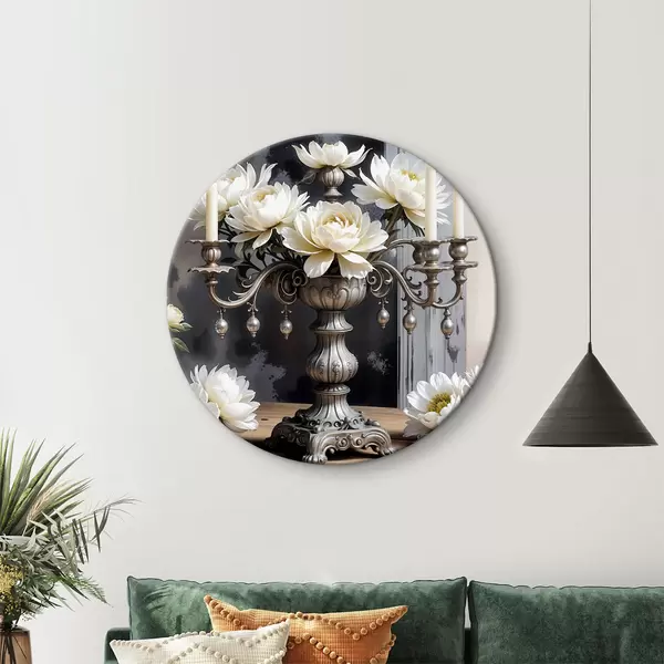 Runde Gemälde Ein Strauß großer weißer Dahlienblüten in einer verzierten silbernen Vase, umgeben von brennenden Kerzen auf einem Holztisch r39384