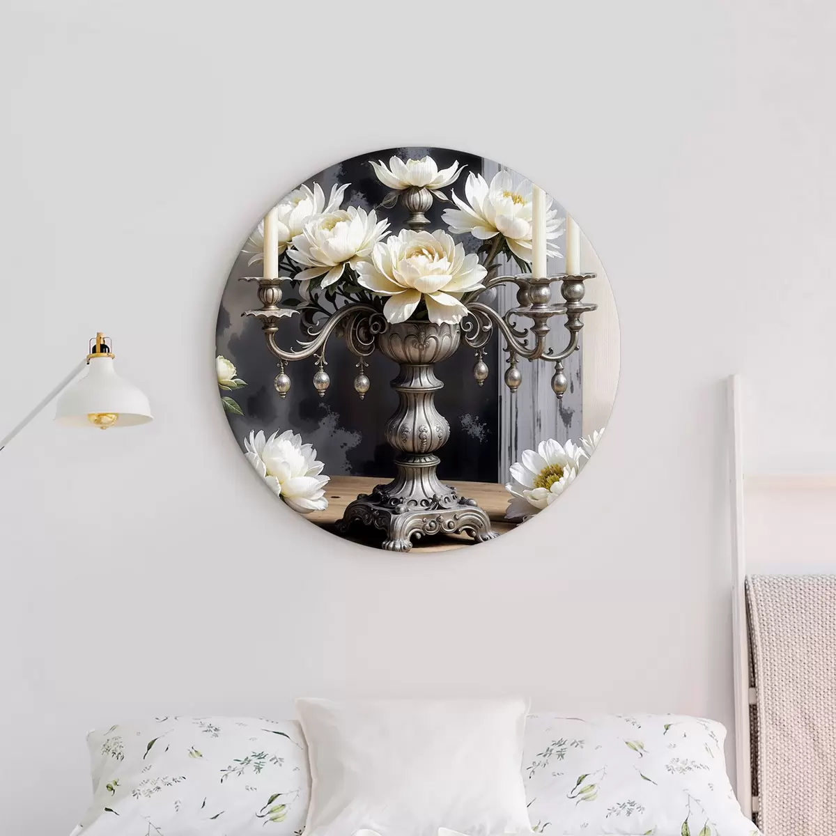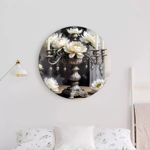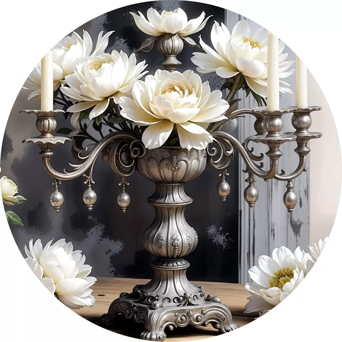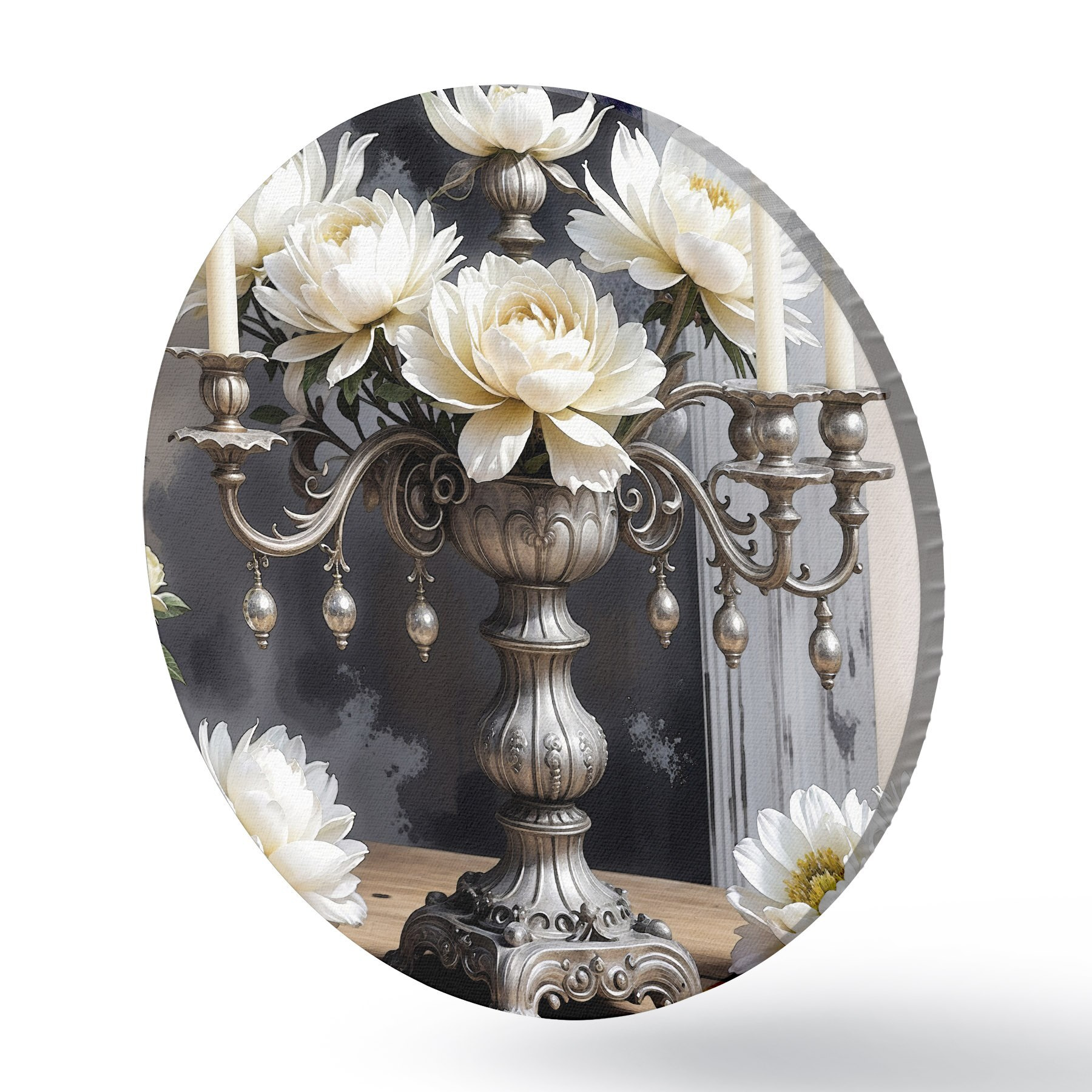 Runde Gemälde Ein Strauß großer weißer Dahlienblüten in einer verzierten silbernen Vase, umgeben von brennenden Kerzen auf einem Holztisch r39384