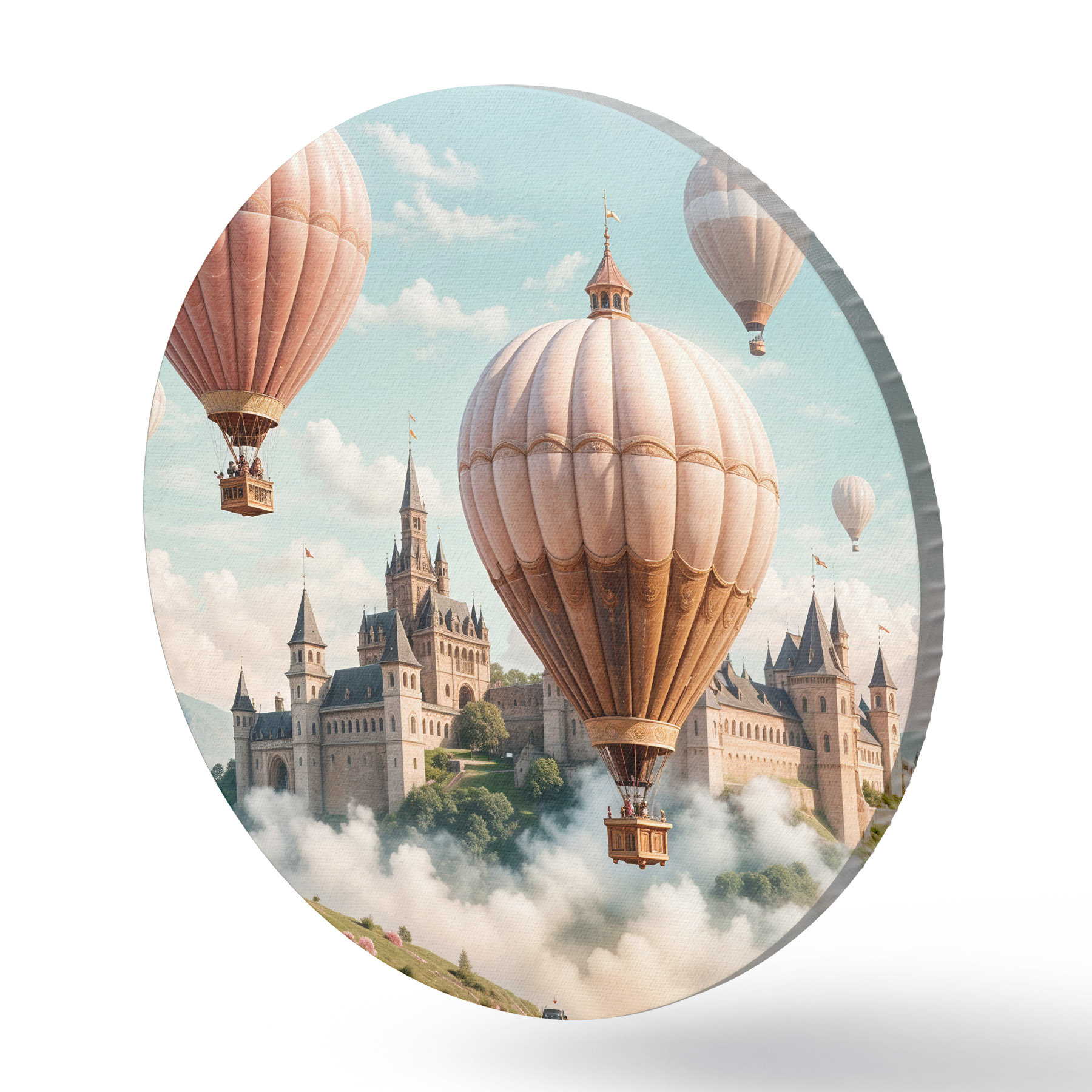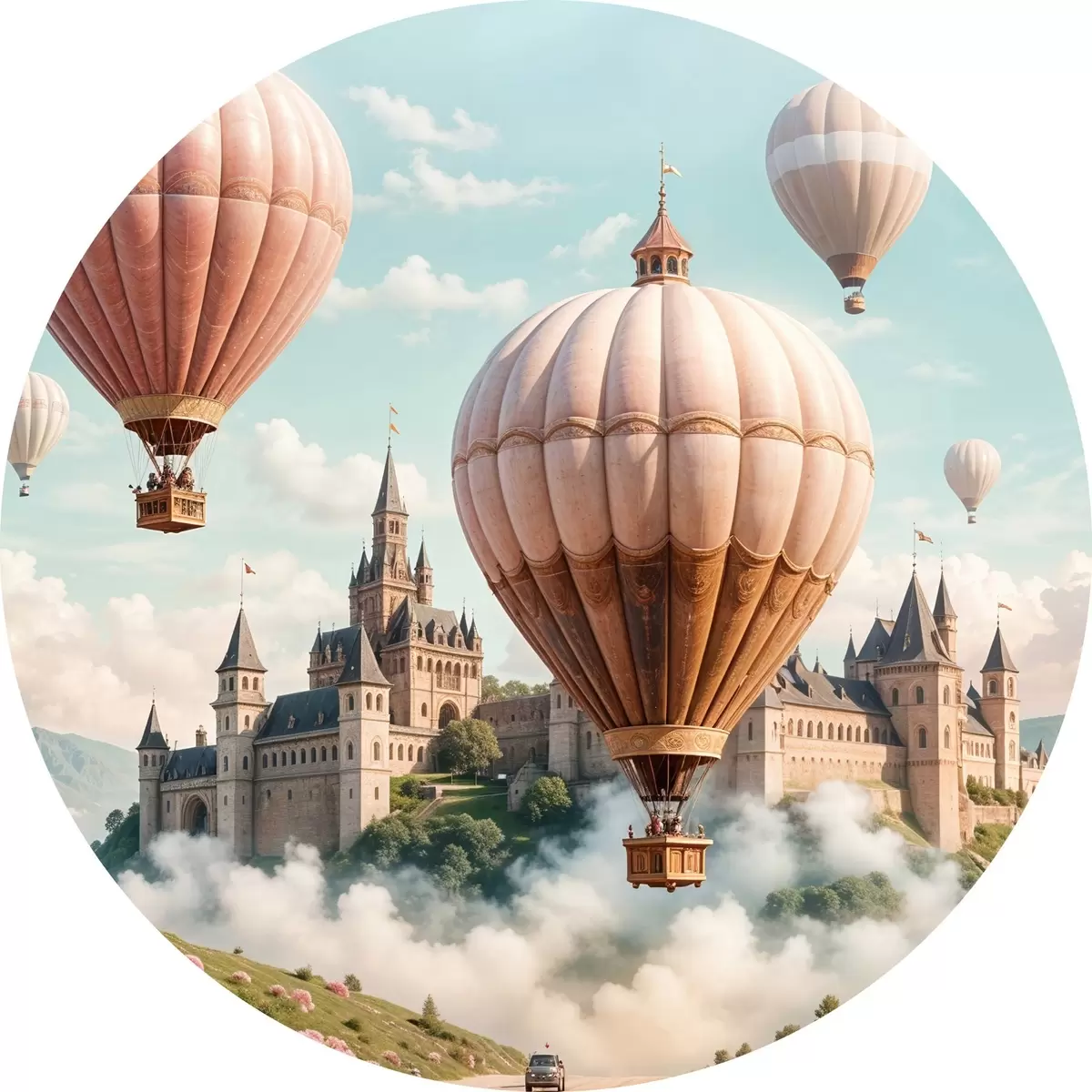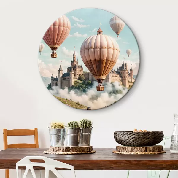 Runde Gemälde Ein Fantasieschloss, umgeben von rosa Heißluftballons, die in einem wolkigen Himmel über einer üppigen, grünen Landschaft schweben r39387