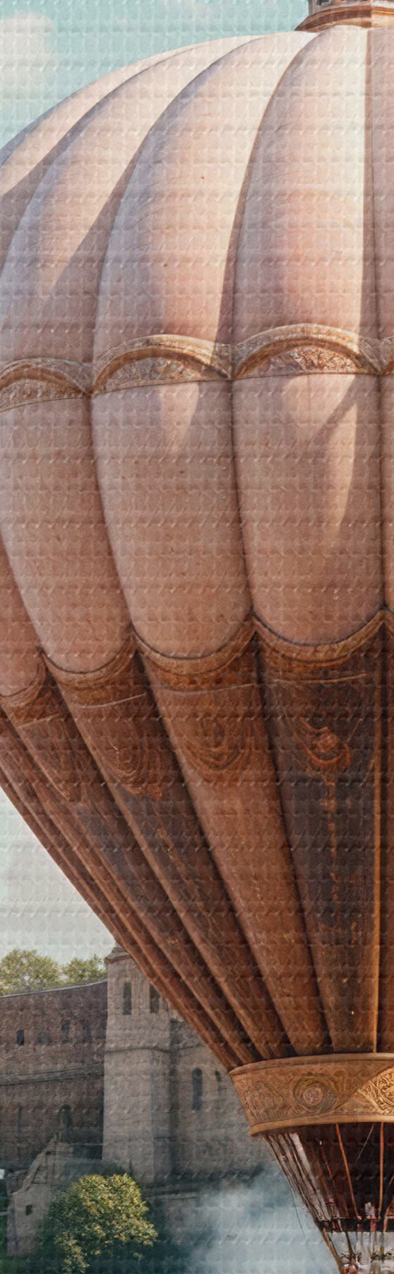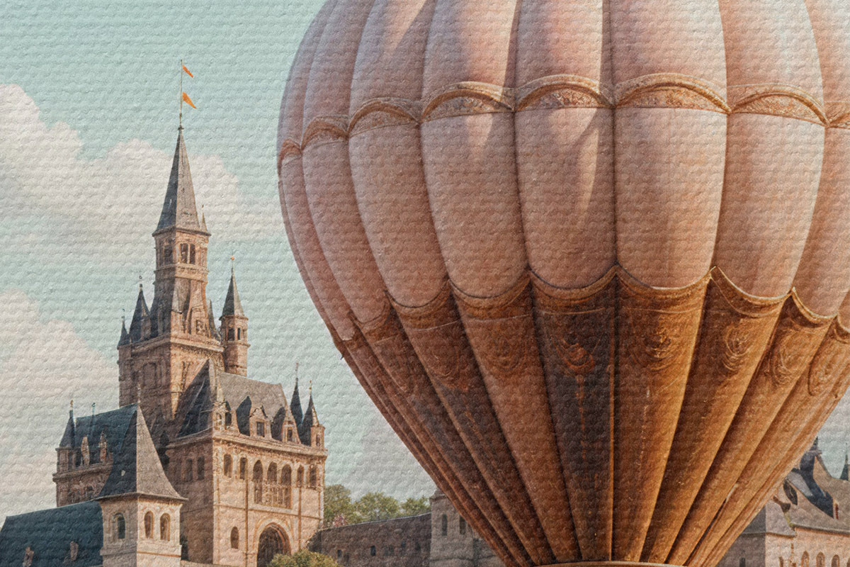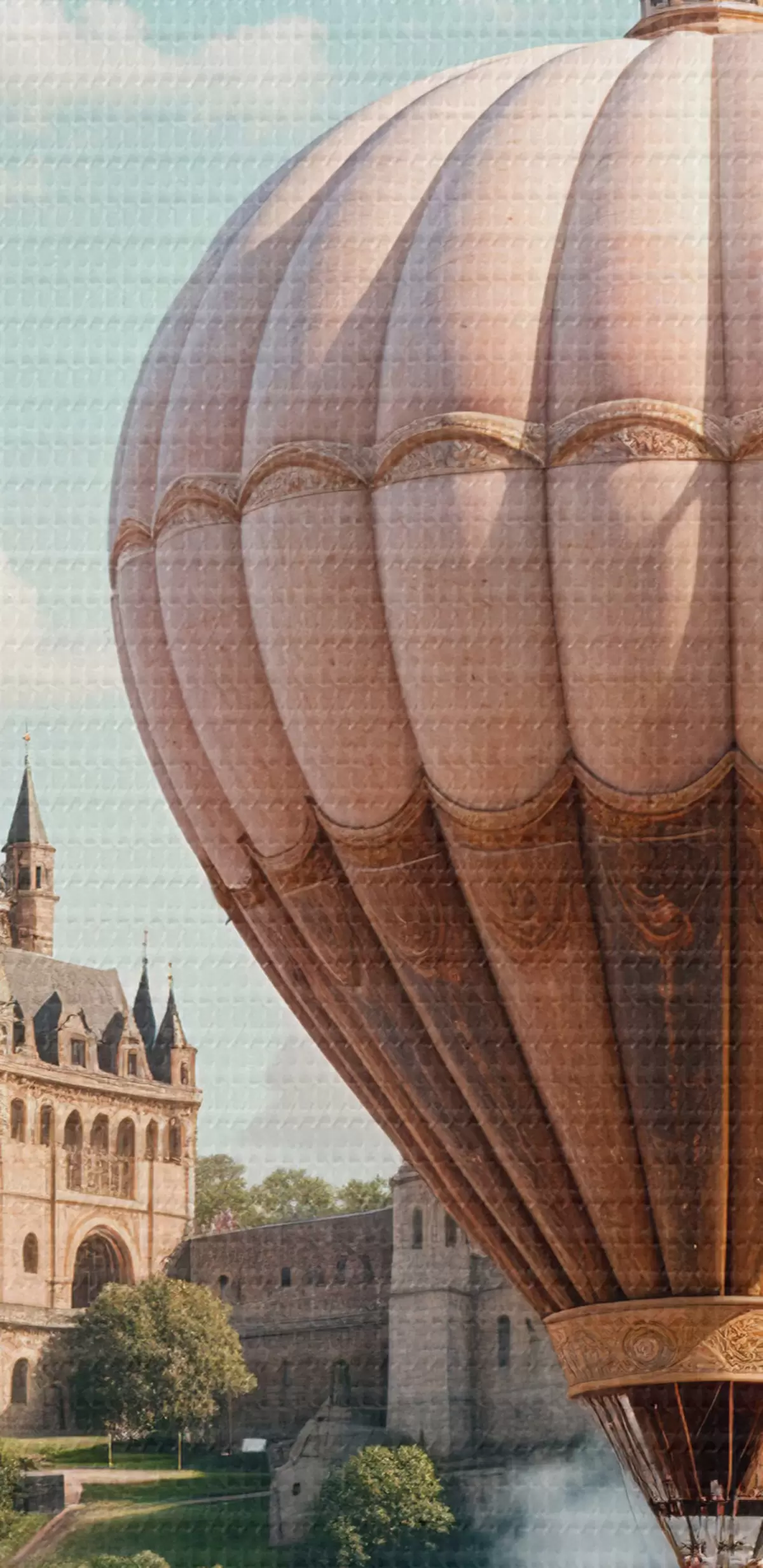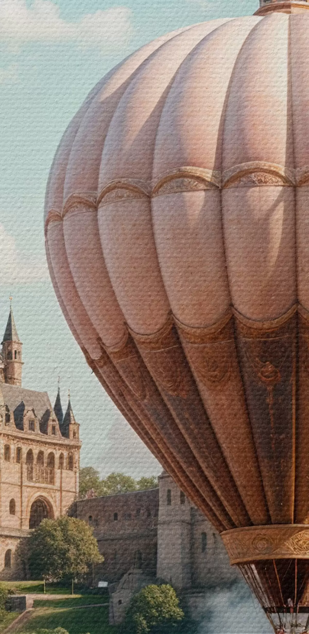 Bild Ein Fantasieschloss, umgeben von rosa Heißluftballons, die in einem wolkigen Himmel über einer üppigen, grünen Landschaft schweben Nr r39387
